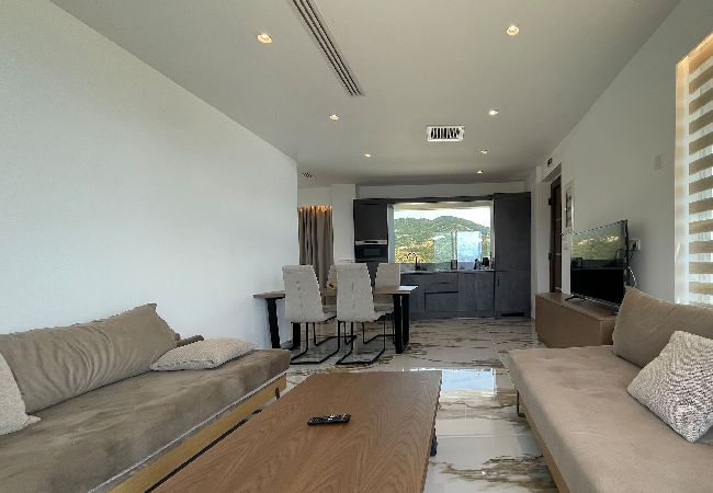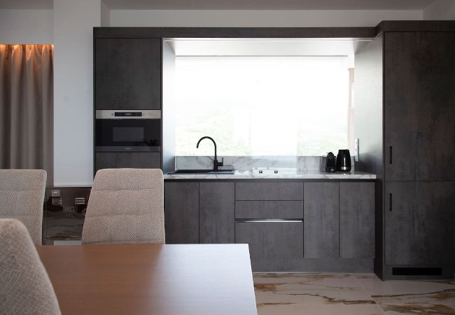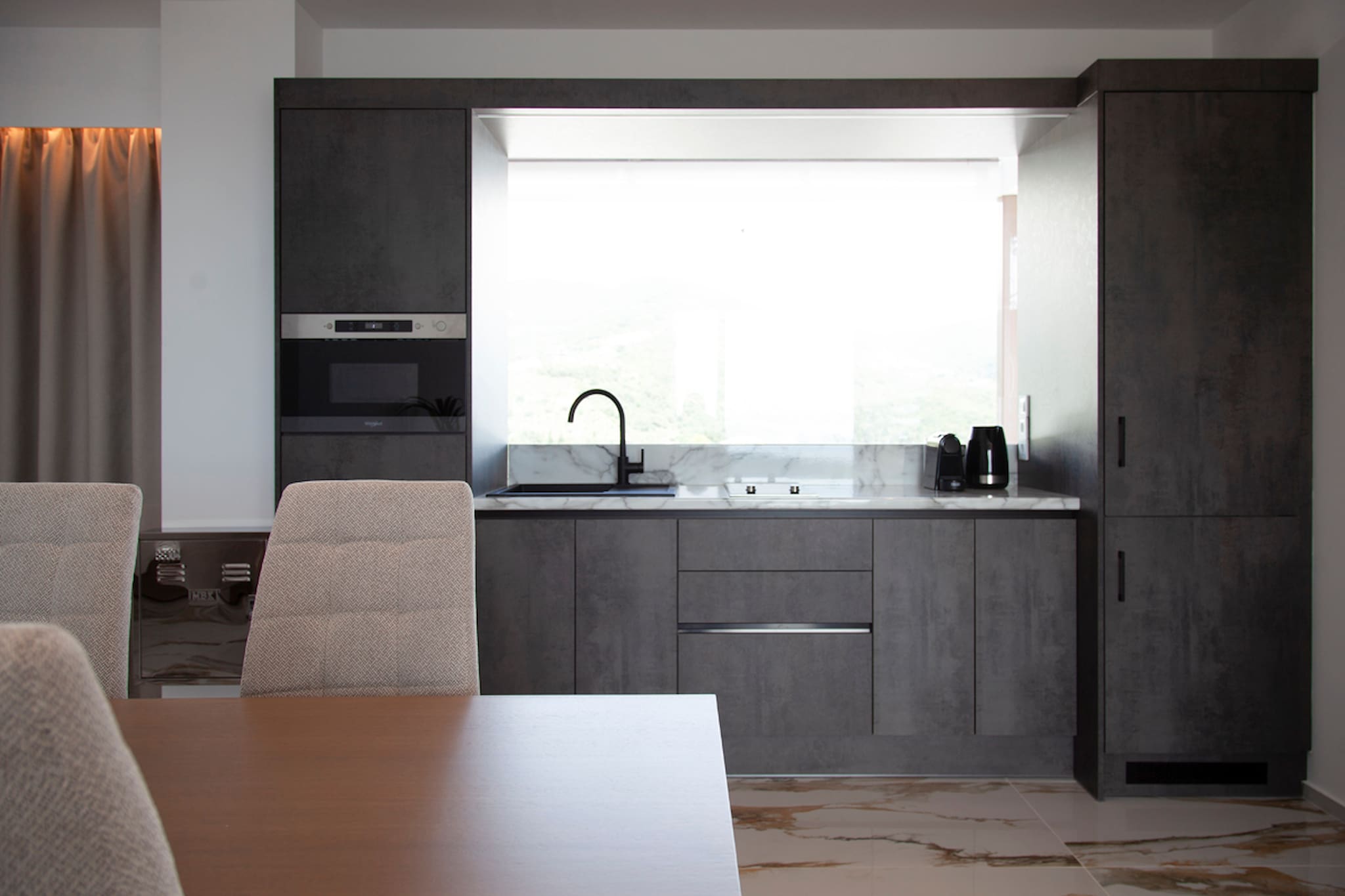 The modern chic interior design is an extension you will experience and feel with the quality and comfort of the outdoor furniture at Zavia Penthouse. The outdoor area comprises of gardens across the property, aromatic plants shrubs and the big crystal blue of the Ionian Sea with passing yachts in the background, creating a dream setting for everyone to find their own private corner, but more importantly to create those memorable moments together with your friends and family.