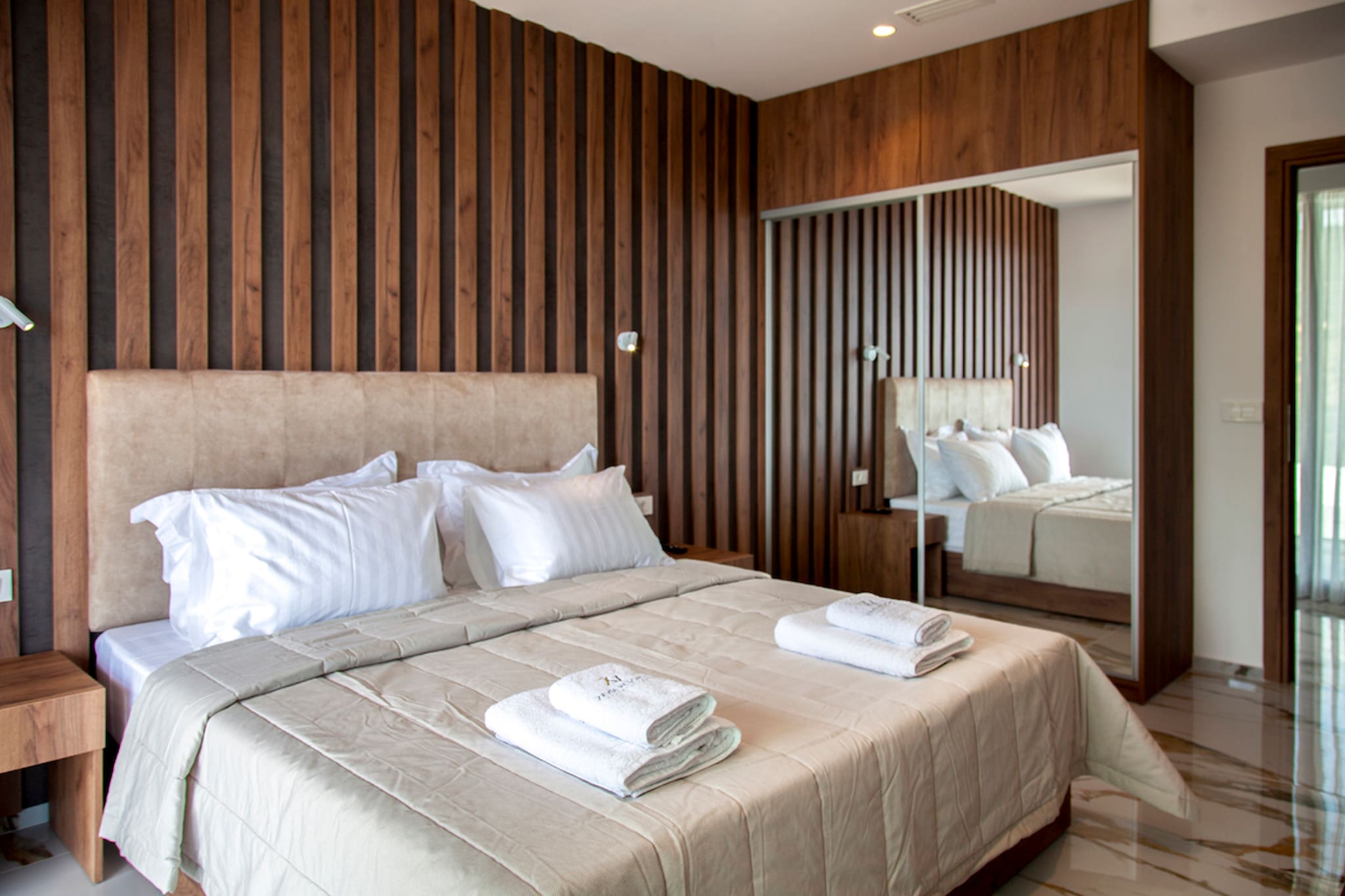 Moving on, you will find the two bedrooms on this level of the accommodation consisting of and offering quality and comfort with a double bed setting and the easy access to the outdoor panoramic balcony with breathtaking views of Zavia Penthouse. The two-family bathroom with shower is right next to the bedrooms for the convenience of the guests staying.