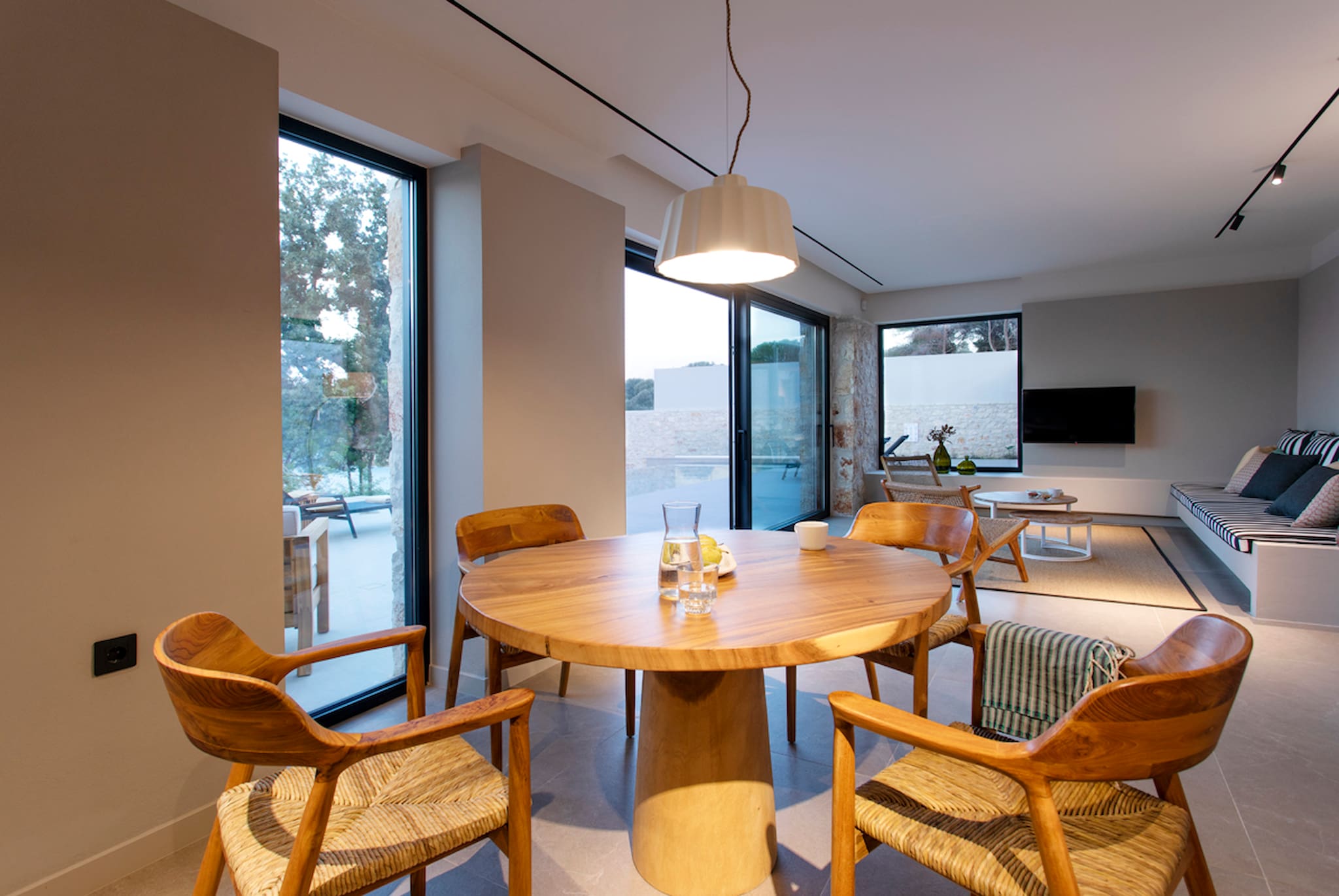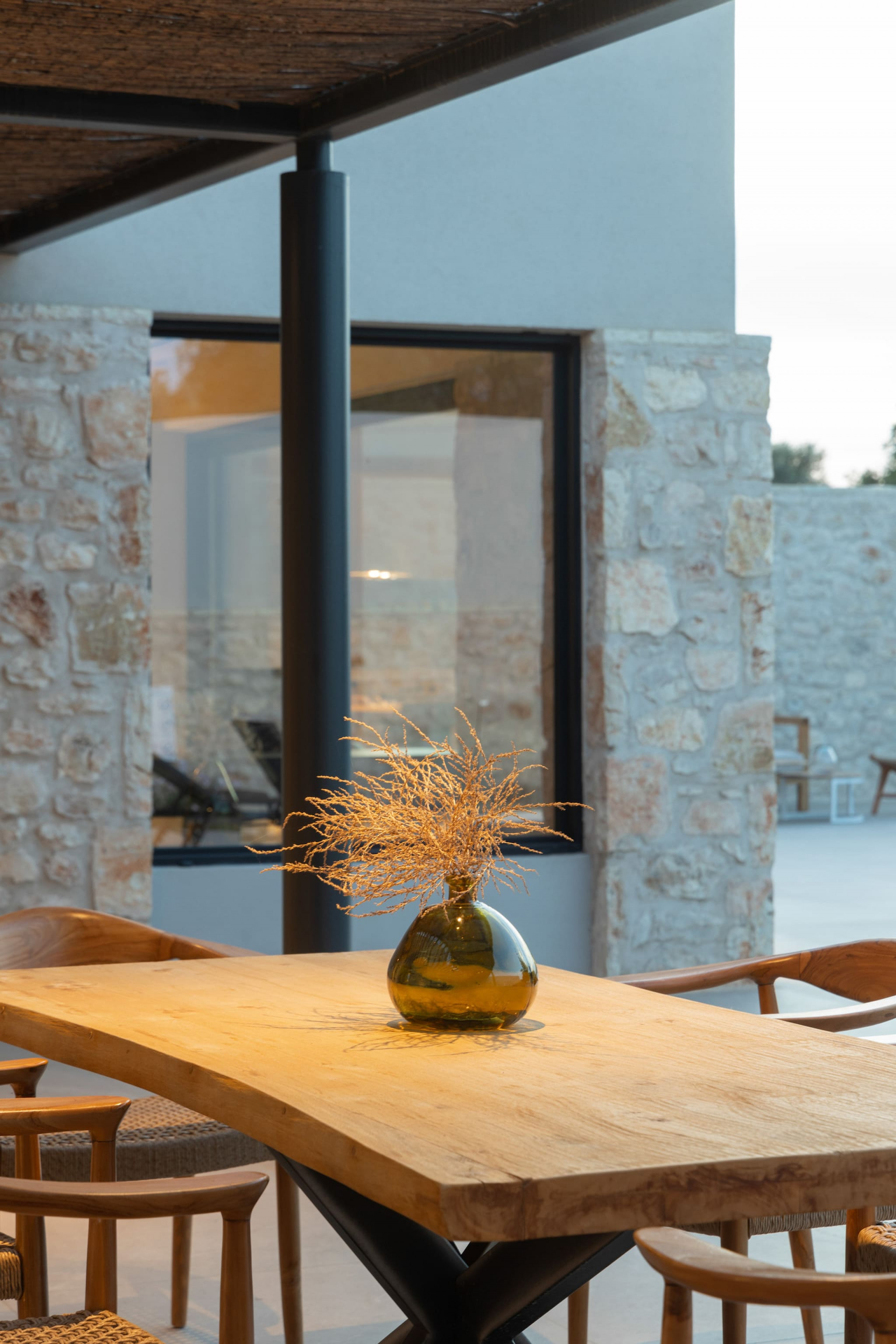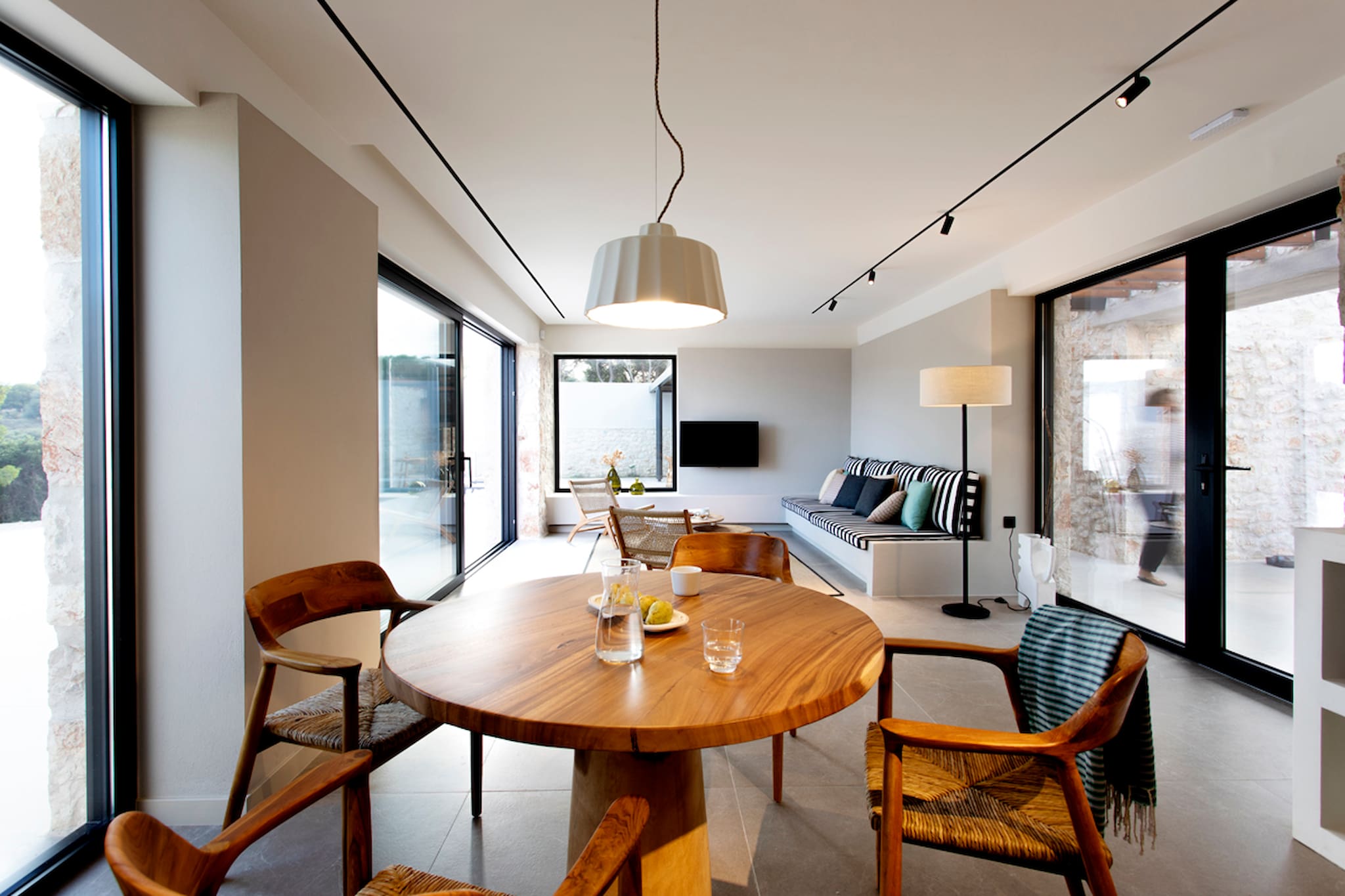 The main building of Villa Dafni, with its open contemporary concept design and sliding window doors, gives this space a luminous summer feeling, filling the space with natural sunlight throughout the day. Using traditional elements and lines, the kitchen integrates with the dining island setting. It breathes the essence of traditional design with the modern touch of modern facilities. To the front of this space is traditionally built lounge setting, with touches of boho accessories and the open floor to ceiling sliding windows creates the stunning indoor-outdoor experience with the outdoor grounds and the crystal blue waters.