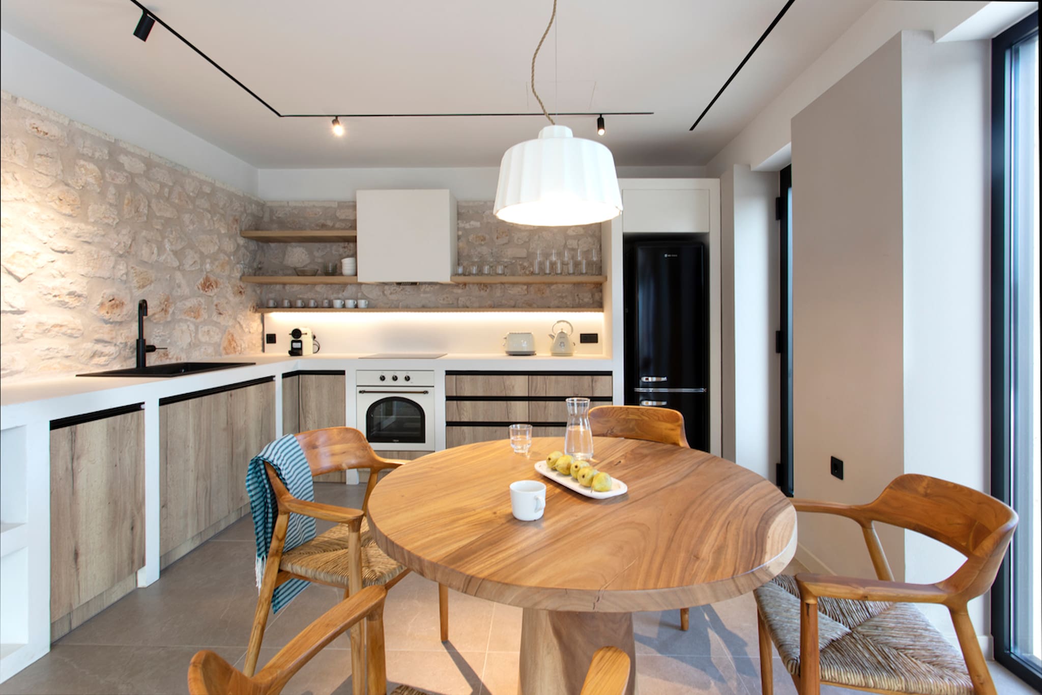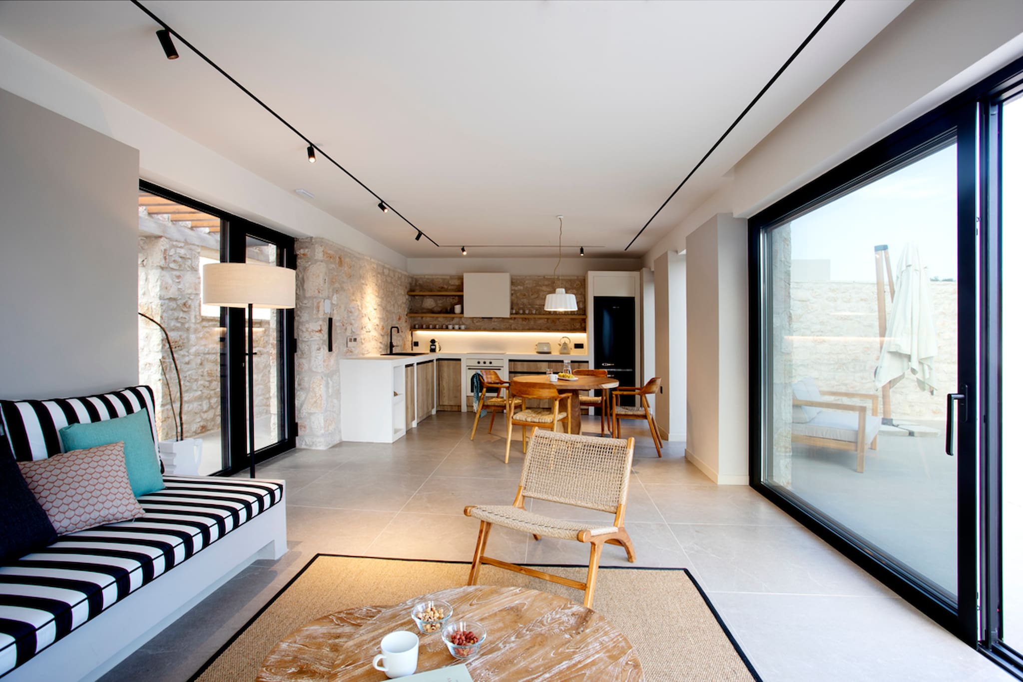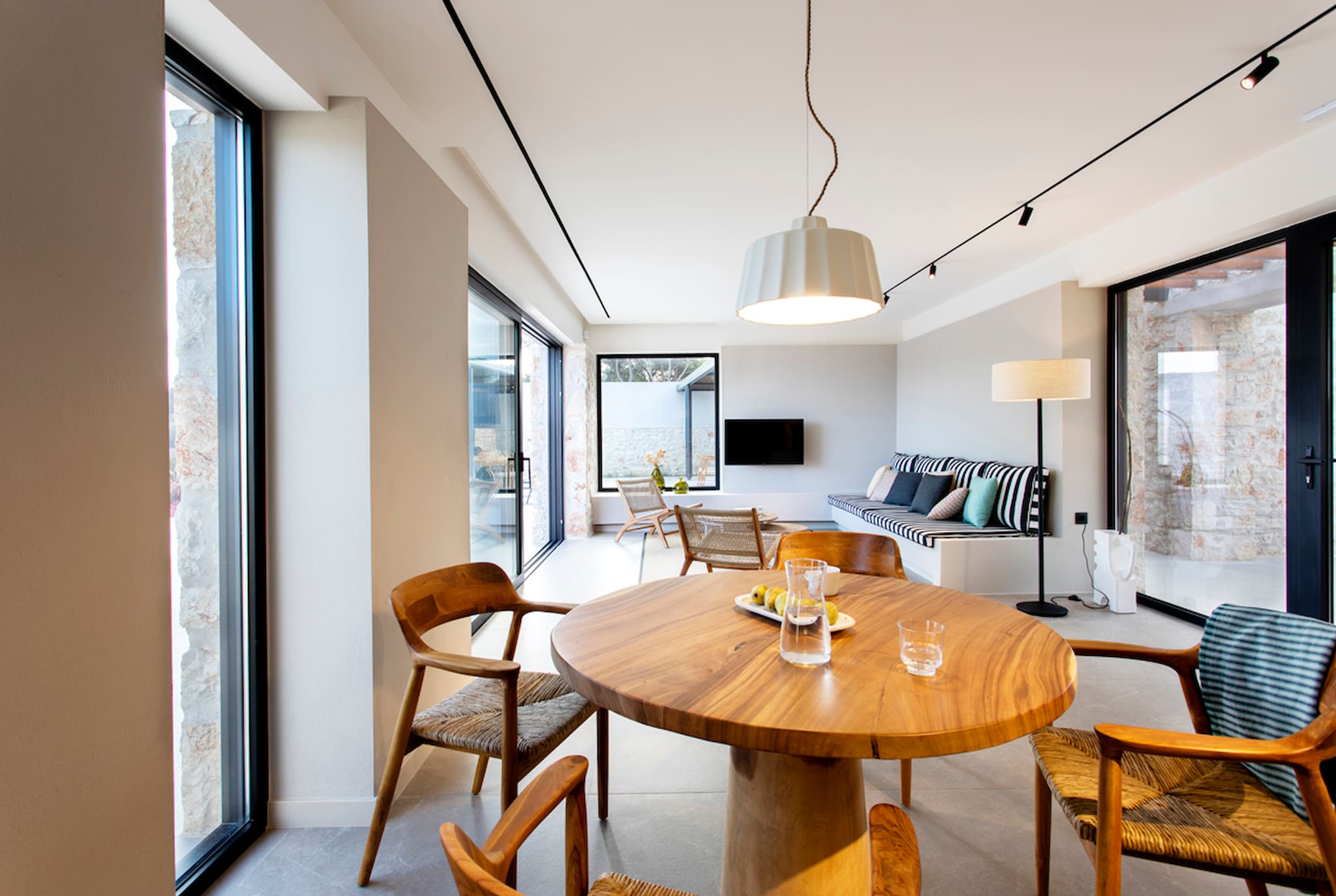 The main building of Villa Dafni, with its open contemporary concept design and sliding window doors, gives this space a luminous summer feeling, filling the space with natural sunlight throughout the day. Using traditional elements and lines, the kitchen integrates with the dining island setting. It breathes the essence of traditional design with the modern touch of modern facilities. To the front of this space is traditionally built lounge setting, with touches of boho accessories and the open floor to ceiling sliding windows creates the stunning indoor-outdoor experience with the outdoor grounds and the crystal blue waters.