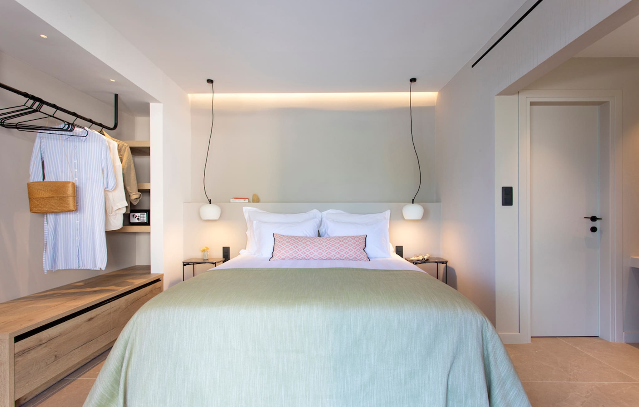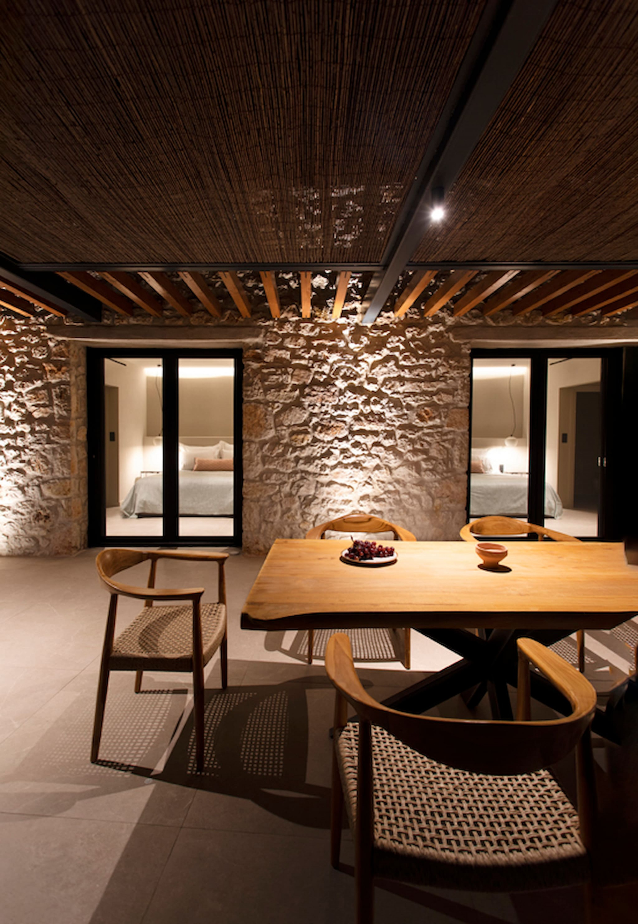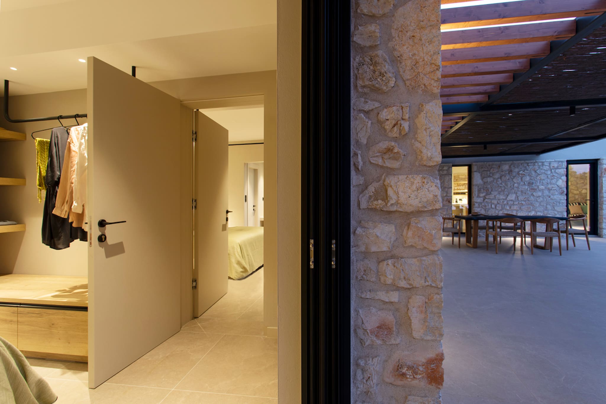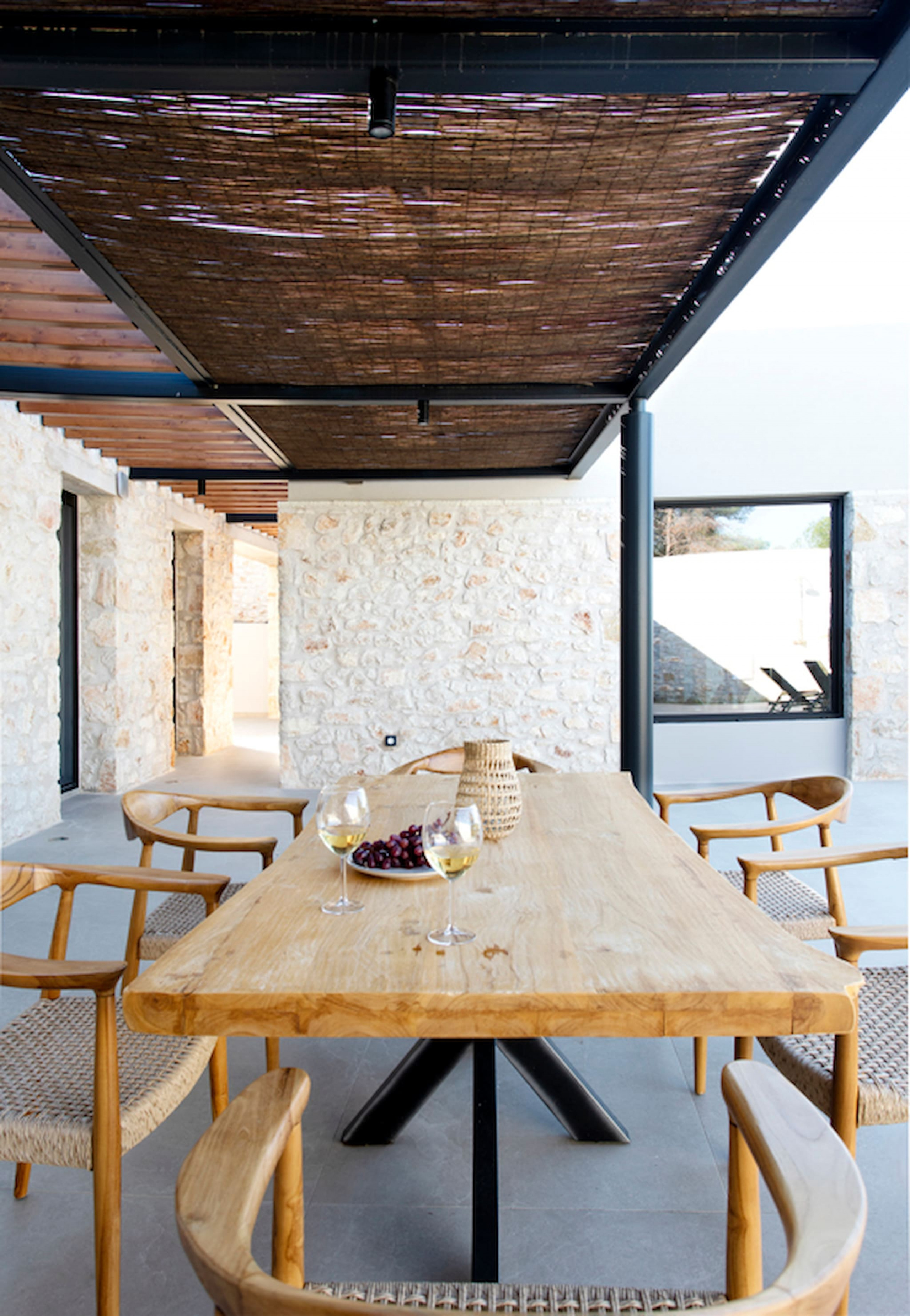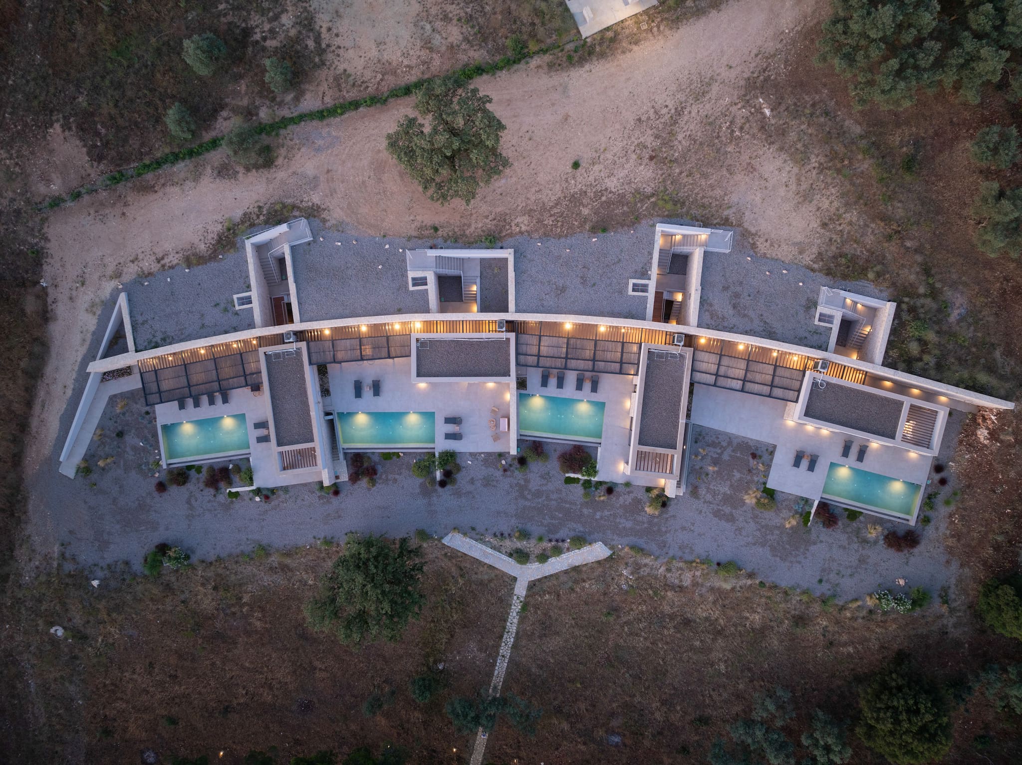 The multi-dimensional architecture of two independent building blocks, wrap around the terraces of each building with wooden beamed pergolas, creating a soothing indoor-outdoor synergy that you would expect from your summer holiday accommodation in Greece.
