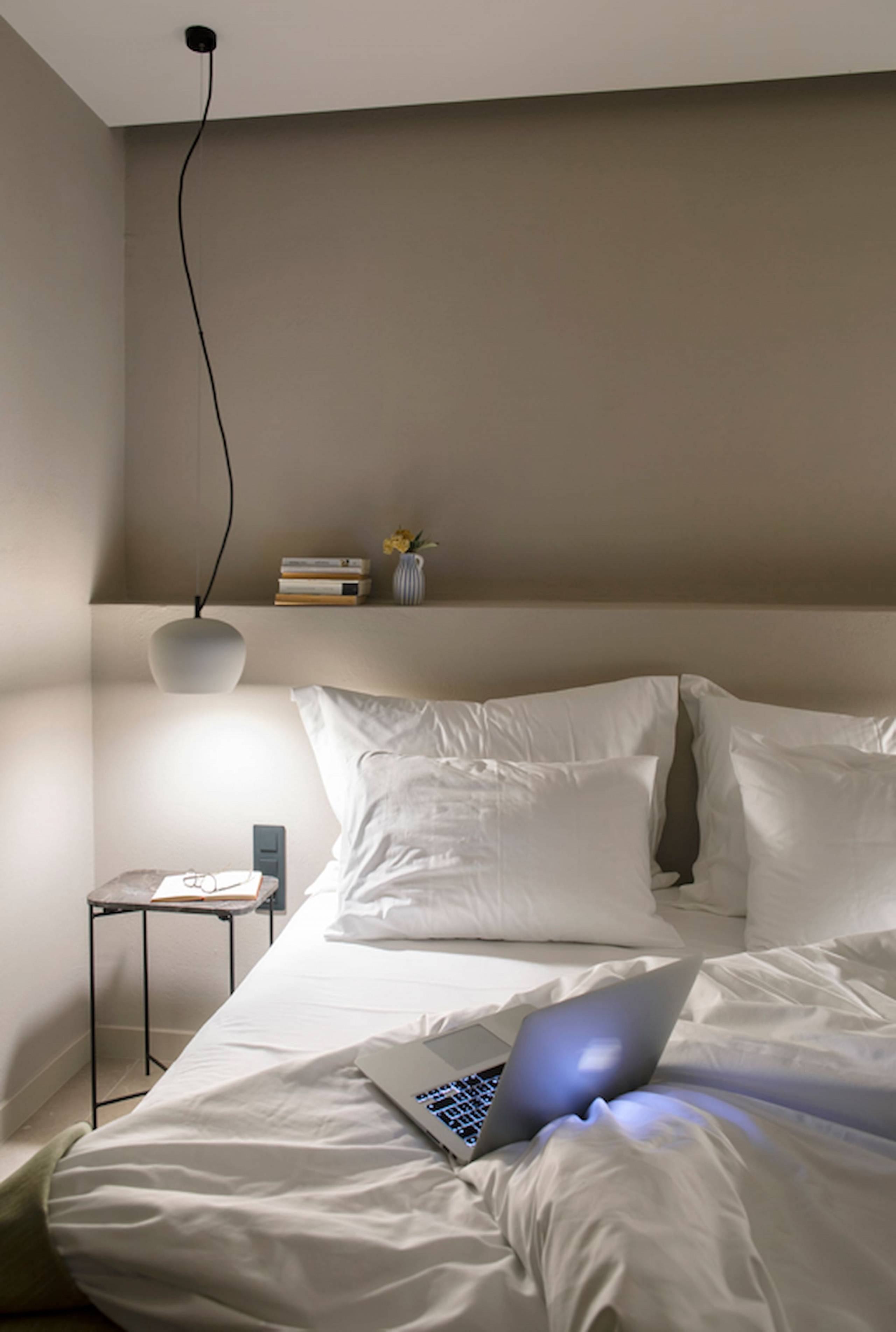 Modern and vintage furnishings in soothing beige and white tones outfit the open-plan living area and the independently accessed bedrooms