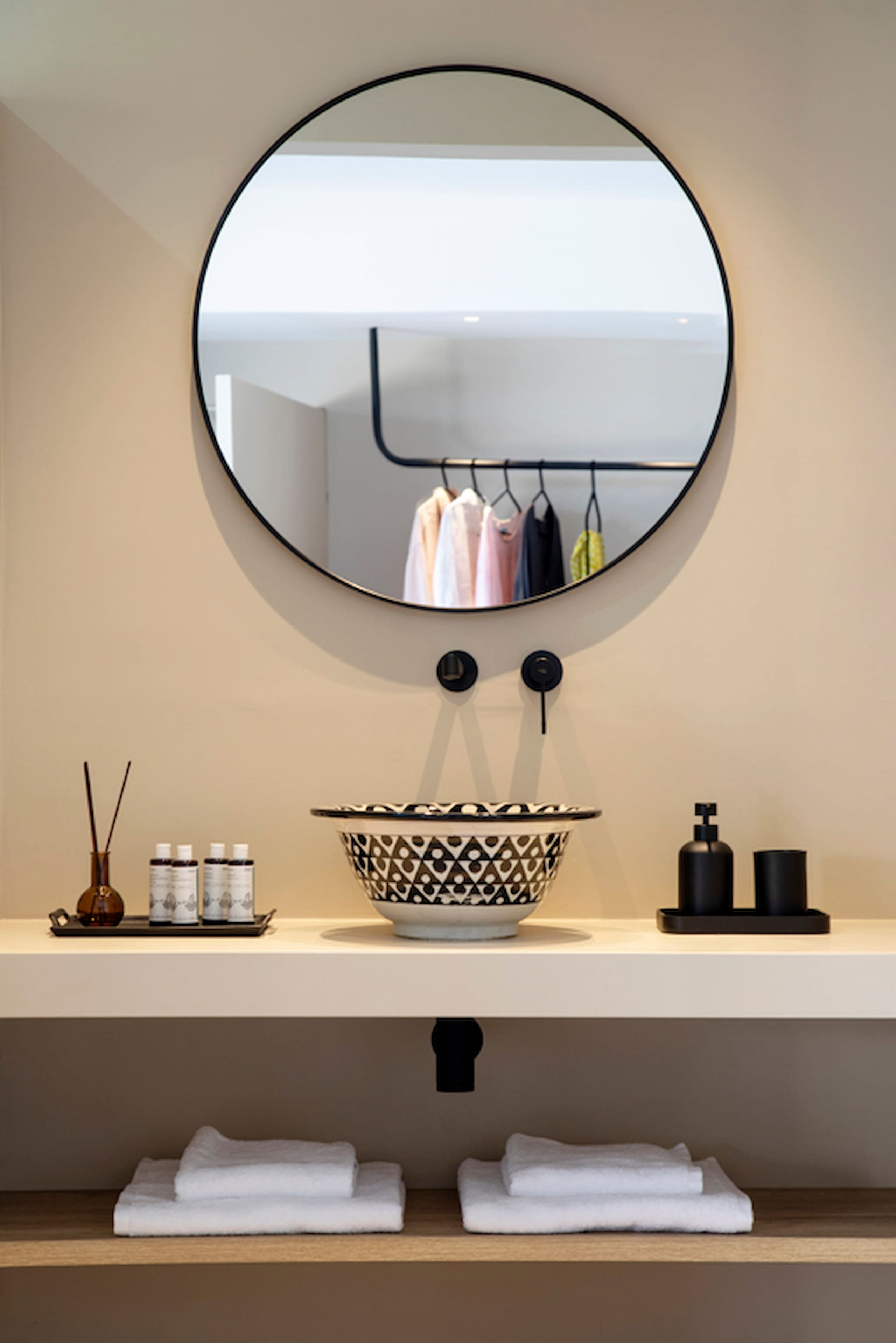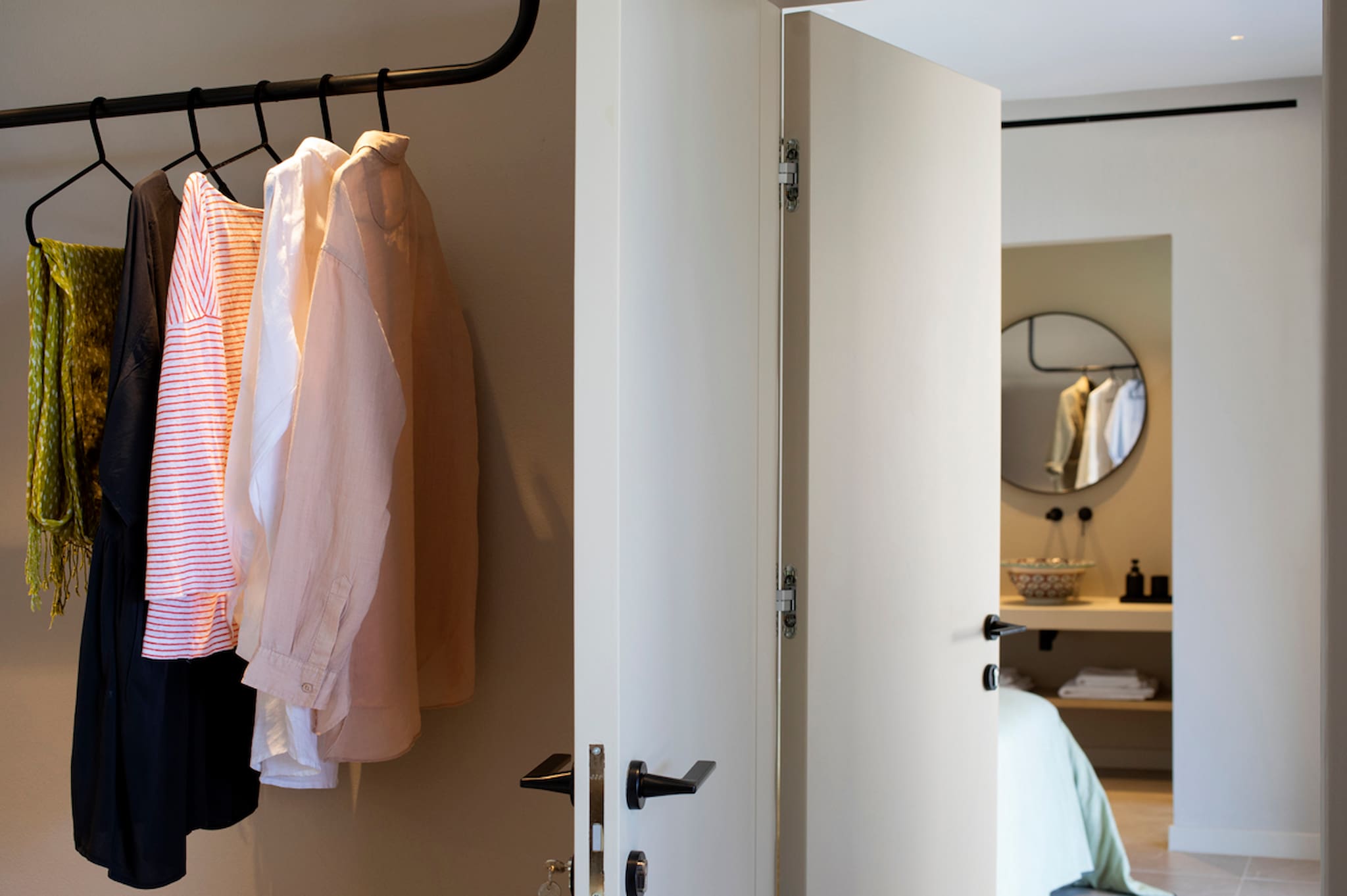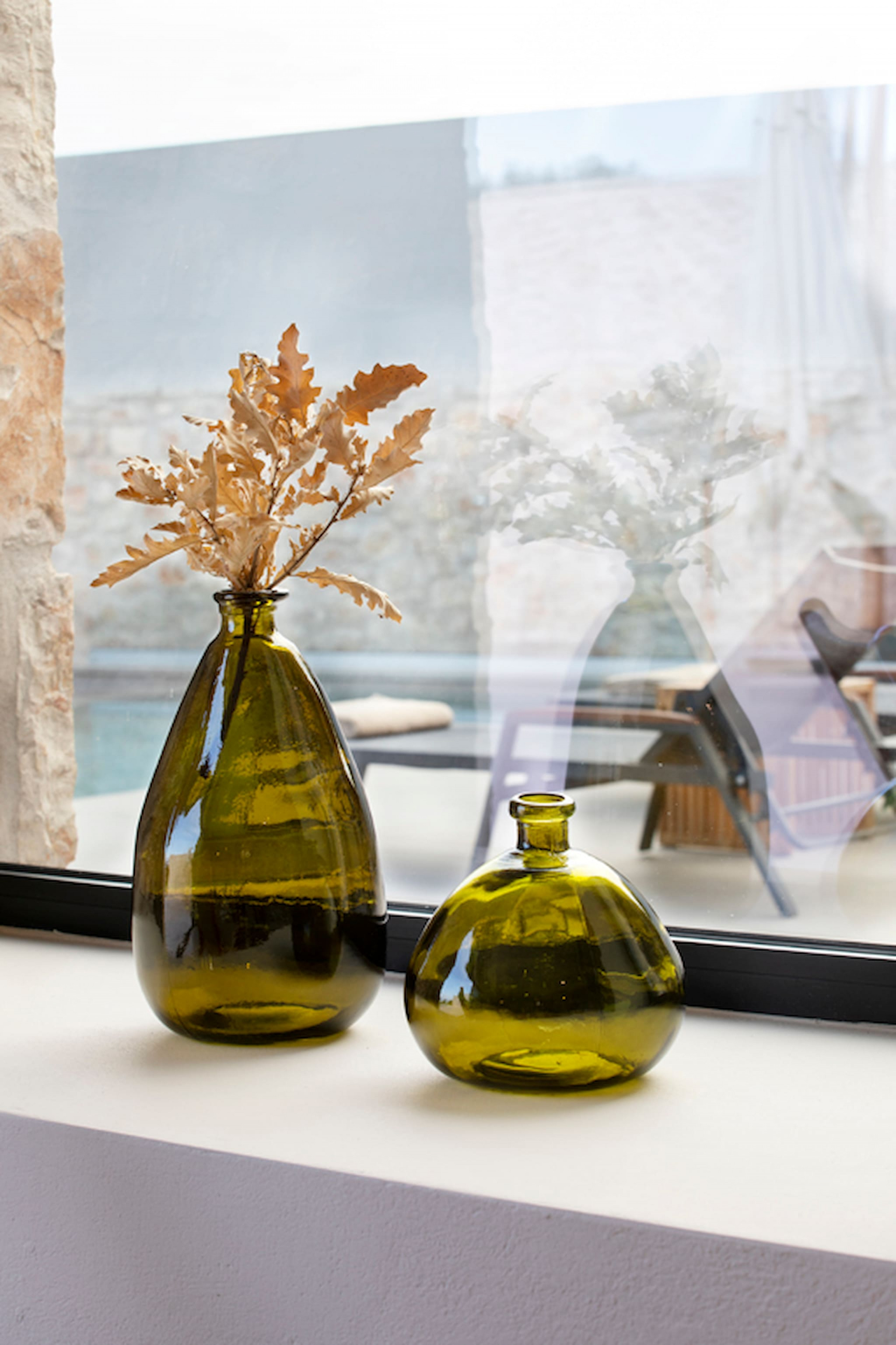 The second cubist building of Villa Aloe that is accessed externally from the open outdoor area consists of three bedrooms. Two bedrooms are accessed directly from the pool area. The warm and comfortable feel with cool cream walls and light-coloured furnishings with direct access to the outdoor grounds of the property, is the amazing experience of village style living in Greece. These two bedrooms are equipped with double beds and ensuite bathrooms with shower. On the same level there is an extra bathroom with a shower. The third bedroom of the accommodation has outdoor access on the lower level of the second building, equipped with twin beds, ensuite bathroom with shower, ideal for children to feel they have their own independent space.