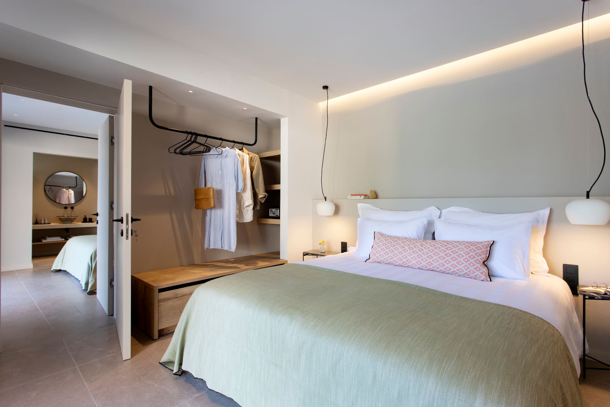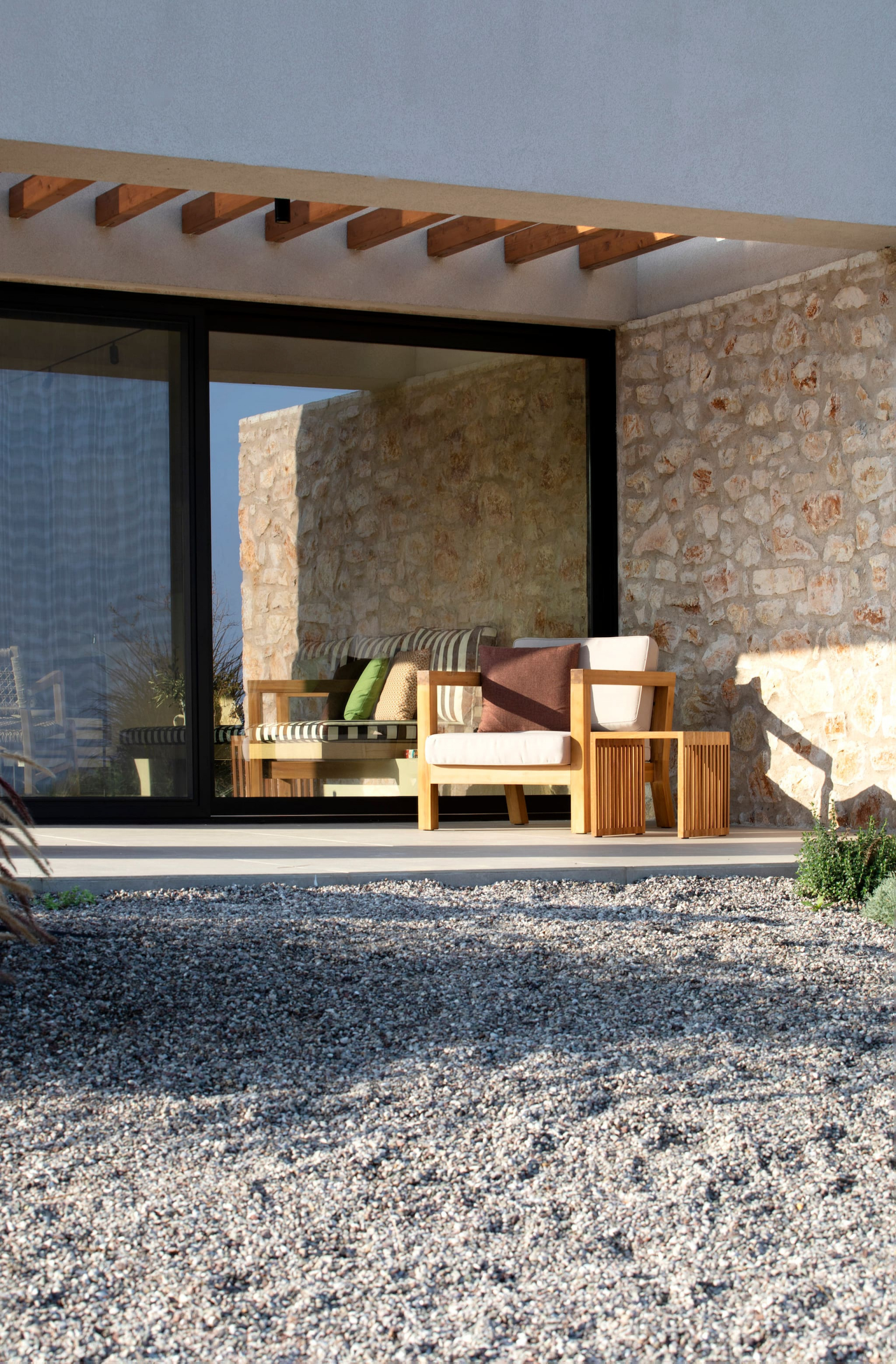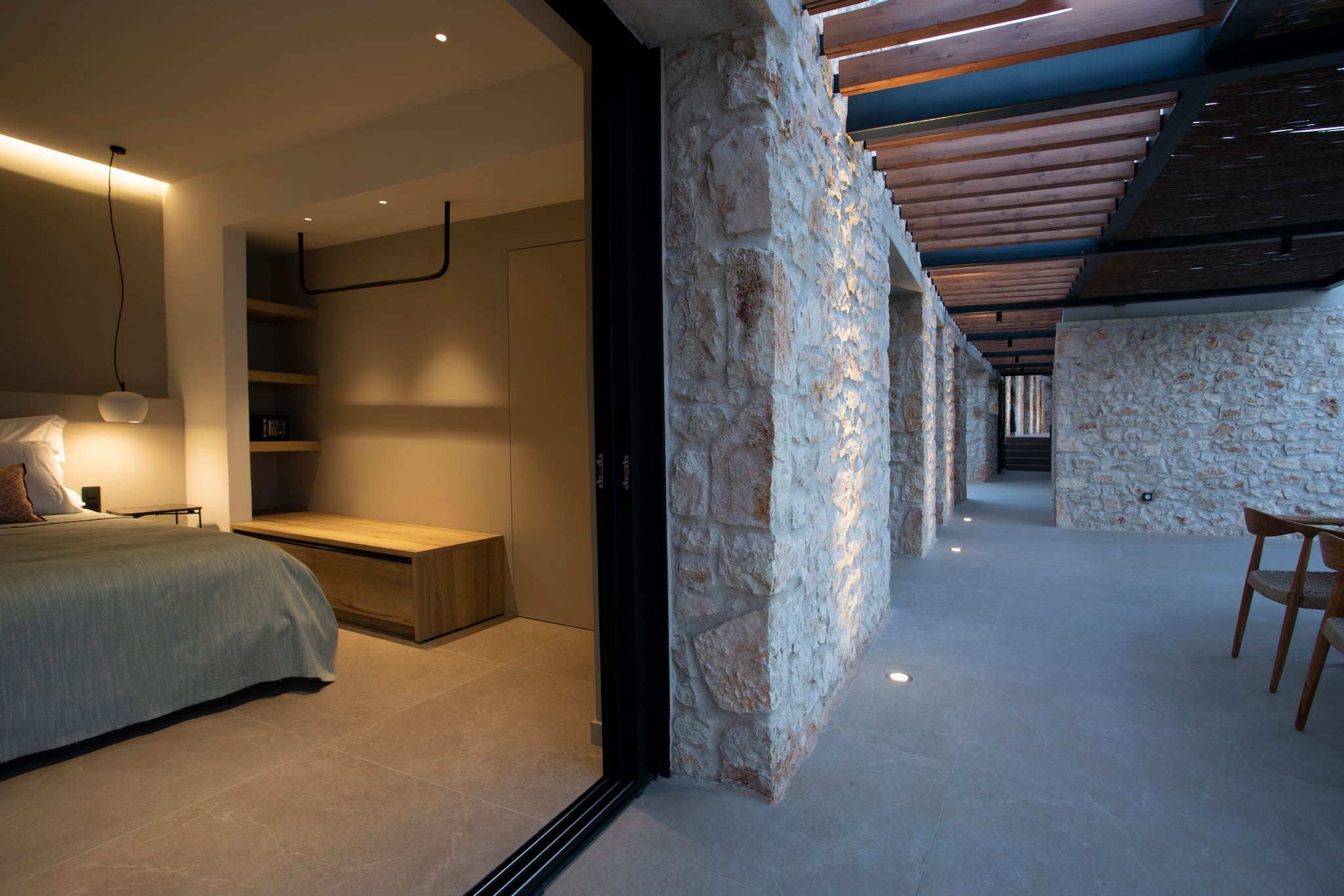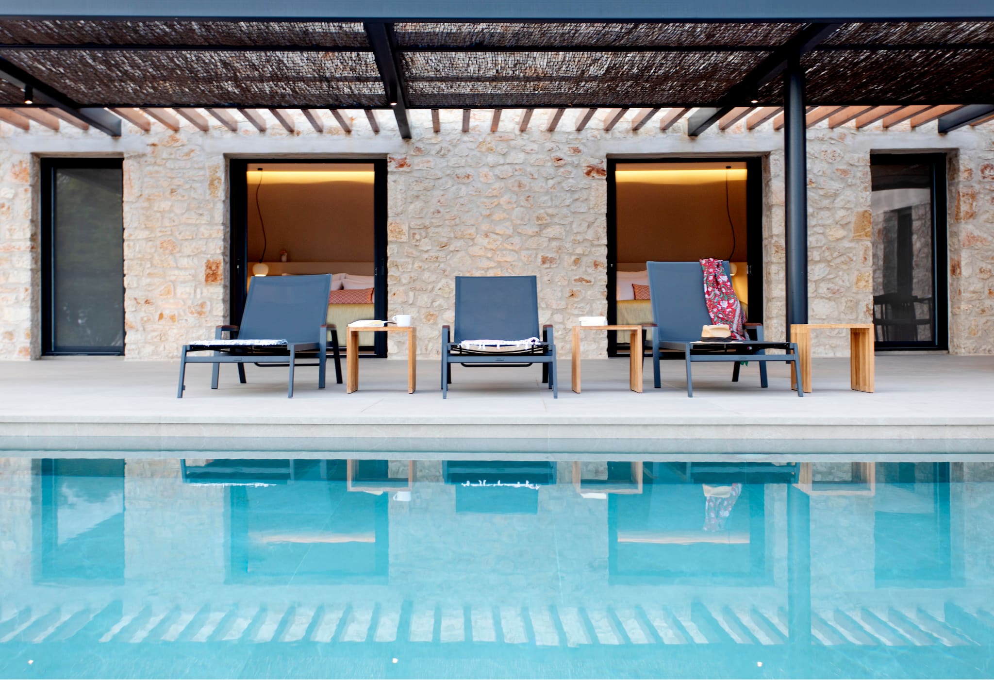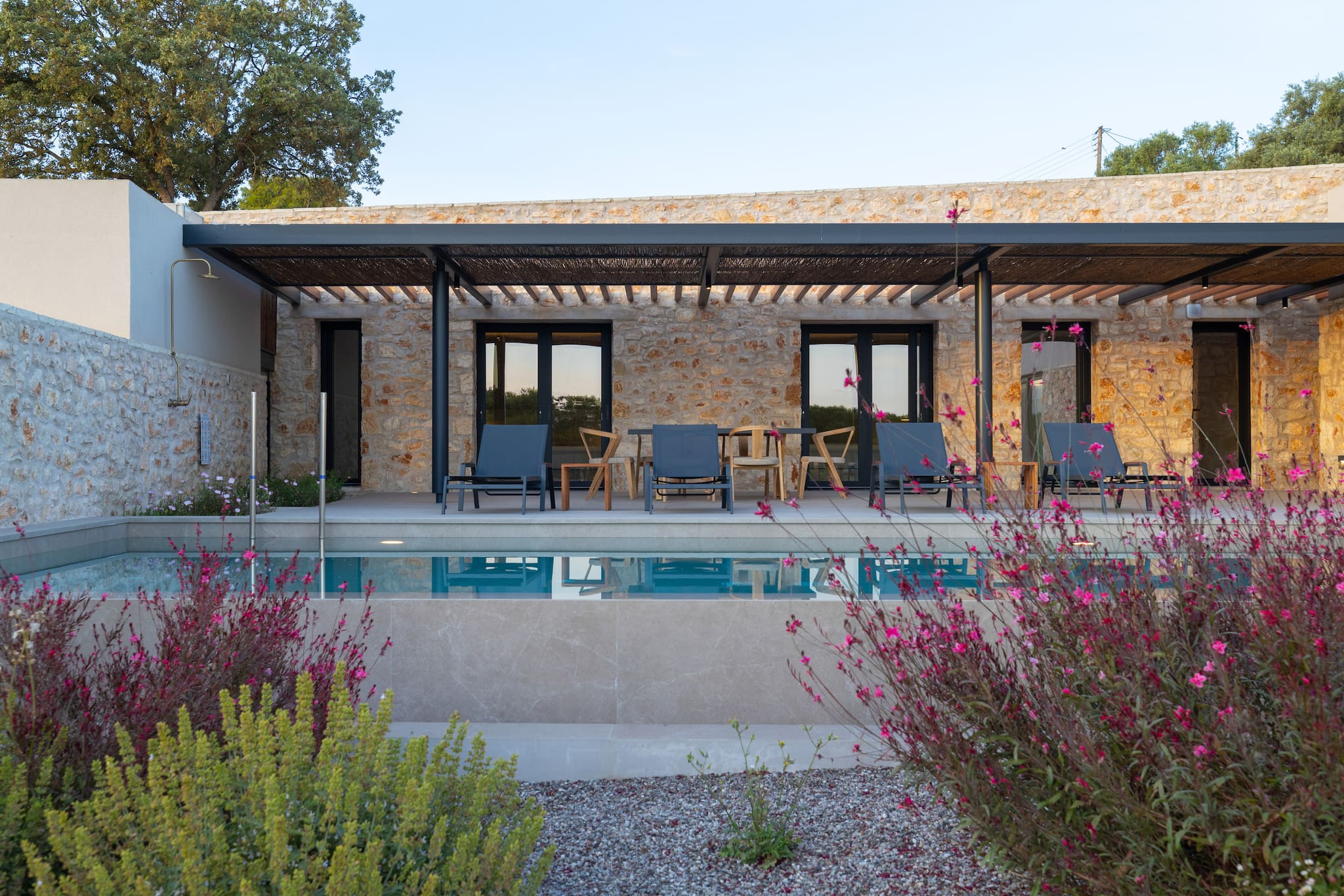 The multi-dimensional architecture of two independent building blocks, wrap around the terraces of each building with wooden beamed pergolas, creating a soothing indoor-outdoor synergy that you would expect from your summer holiday accommodation in Greece.