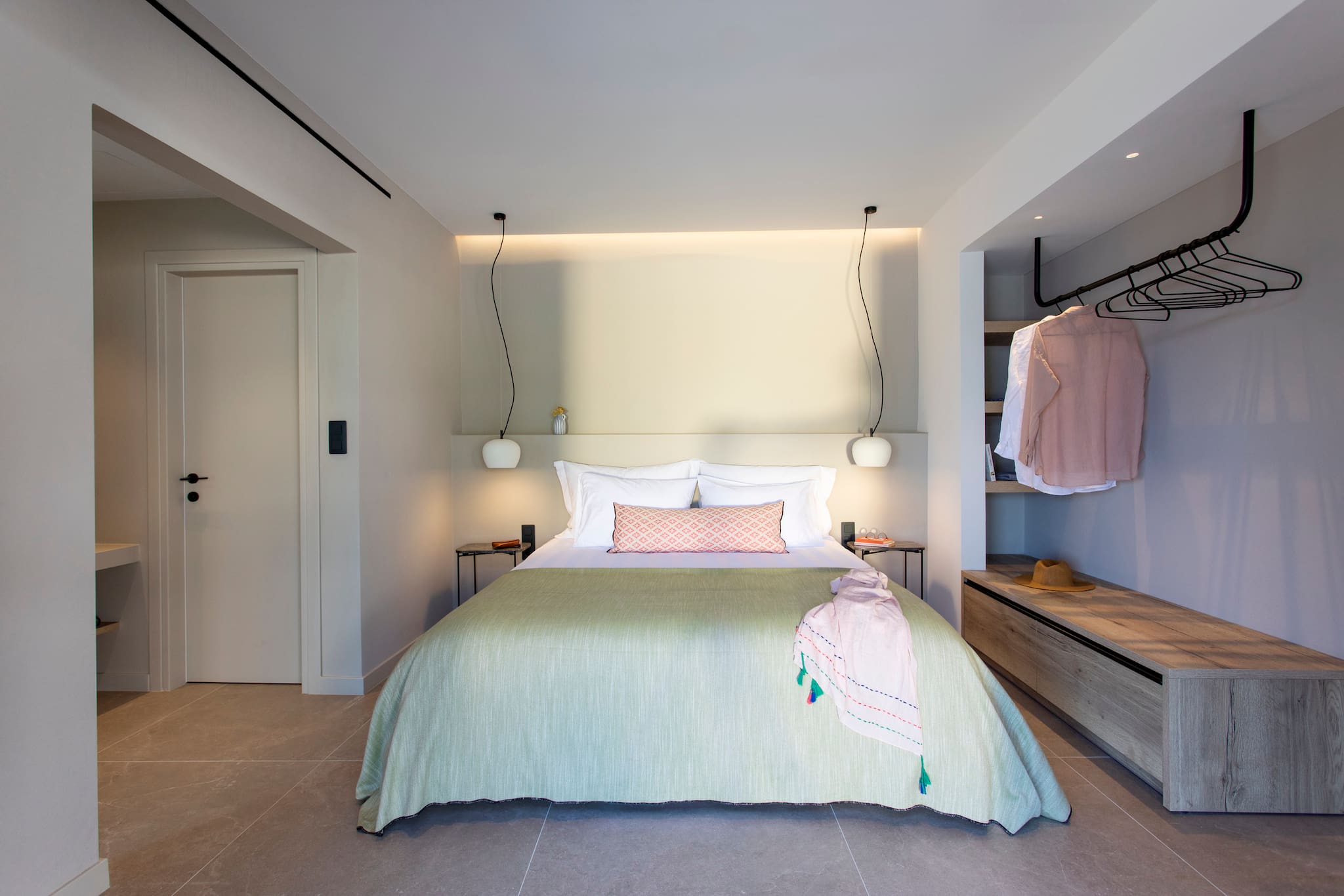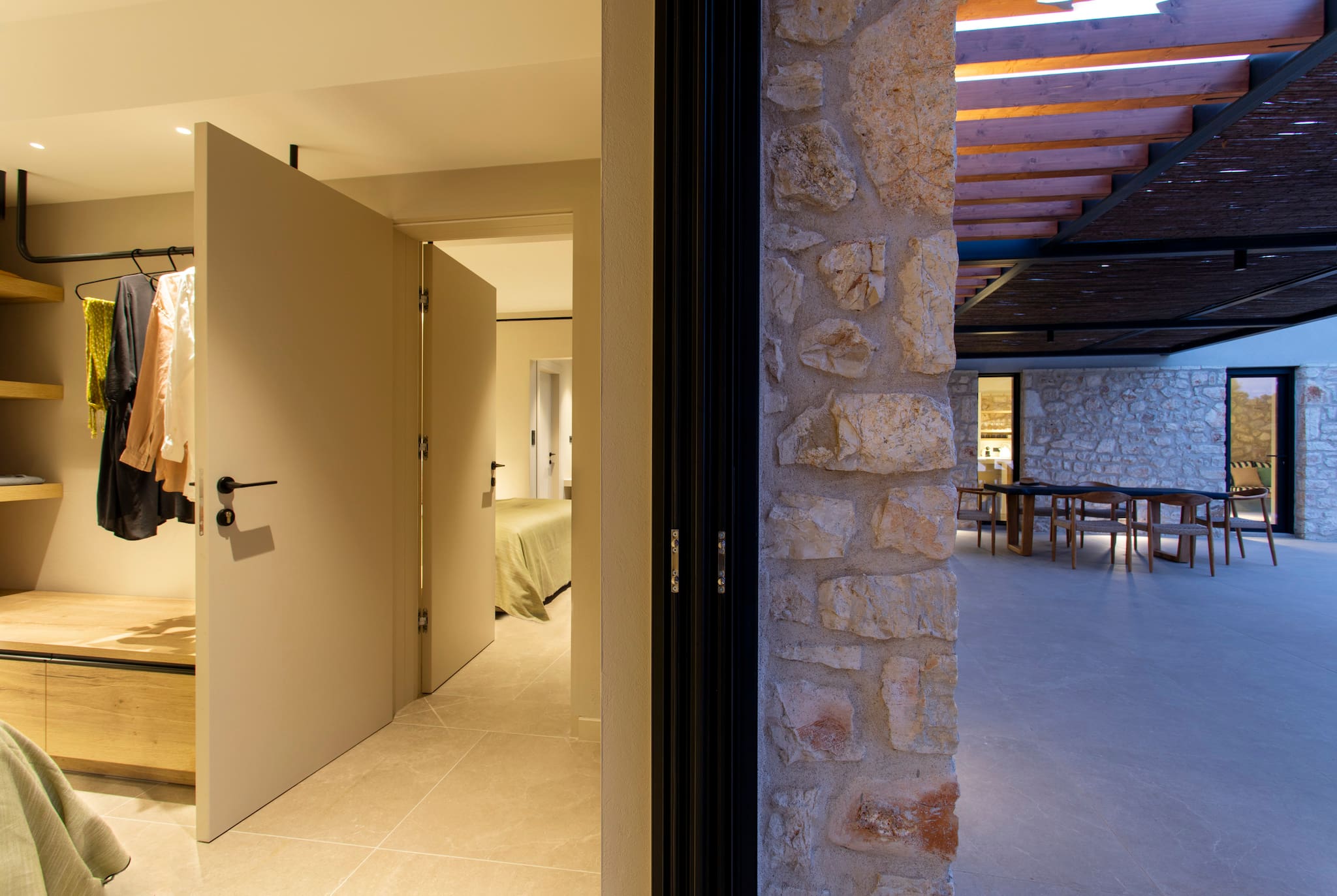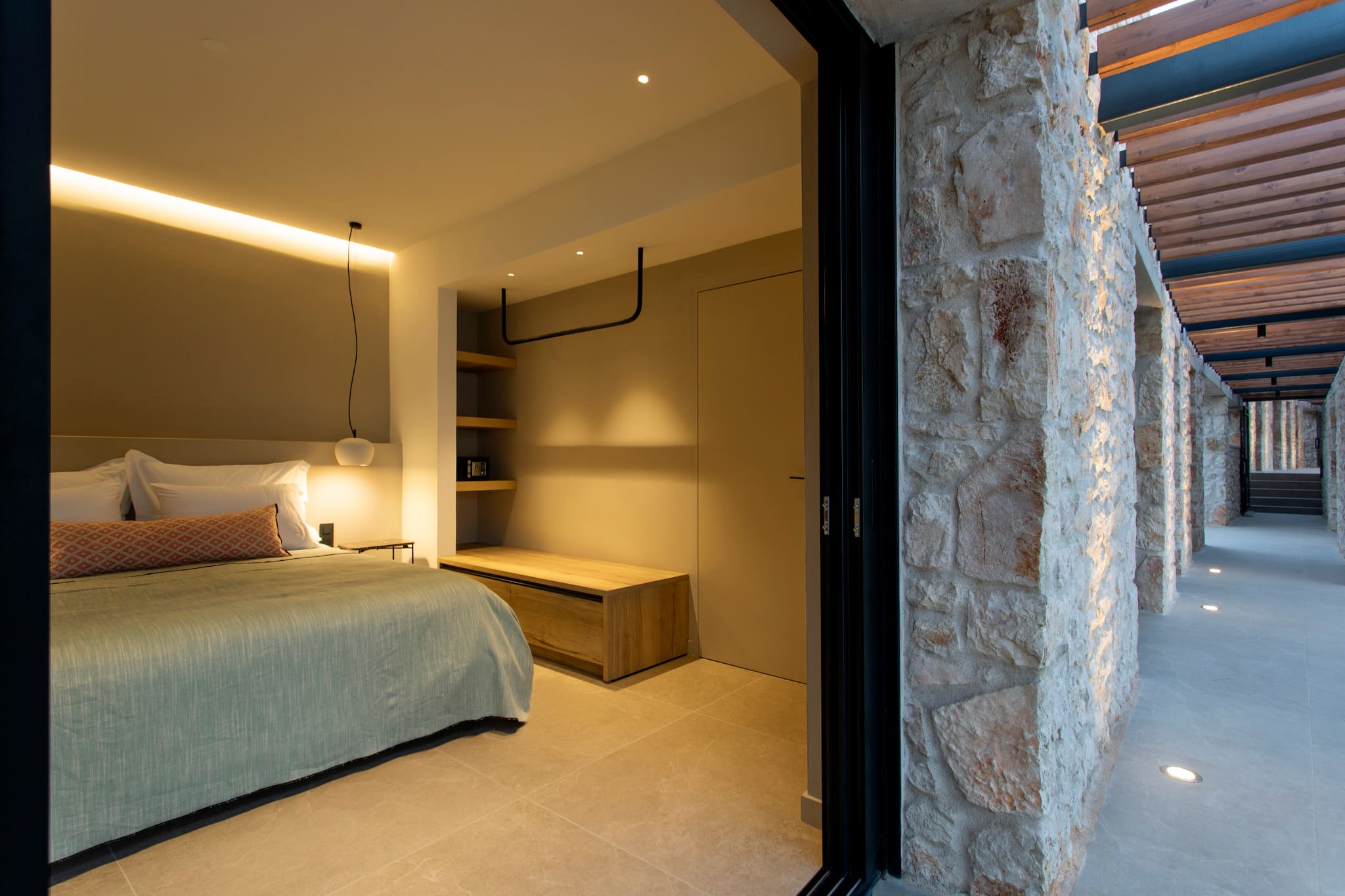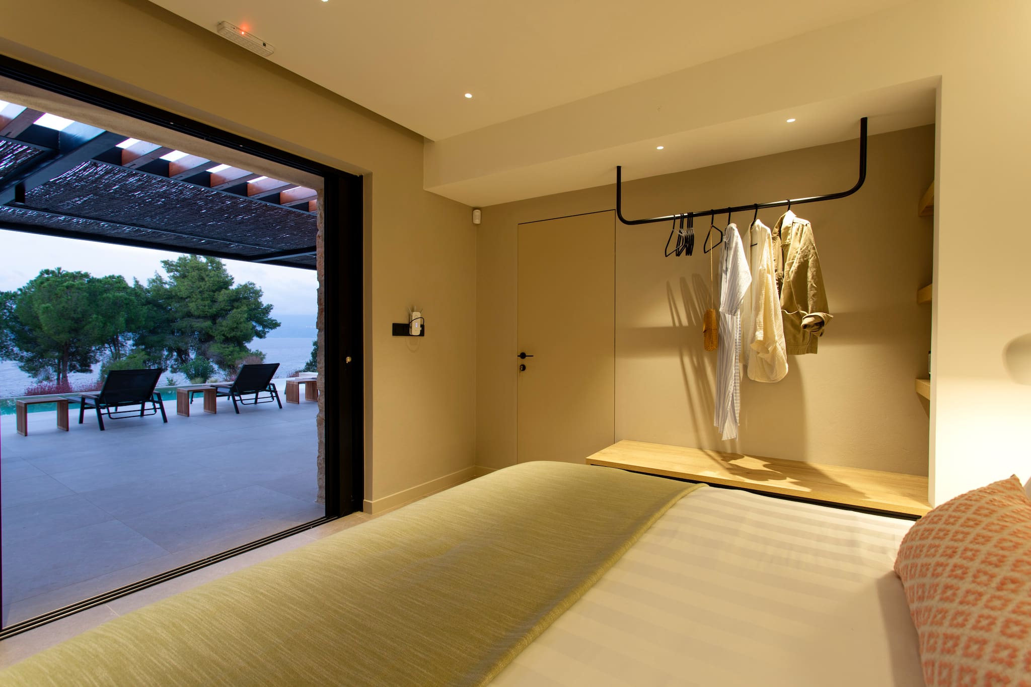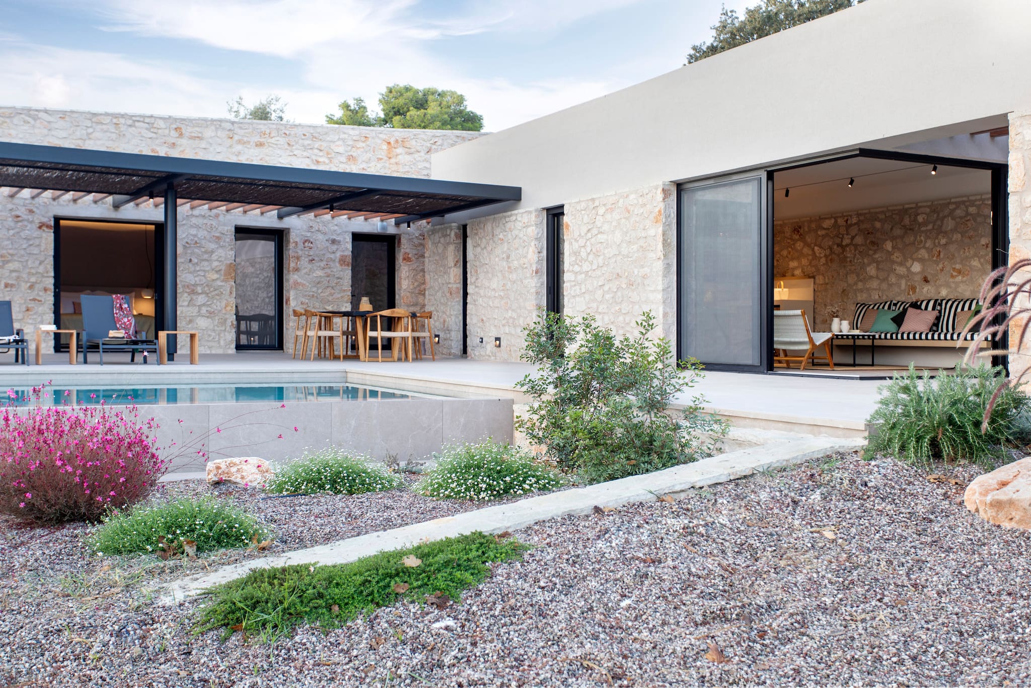 The multi-dimensional architecture of two independent building blocks, wrap around the terraces of each building with wooden beamed pergolas, creating a soothing indoor-outdoor synergy that you would expect from your summer holiday accommodation in Greece.
