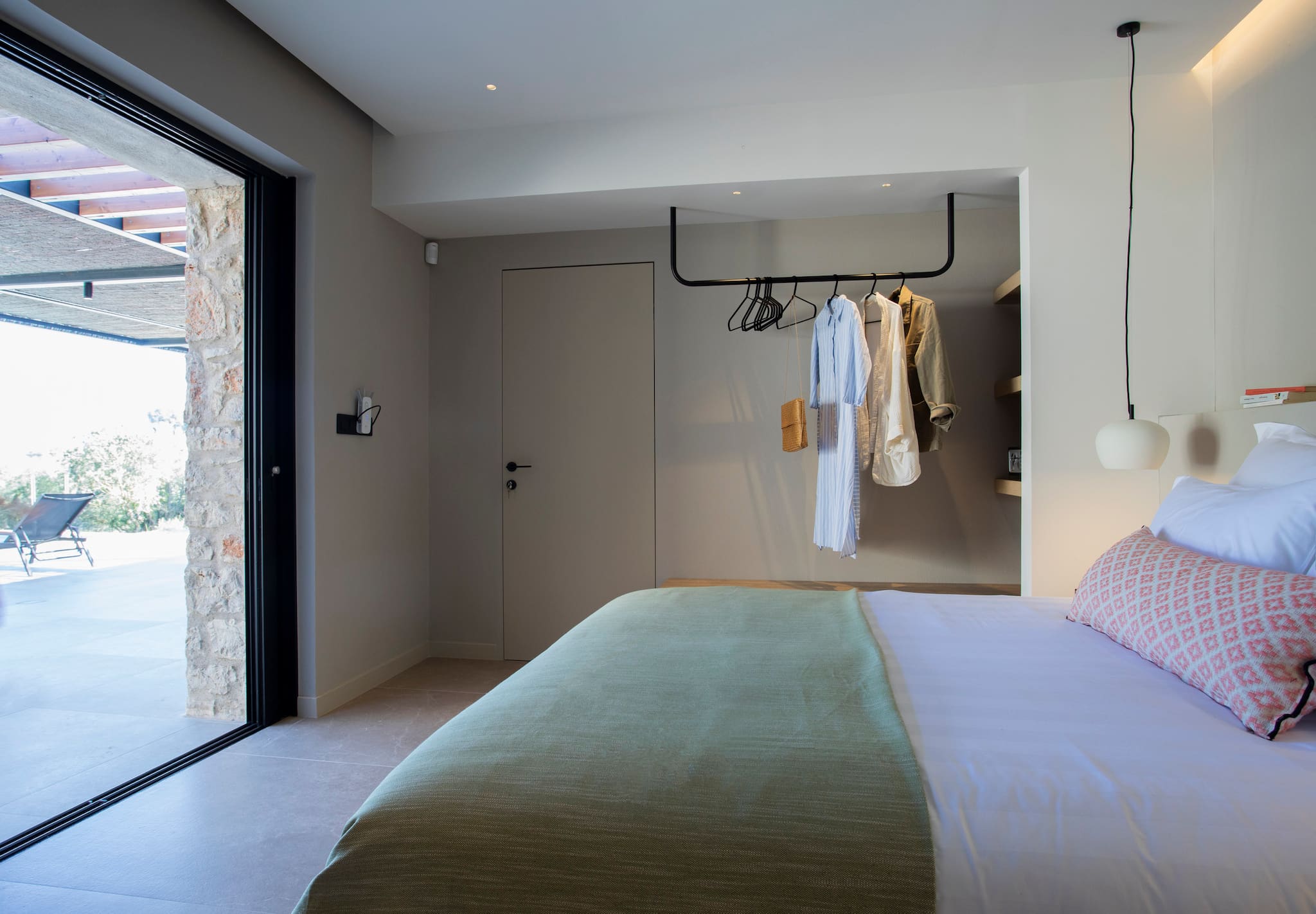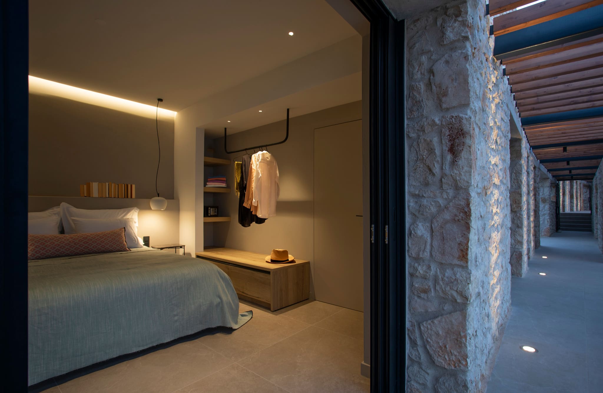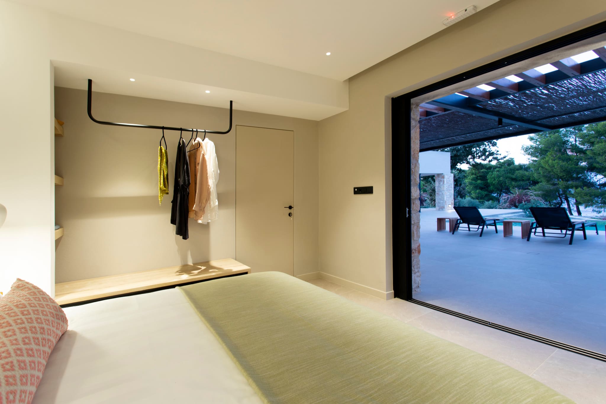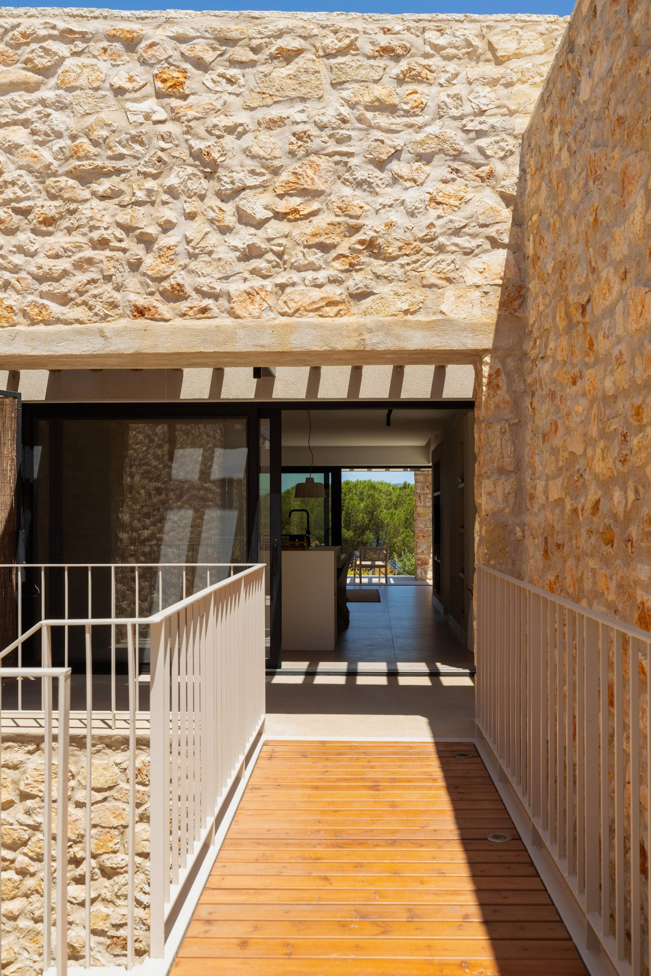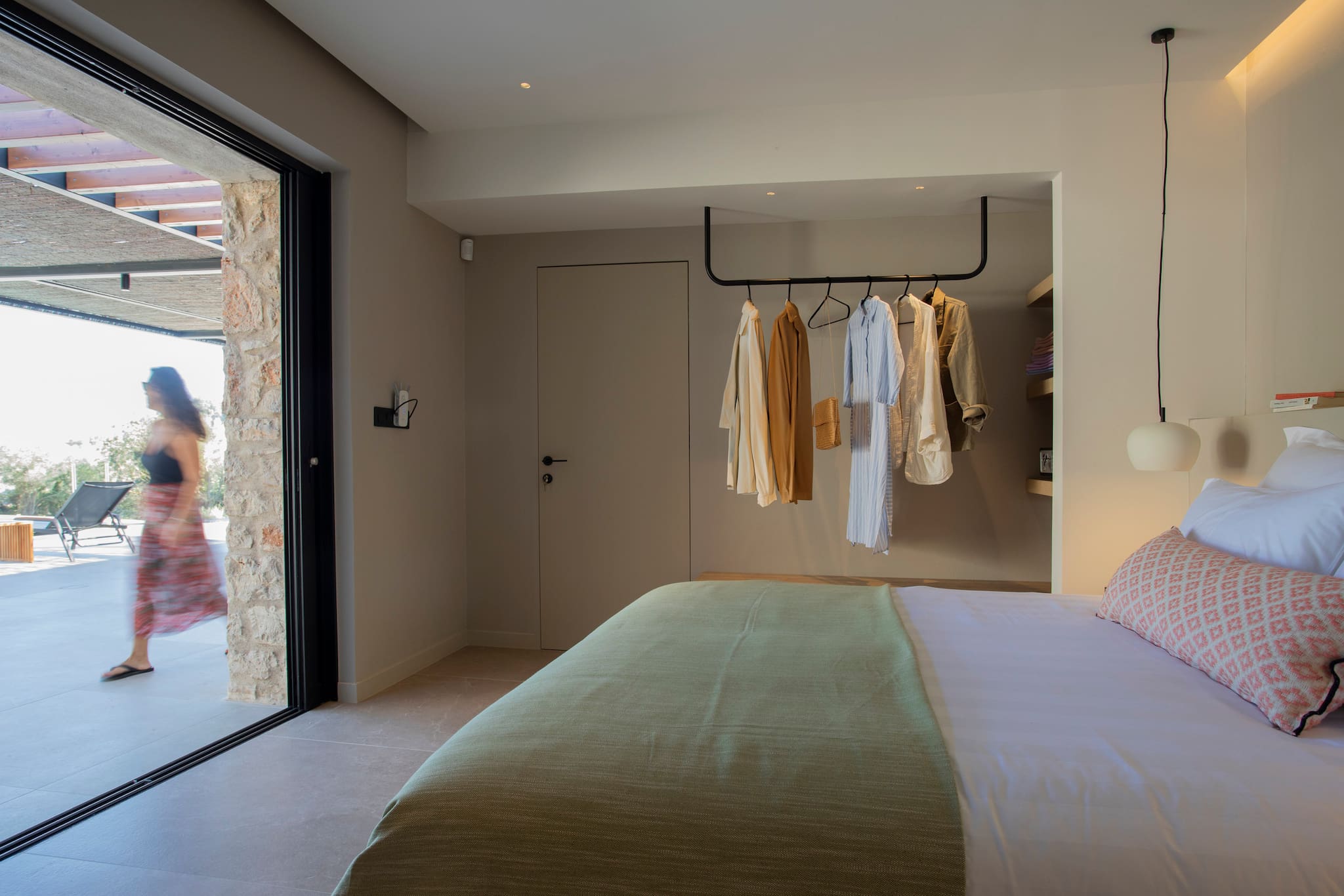 The multi-dimensional architecture of two independent building blocks, wrap around the terraces of each building with wooden beamed pergolas, creating a soothing indoor-outdoor synergy that you would expect from your summer holiday accommodation in Greece.