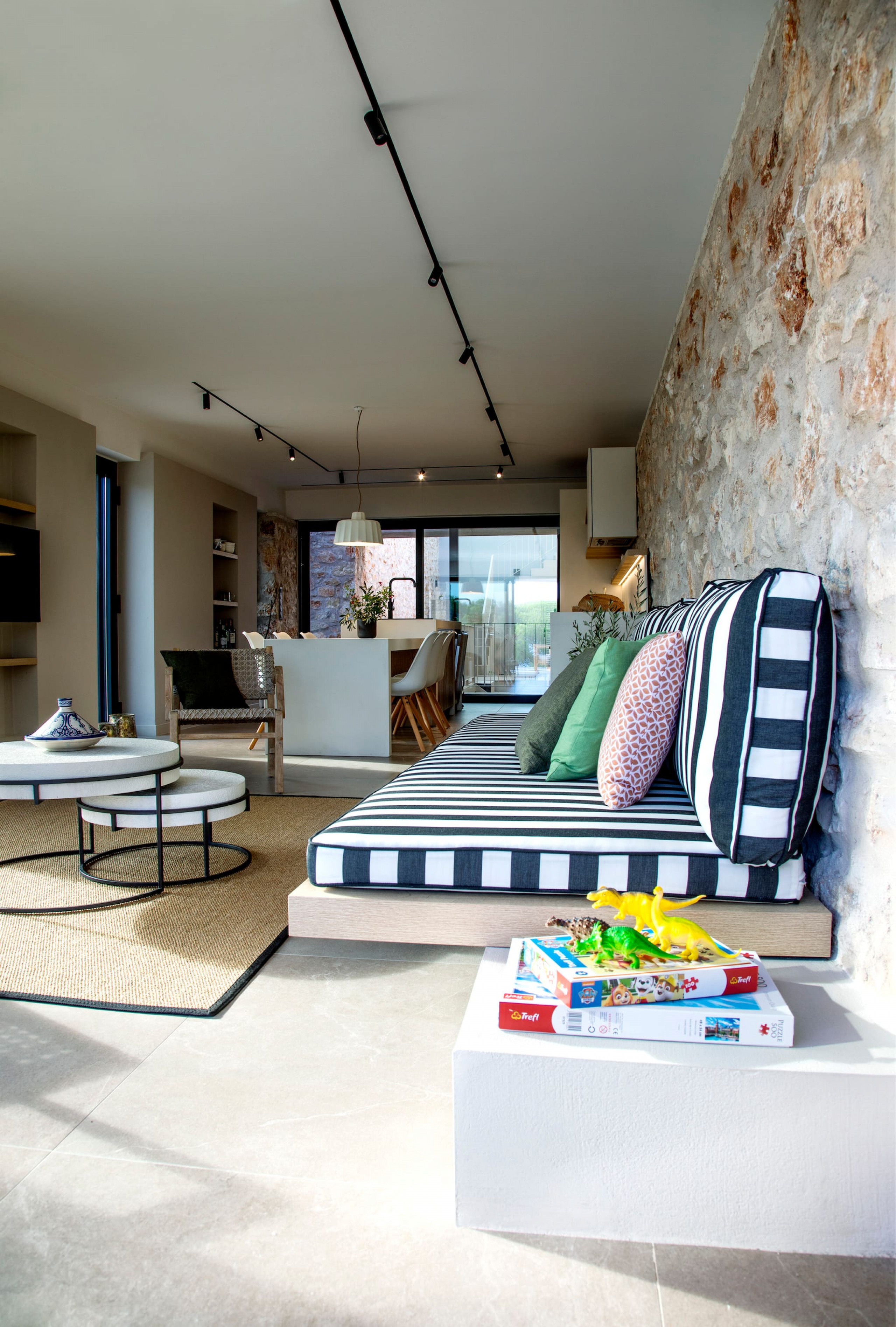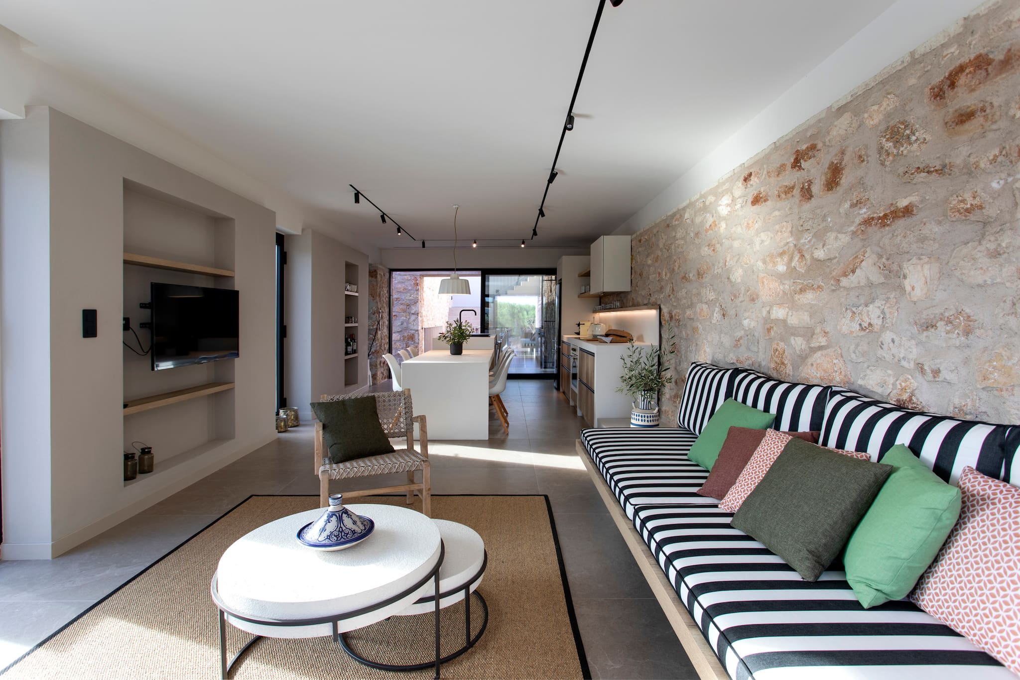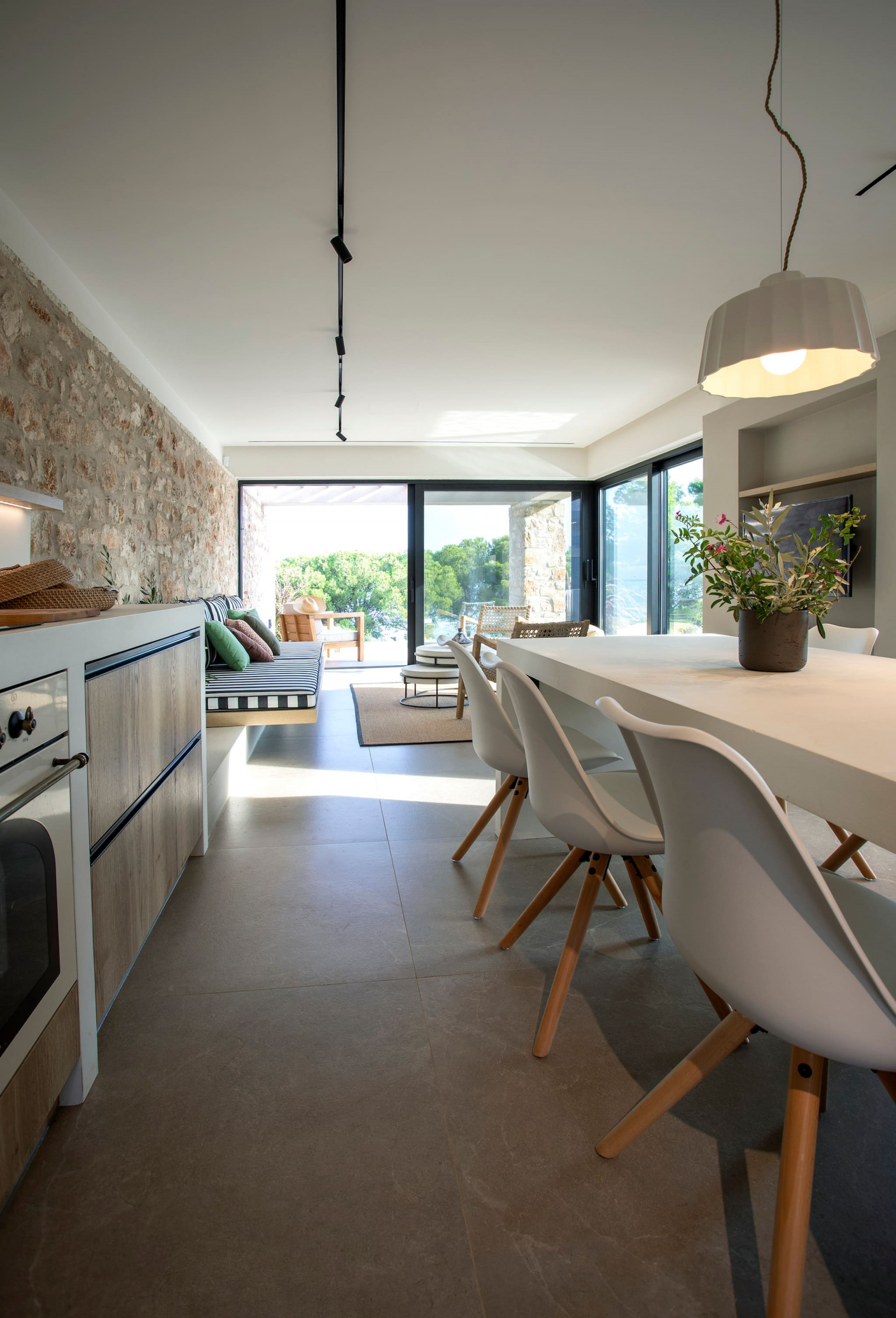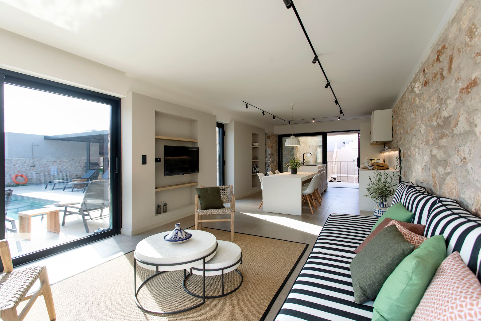 The main building of Villa Citrus, with its open contemporary concept design and sliding window doors, gives this space a luminous summer feeling, filling the space with natural sunlight throughout the day. Using traditional elements and lines, the kitchen integrates with the dining island setting. It breathes the essence of traditional design with the modern touch of modern facilities. To the front of this space is traditionally built lounge setting, with touches of boho accessories and the open floor to ceiling sliding windows creates the stunning indoor-outdoor experience with the outdoor grounds and the crystal blue waters.