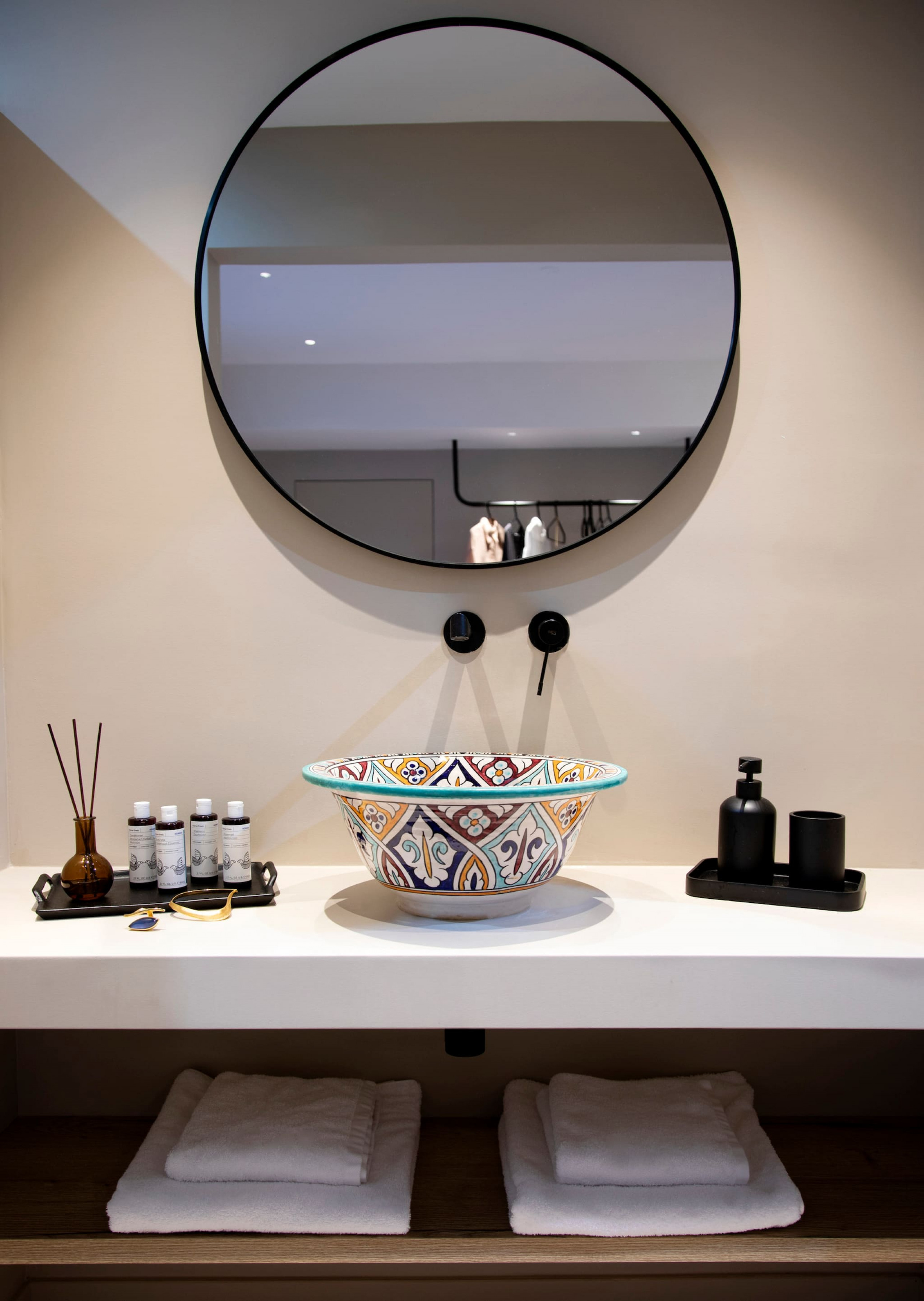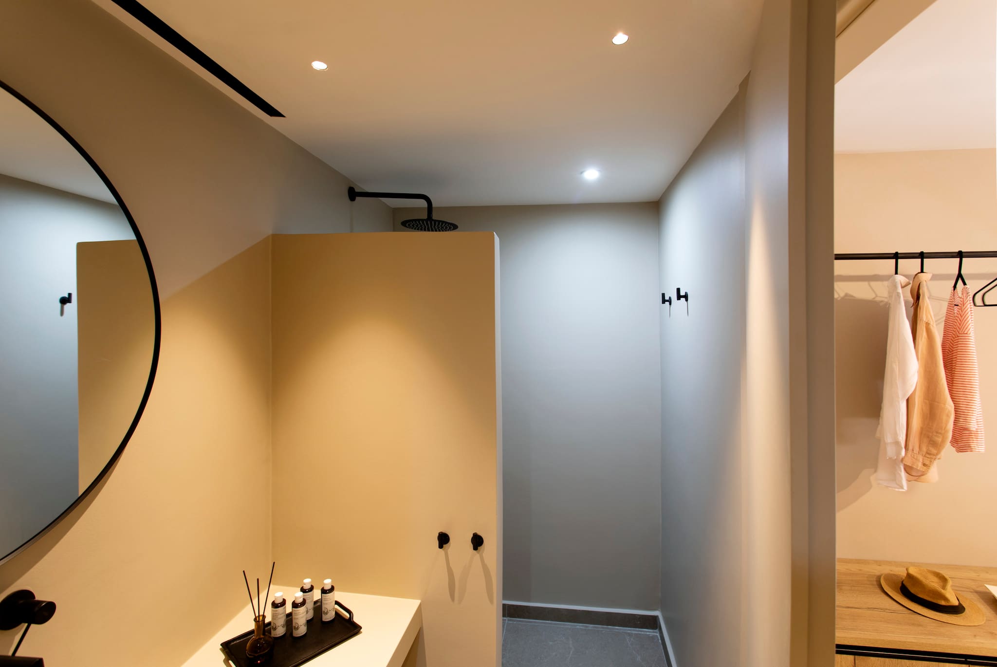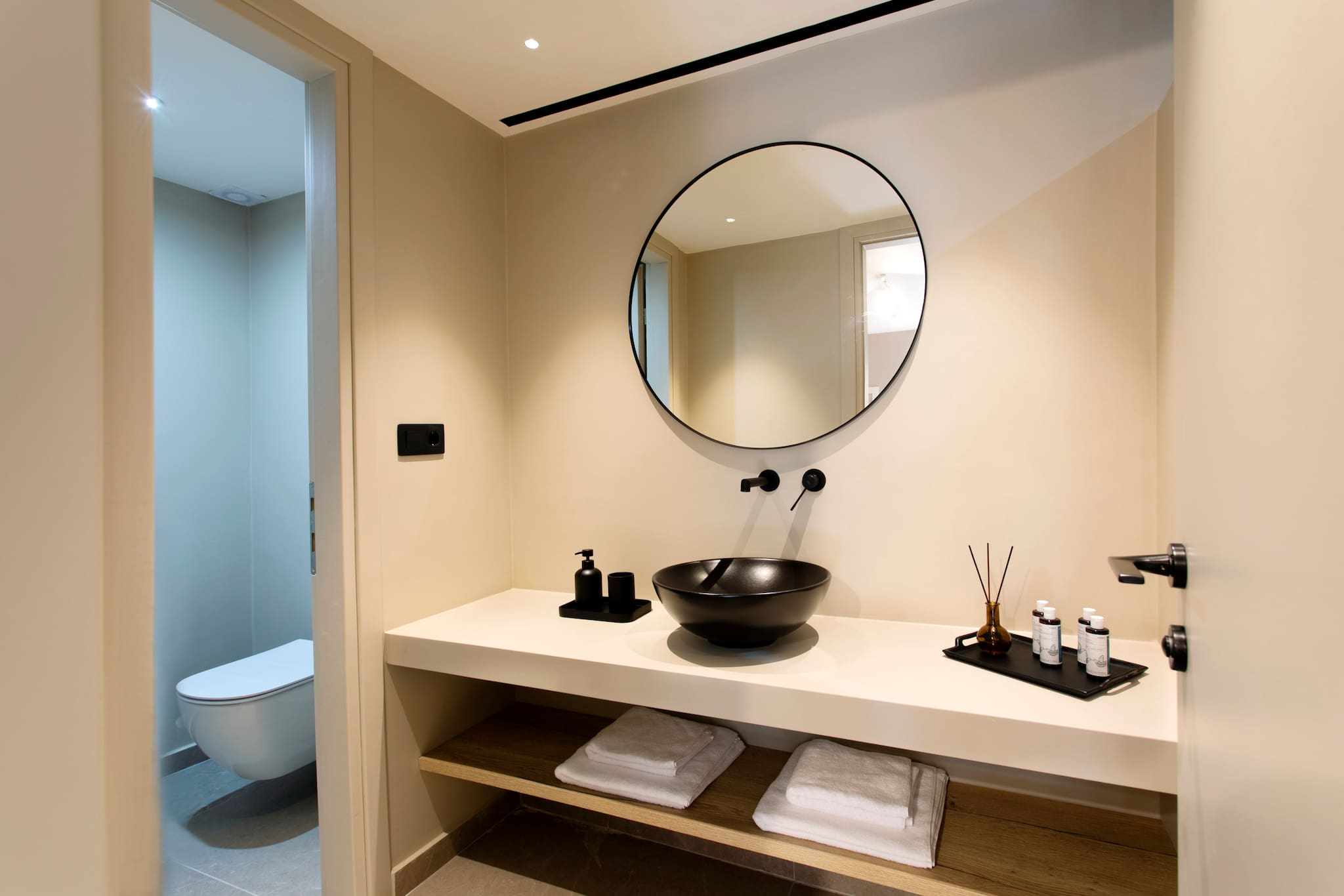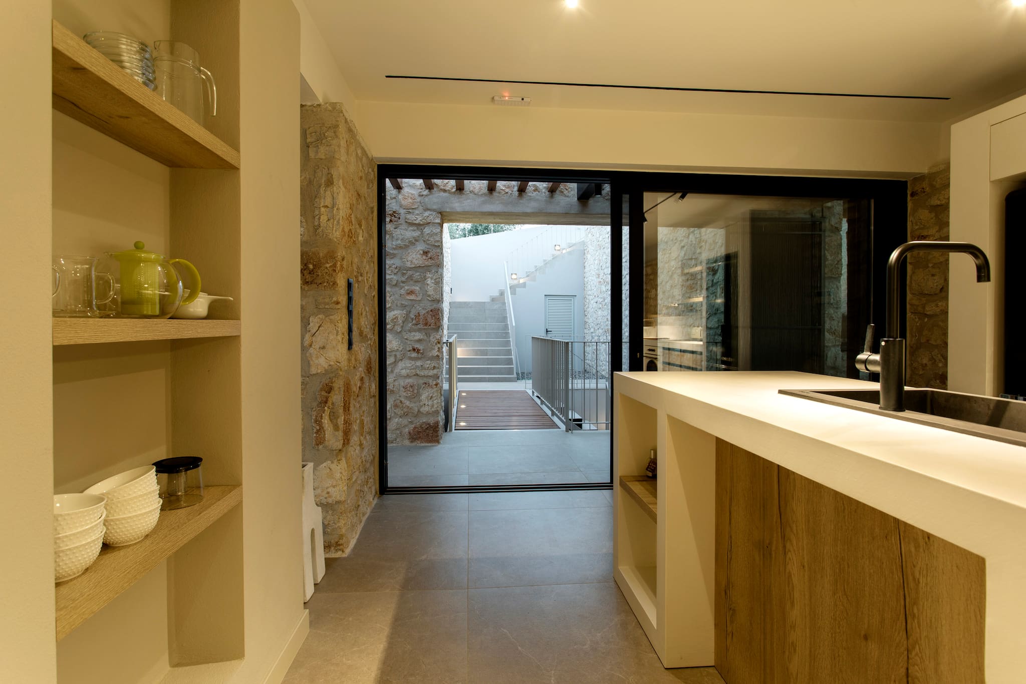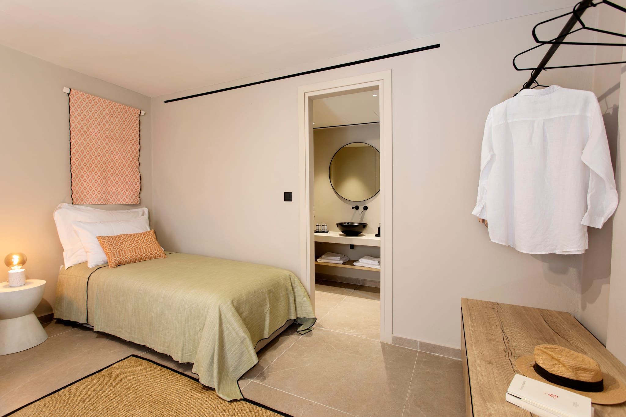 The second cubist building of Villa Citrus that is accessed externally from the open outdoor area consists of three bedrooms. Two bedrooms are accessed directly from the pool area. The warm and comfortable feel with cool cream walls and light-coloured furnishings with direct access to the outdoor grounds of the property, is the amazing experience of village style living in Greece. These two bedrooms are equipped with double beds and ensuite bathrooms with shower. On the same level there is an extra bathroom with a shower. The third bedroom of the accommodation has outdoor access on the lower level of the second building, equipped with twin beds, ensuite bathroom with shower, ideal for children to feel they have their own independent space.
