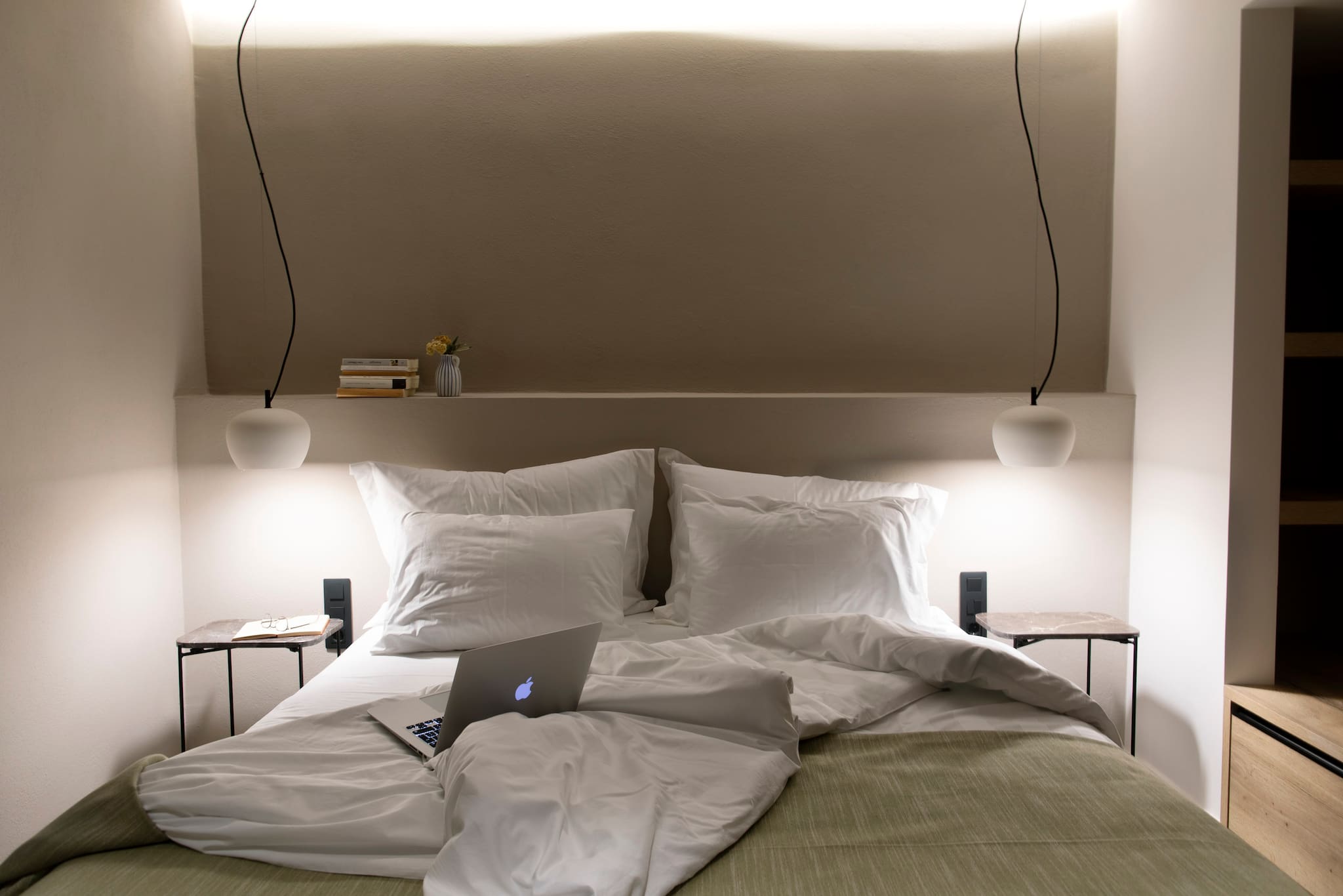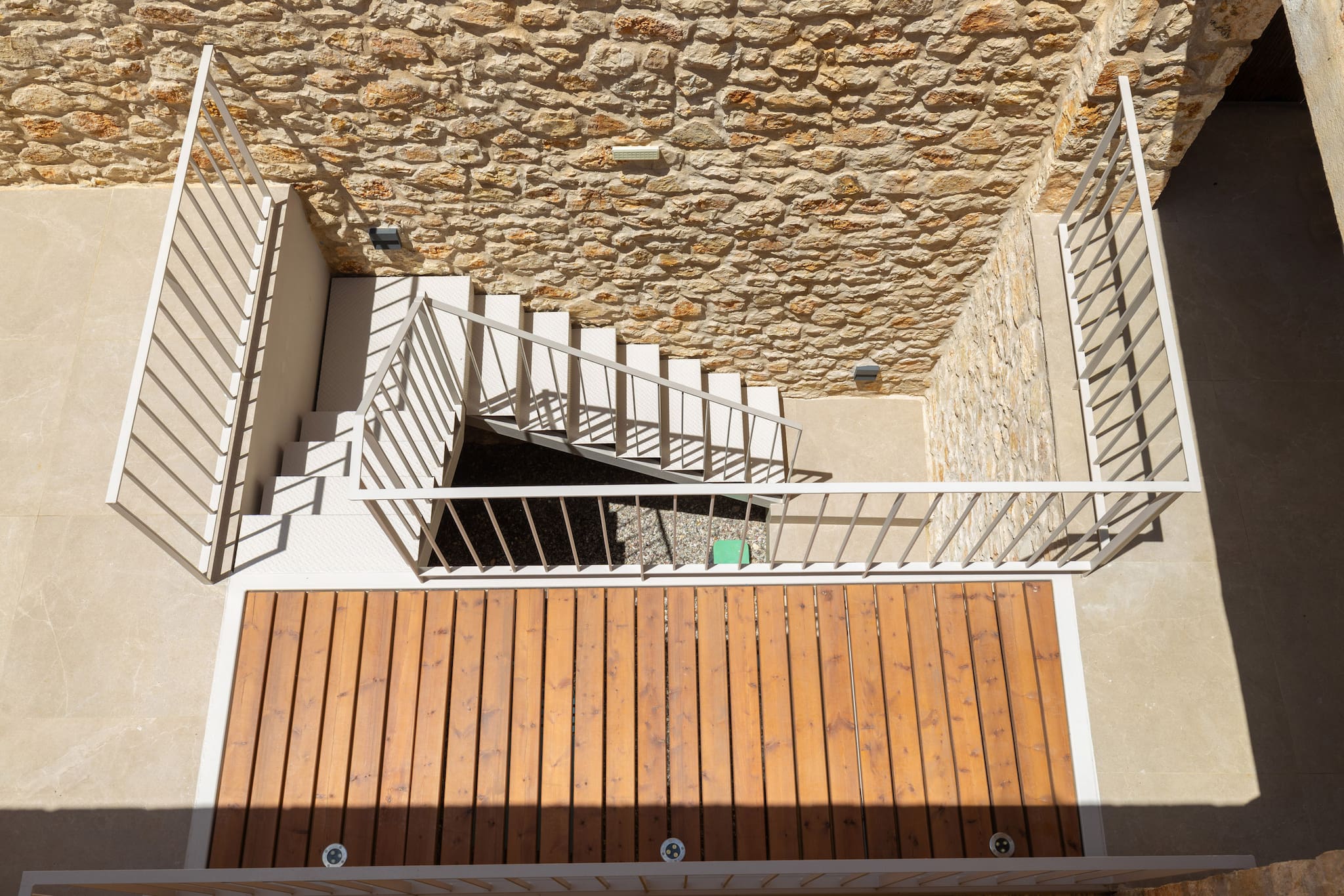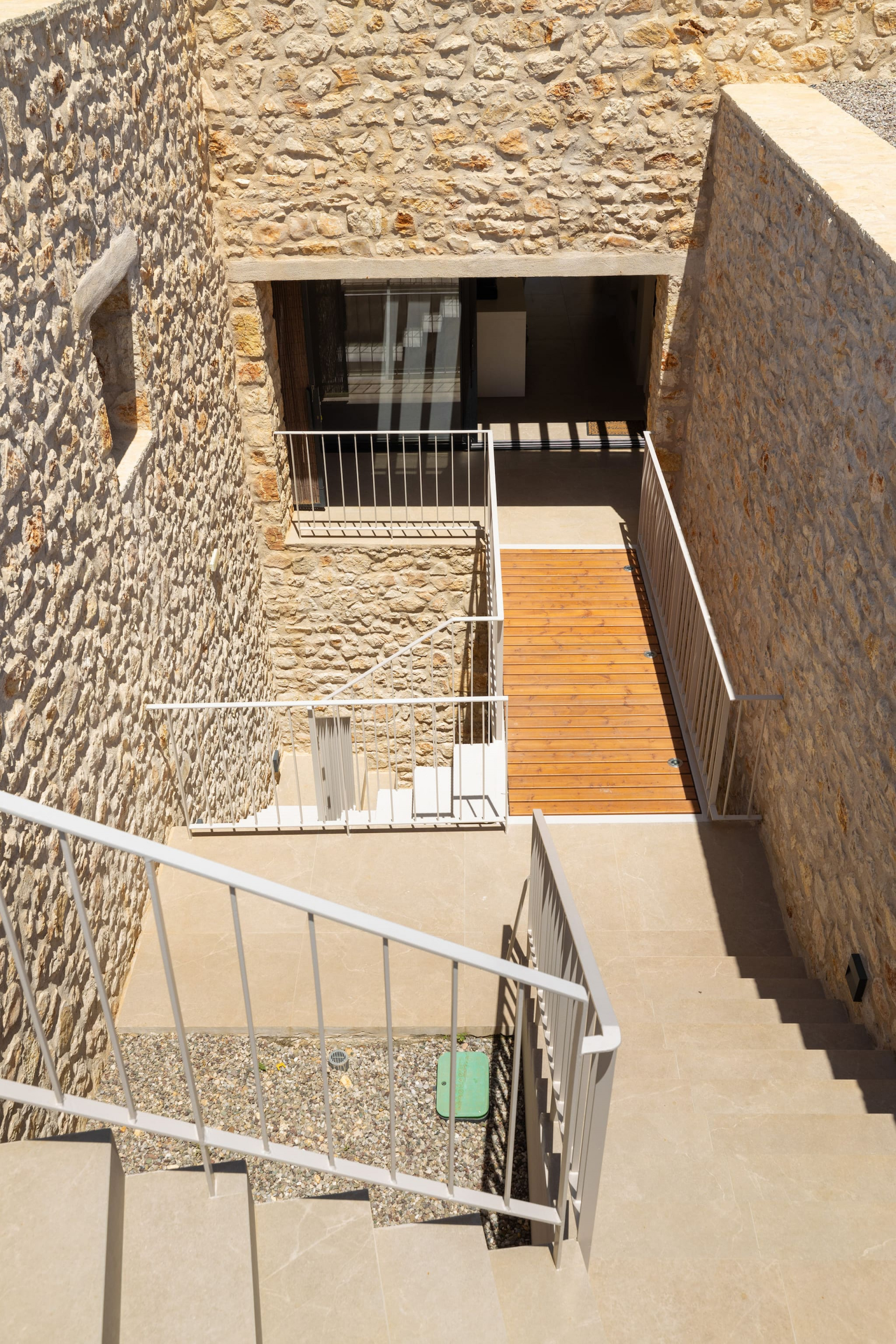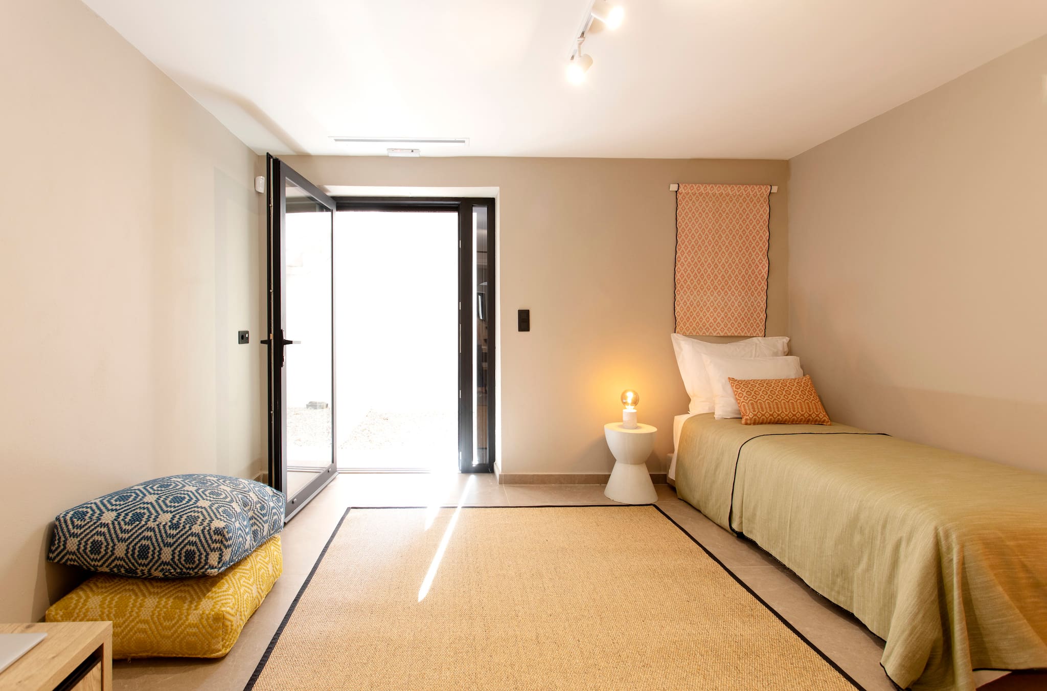 The second cubist building of Villa Aloe that is accessed externally from the open outdoor area consists of three bedrooms. Two bedrooms are accessed directly from the pool area. The warm and comfortable feel with cool cream walls and light-coloured furnishings with direct access to the outdoor grounds of the property, is the amazing experience of village style living in Greece. These two bedrooms are equipped with double beds and ensuite bathrooms with shower. On the same level there is an extra bathroom with a shower. The third bedroom of the accommodation has outdoor access on the lower level of the second building, equipped with twin beds, ensuite bathroom with shower, ideal for children to feel they have their own independent space.