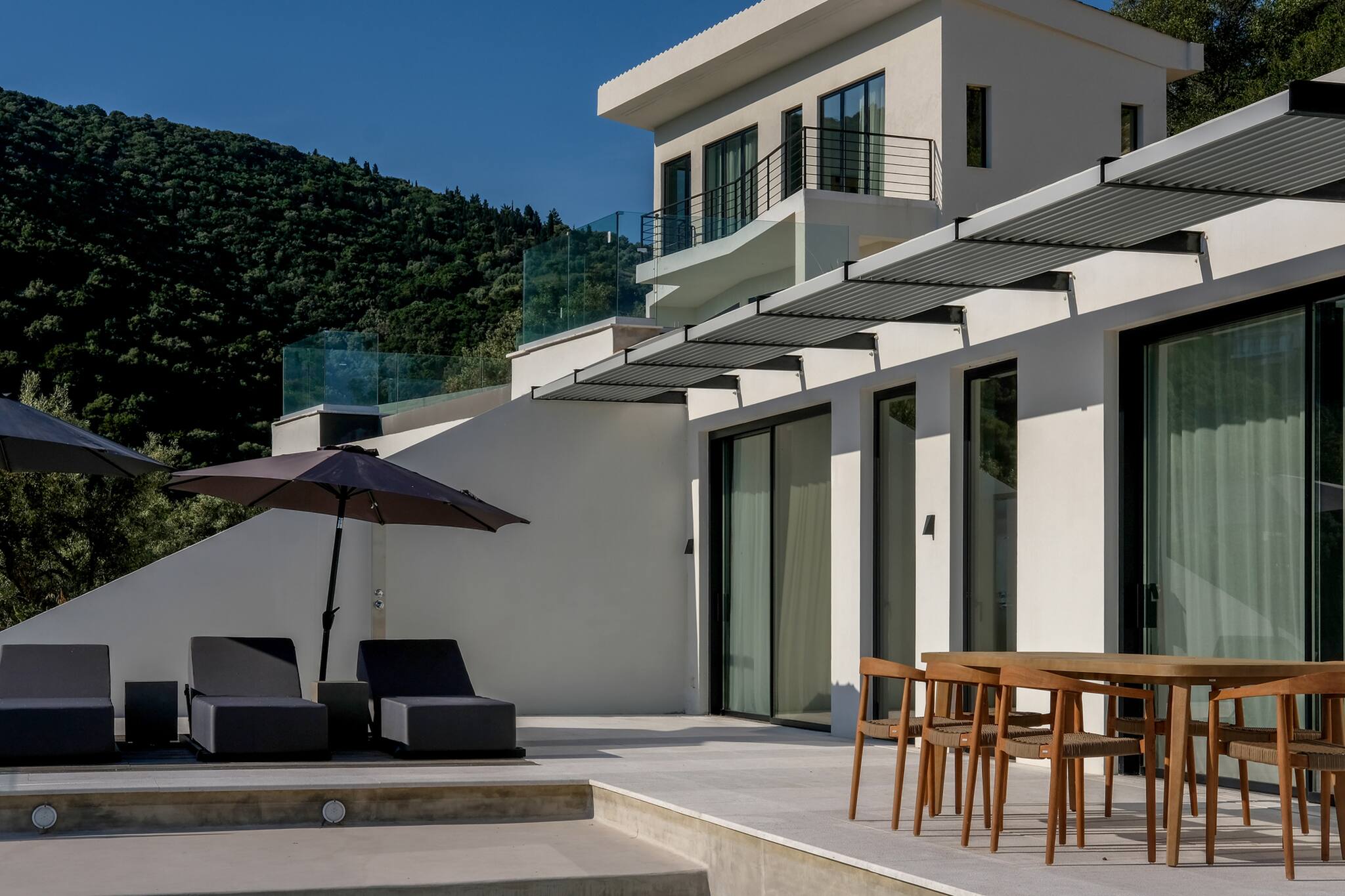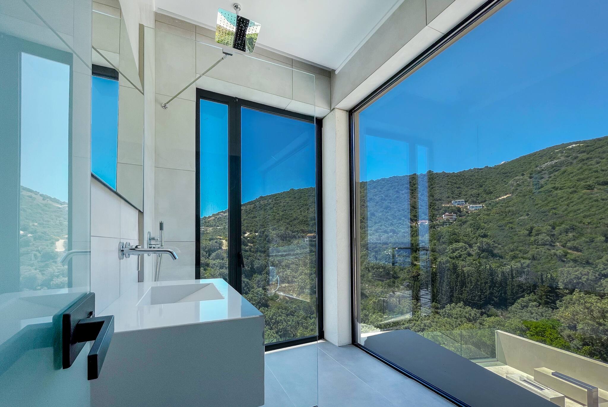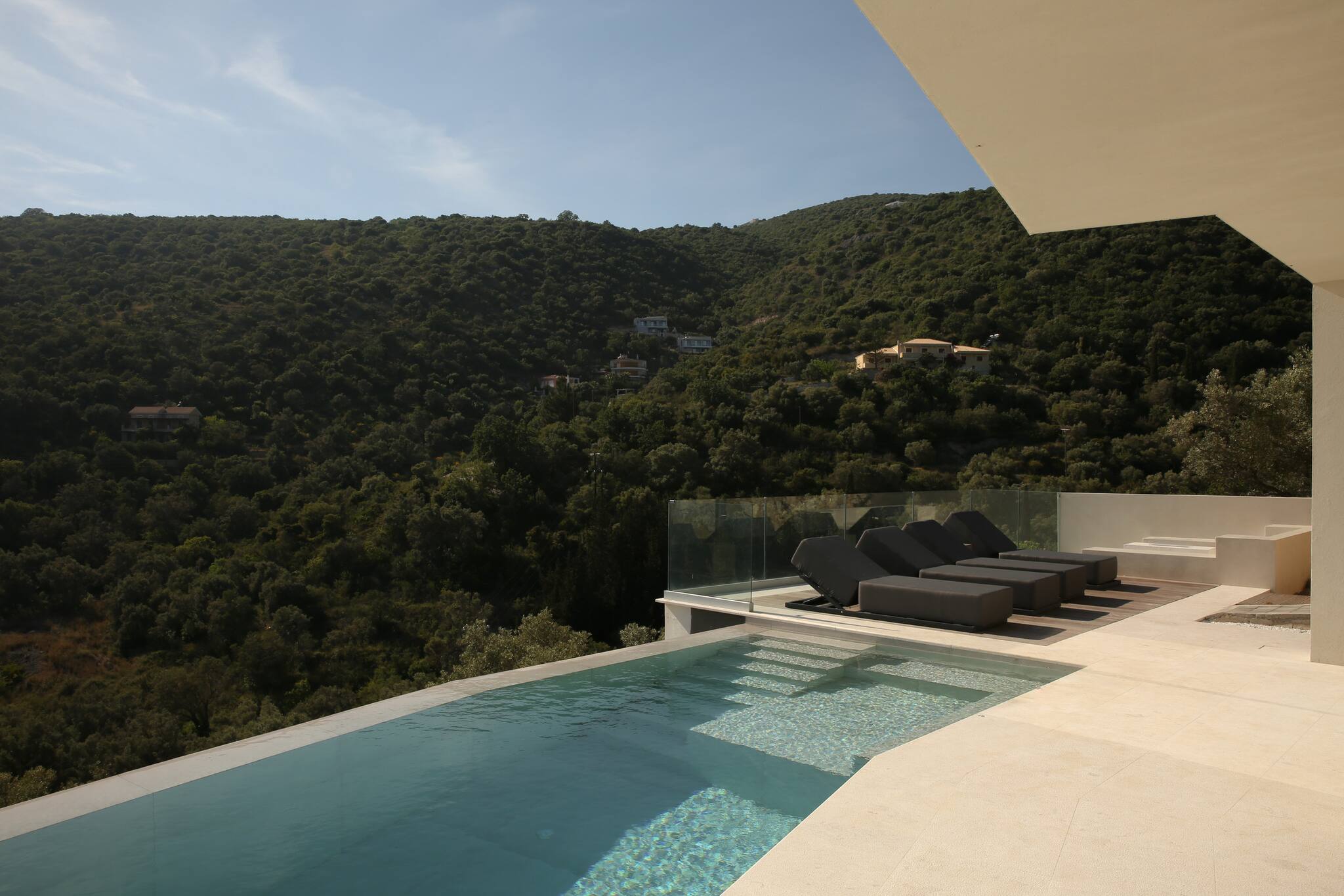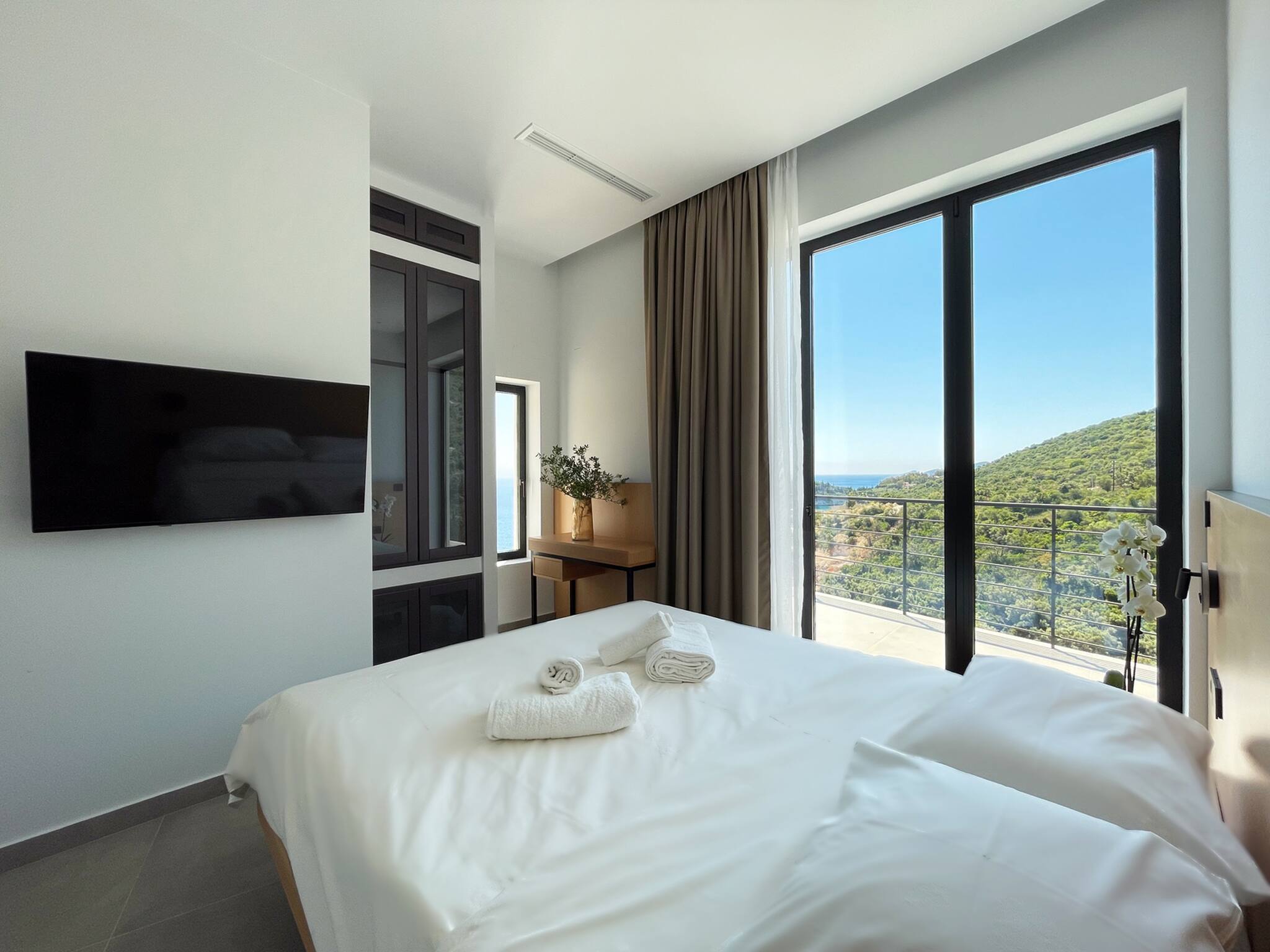 Upon entering Villa Saphora, you walk into a spacious open plan living area filled with natural sunlight through the window panel doors that lead to the outdoor pool area. This space consists of a fully equipped kitchen, dining area and a lounge setting facing the Ionian Sea and the lush green mountain side in the background. The lounge are consists of a double sofa bed for an additional two guests.