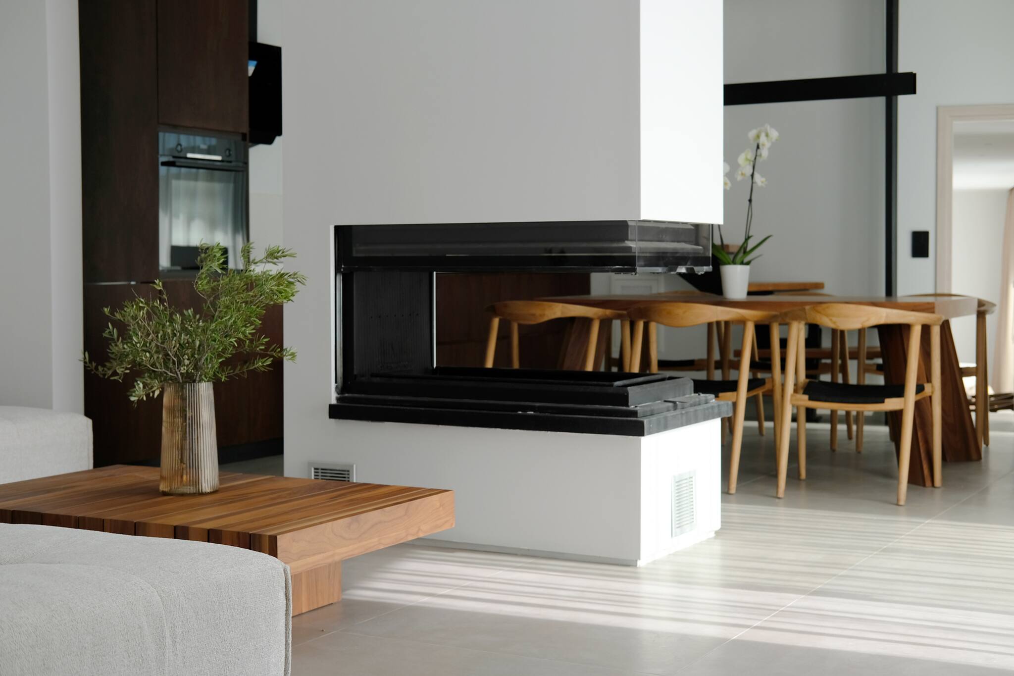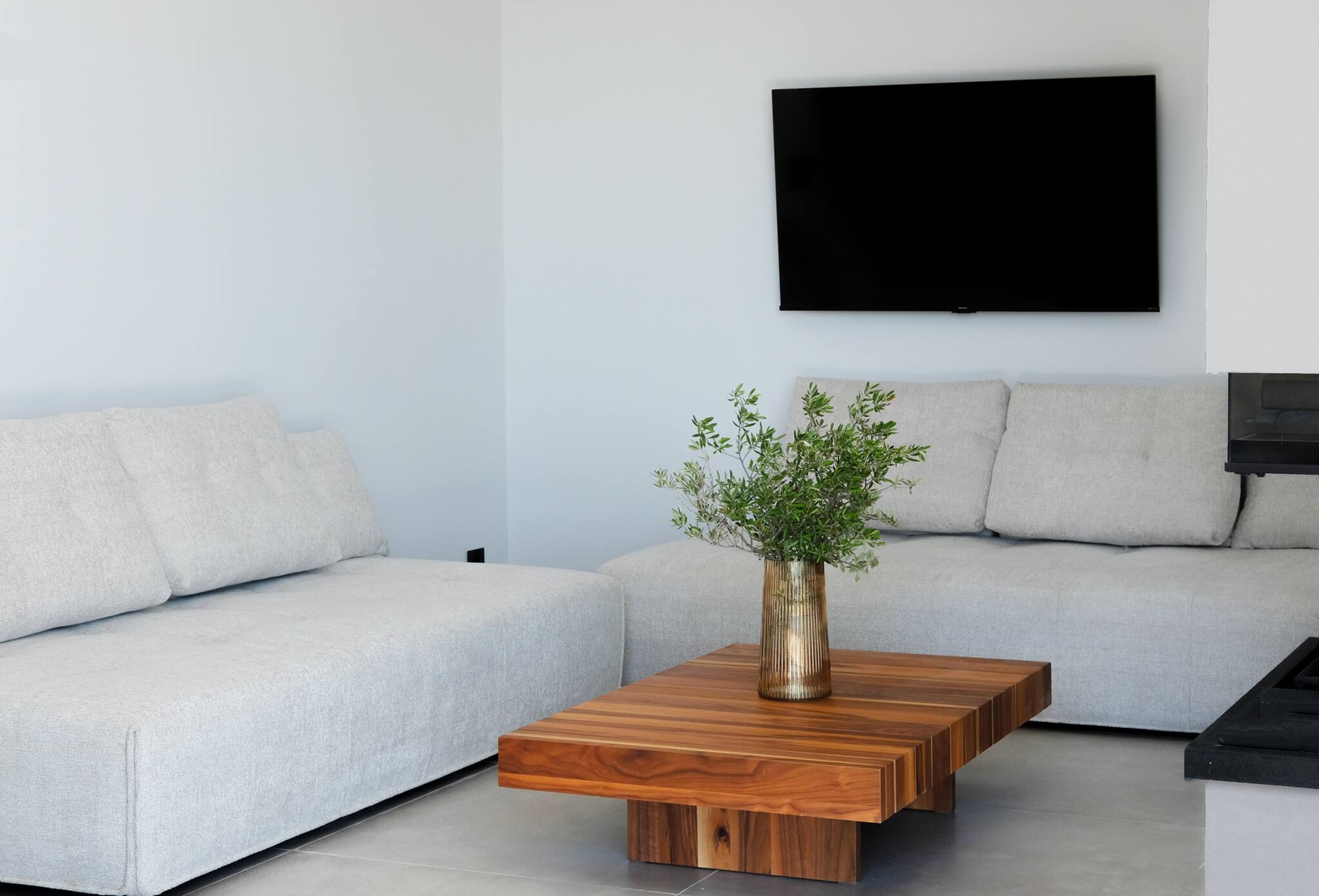 As you step into Villa Penelope, you’re welcomed by a spacious living area filled with natural light streaming through large glass doors. On one side, you’ll find a fully equipped kitchen with a dining area, while the other side features a generous lounge and dining space, complete with an additional WC. The tall glass doors blur the lines between indoor and outdoor living, offering the quintessential villa experience in Greece.