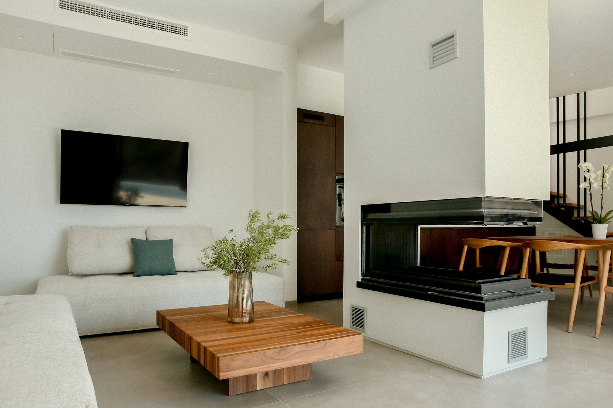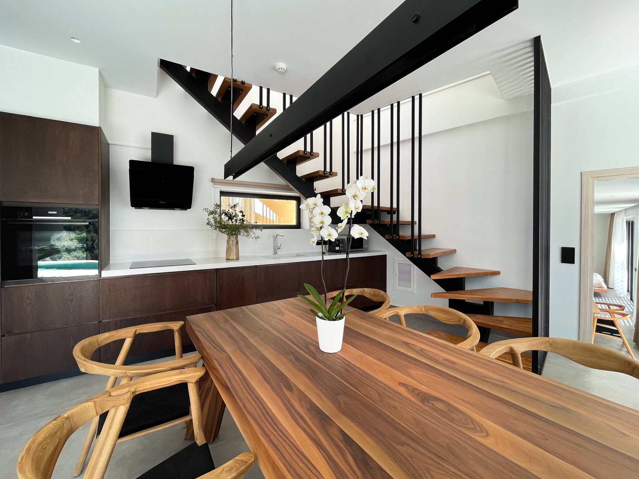 As you step into Villa Odyssey, you’re welcomed by a spacious living area filled with natural light streaming through large glass doors. On one side, you’ll find a fully equipped kitchen with a dining area, while the other side features a generous lounge and dining space, complete with an additional WC. The tall glass doors blur the lines between indoor and outdoor living, offering the quintessential villa experience in Greece.