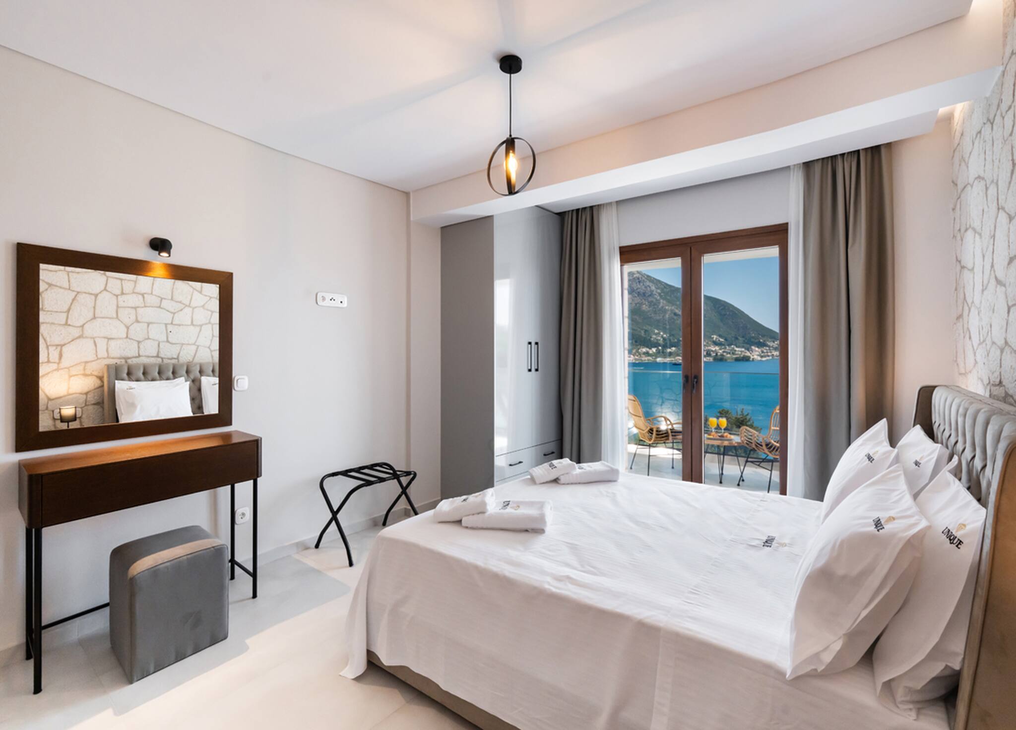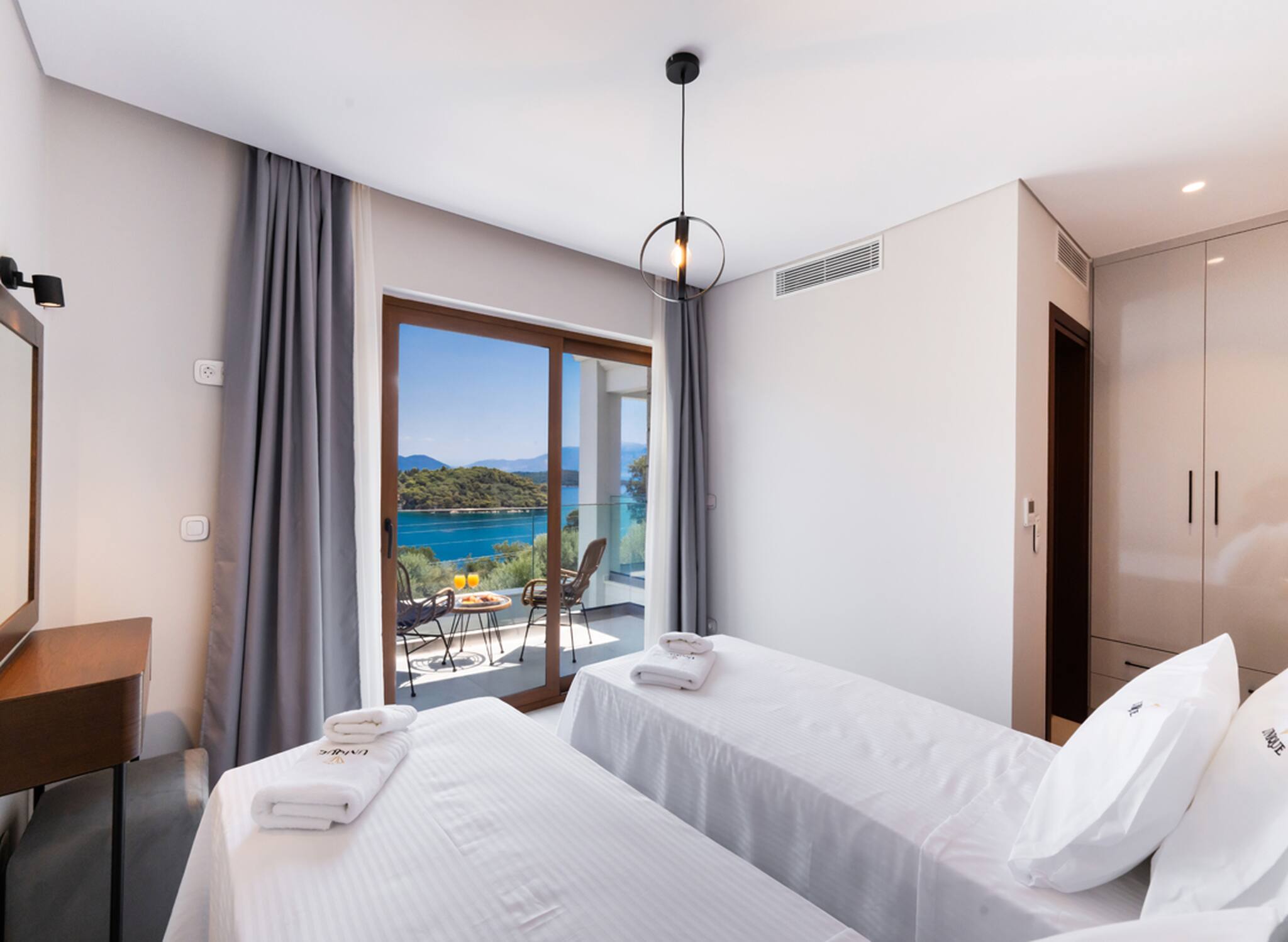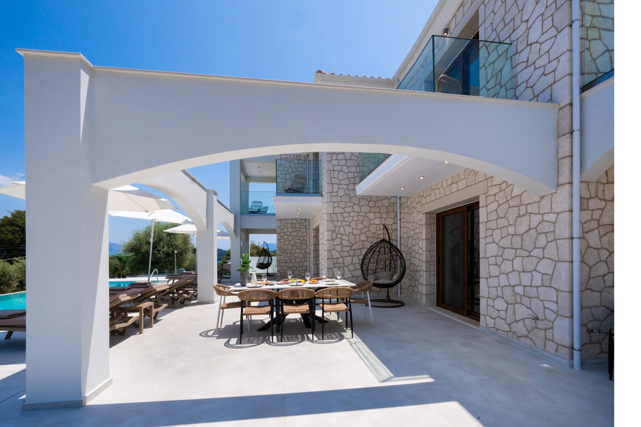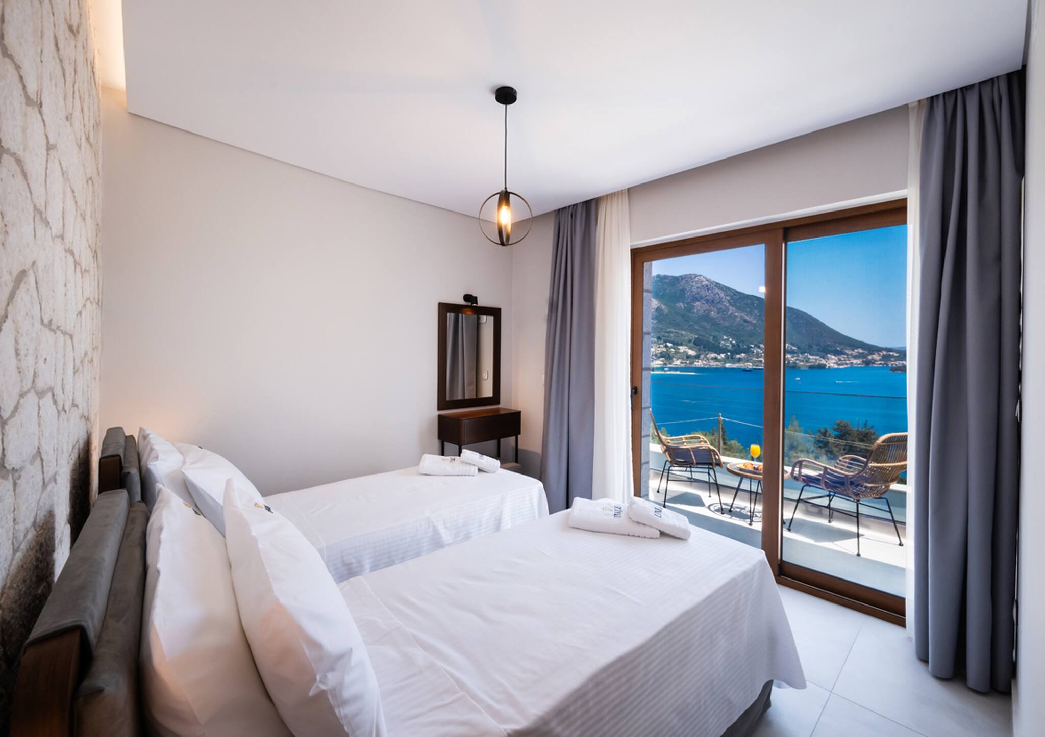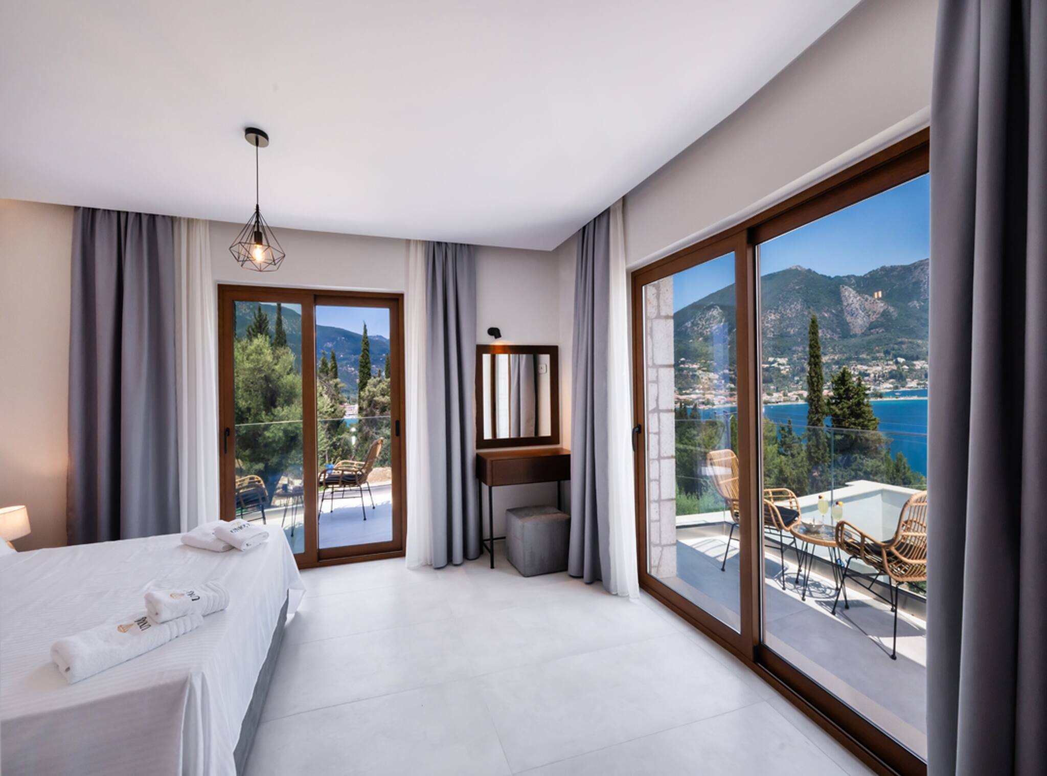 Via the internal staircase again from the ground level, you come to the upper level where you will find the other three bedrooms all convenient with ensuite bathrooms. Starting from the left of the hallway are two bedrooms, with the first furnished with a queen-sized bed and the second bedroom acting as the twin bedroom, preferably for children. The last of the three bedrooms to the right of the hallway acts as the master bedroom. Every morning all three bedrooms are filled with the beauty of the Greek sunrise coming through the window sliding doors across the crystal blue waters of the Ionian Archipelagos.