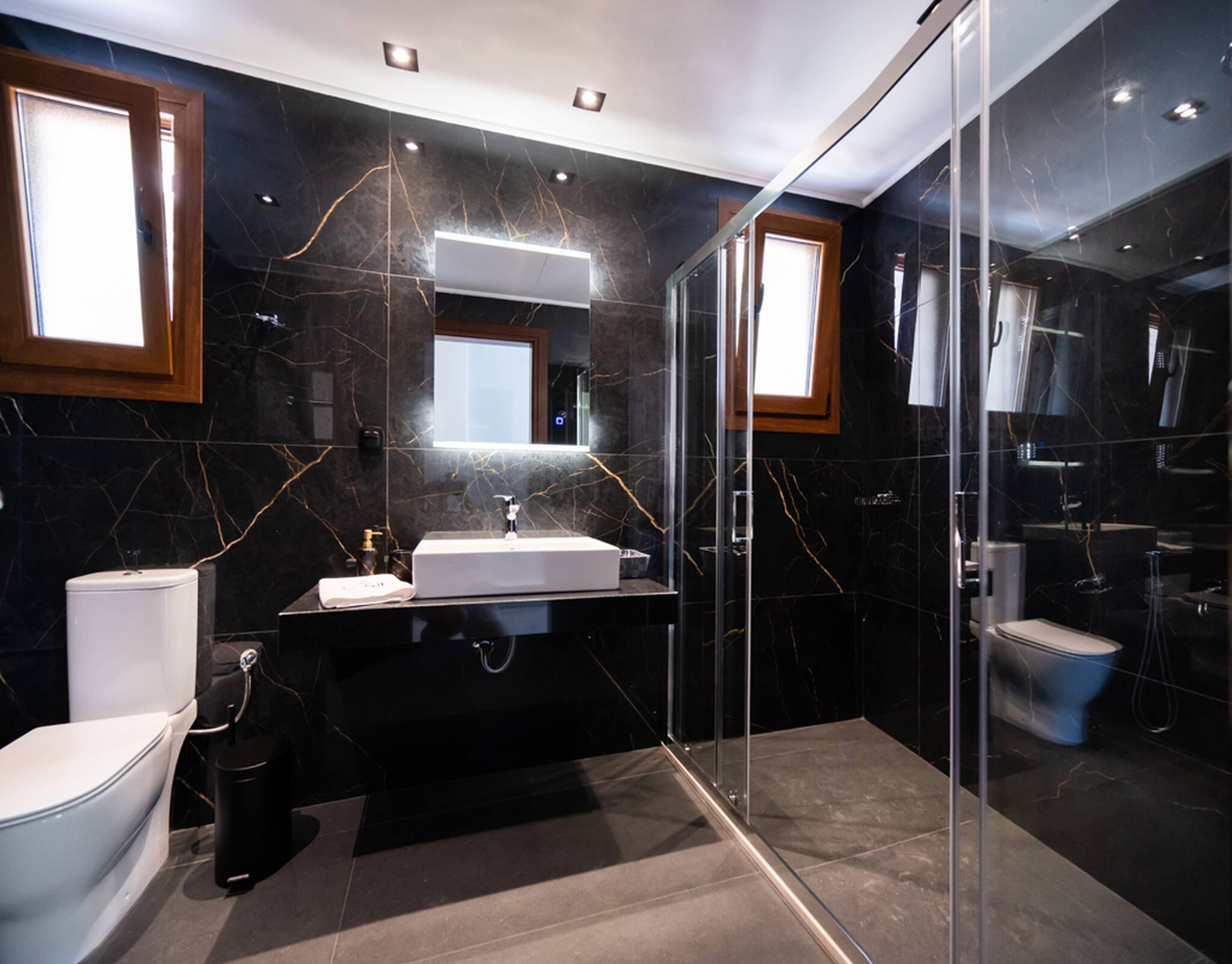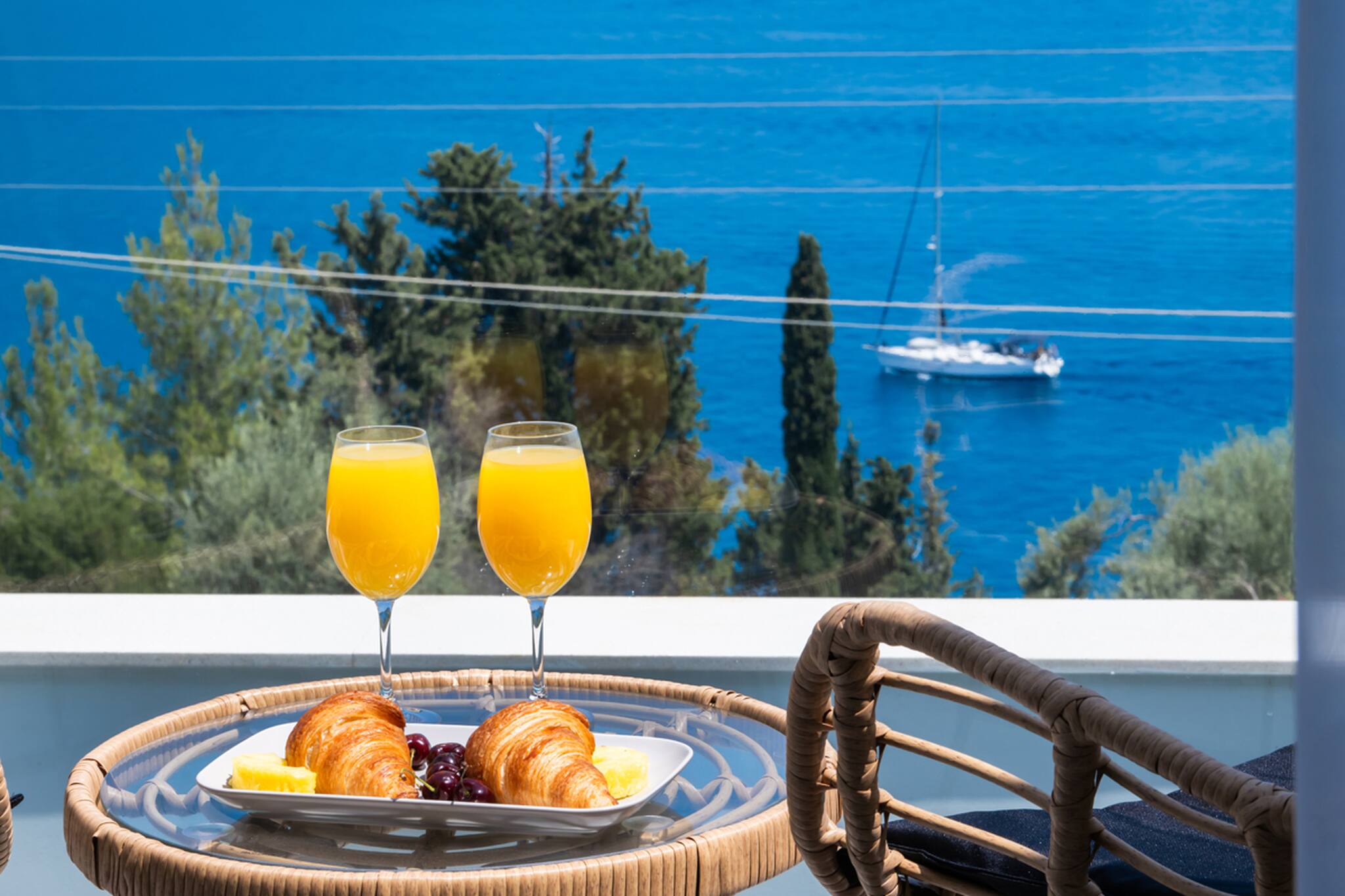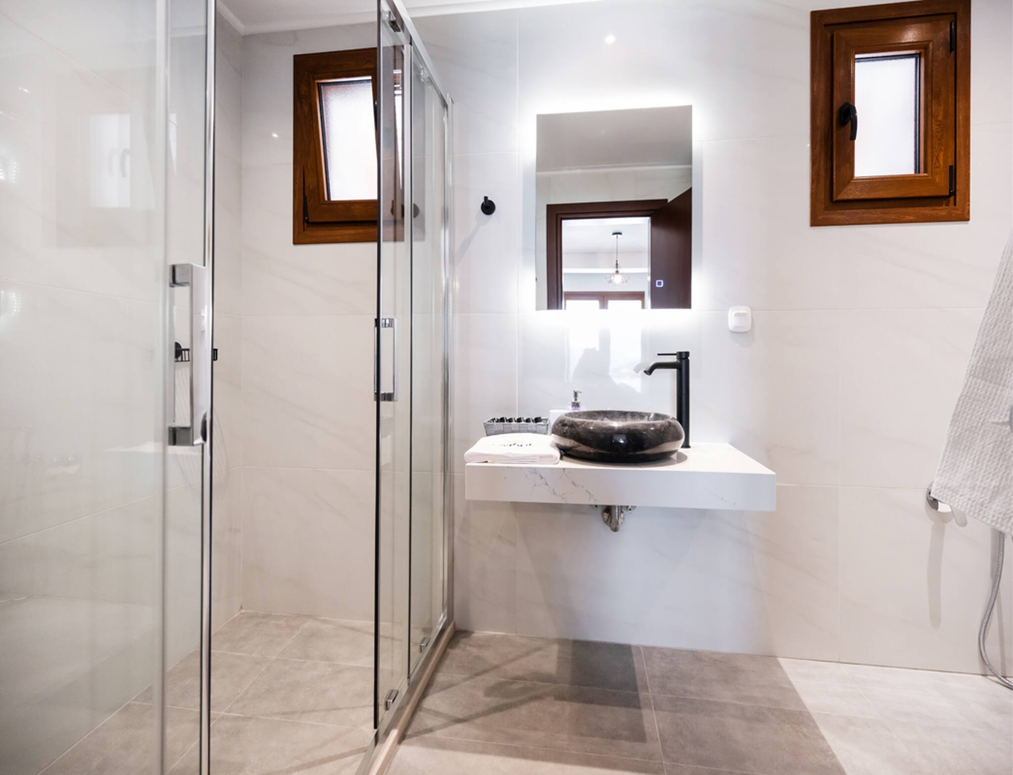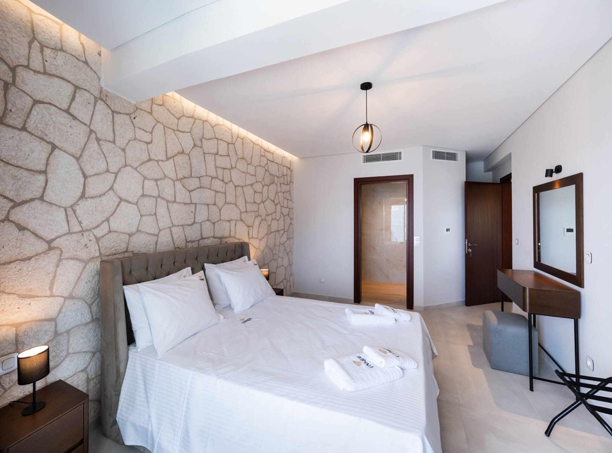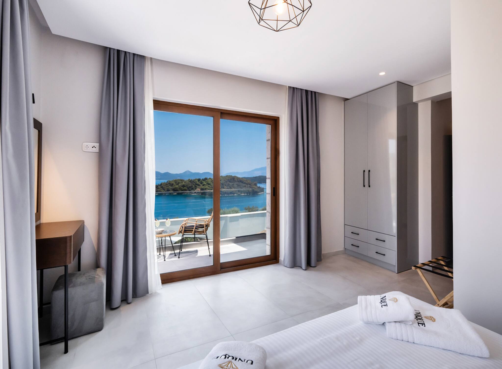 Via the internal staircase again from the ground level, you come to the upper level where you will find the other three bedrooms all convenient with ensuite bathrooms. Starting from the left of the hallway are two bedrooms, with the first furnished with a queen-sized bed and the second bedroom acting as the twin bedroom, preferably for children. The last of the three bedrooms to the right of the hallway acts as the master bedroom. Every morning all three bedrooms are filled with the beauty of the Greek sunrise coming through the window sliding doors across the crystal blue waters of the Ionian Archipelagos.