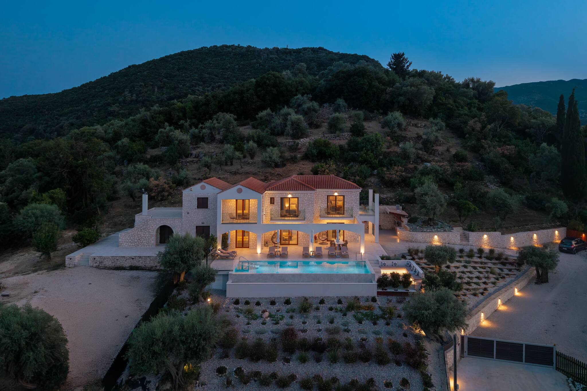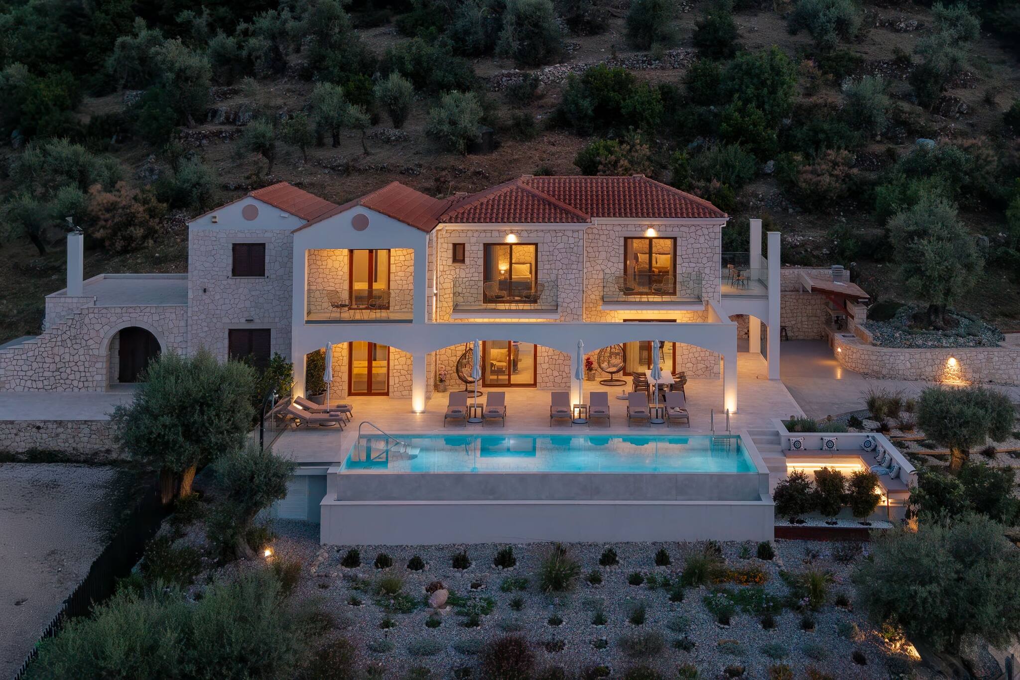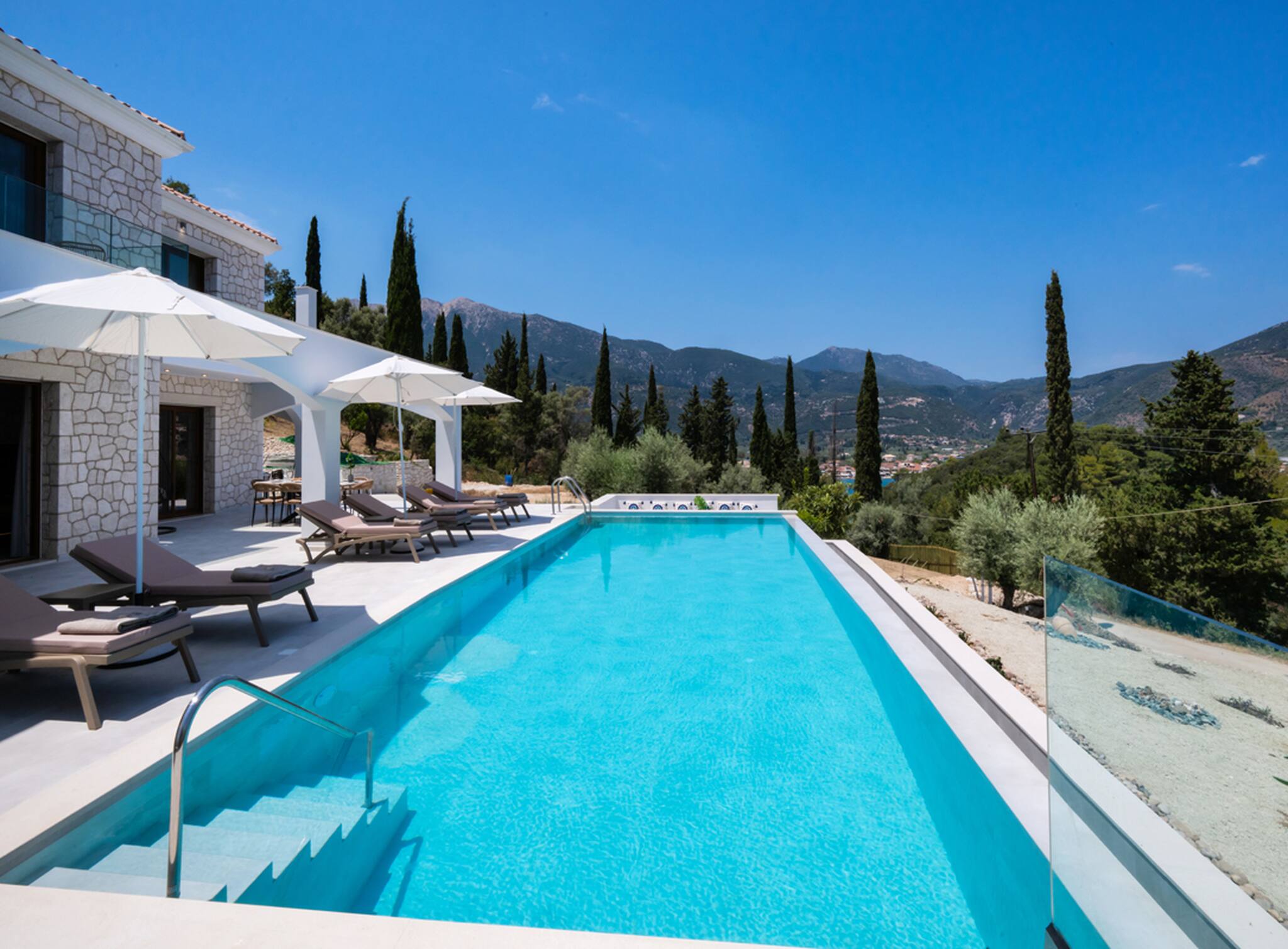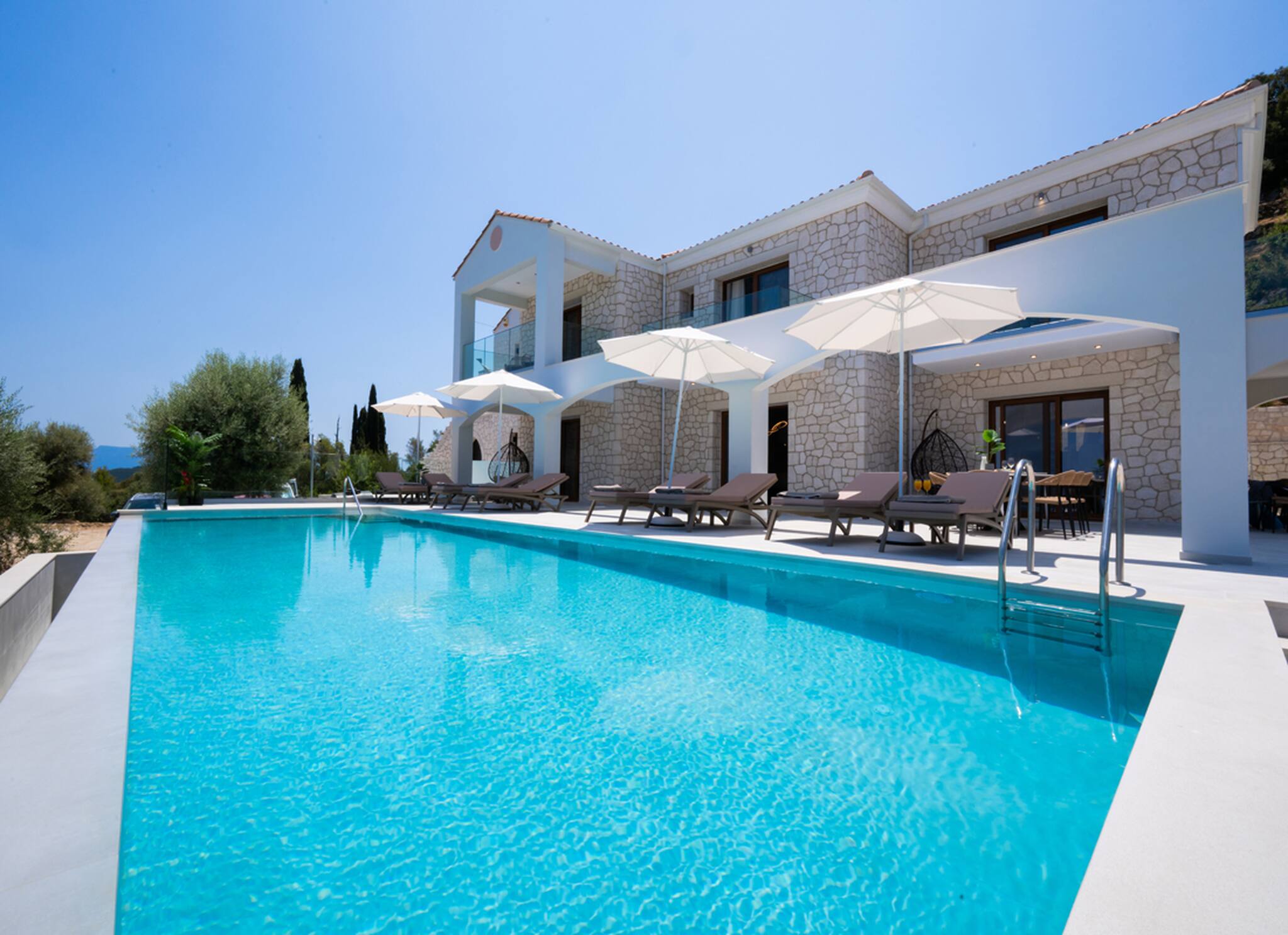 Located on the lush green mountainside and engulfed naturally amongst the olive groves of Geni Bay is our brand new, Villa Unique. This private property oozes calmness and its design blends naturally with its surrounding environment. Floor-to-ceiling glass doors flood the interiors with natural light creating a Greek Luxury Villa Holiday experience like no other.
