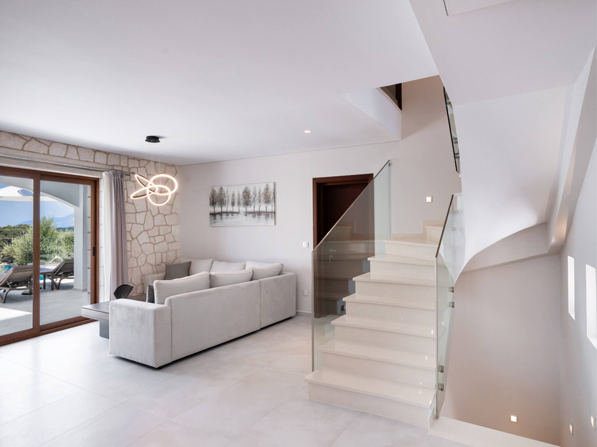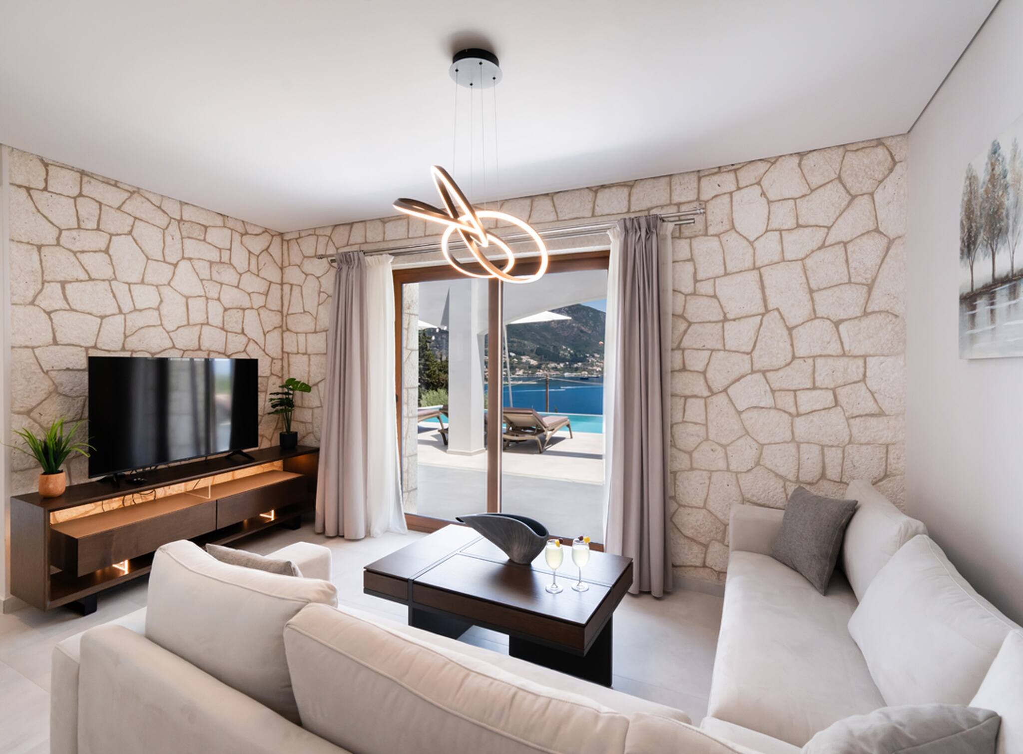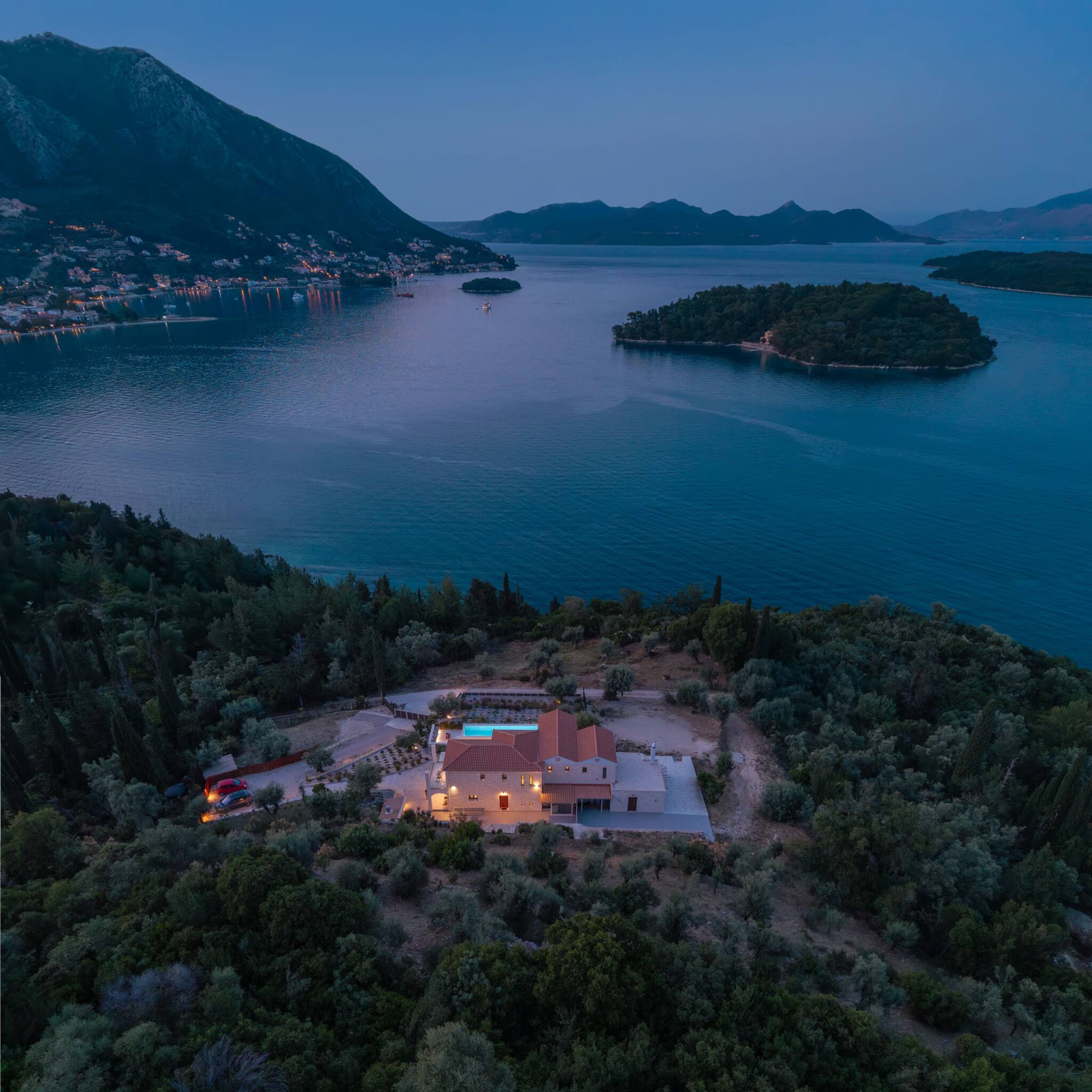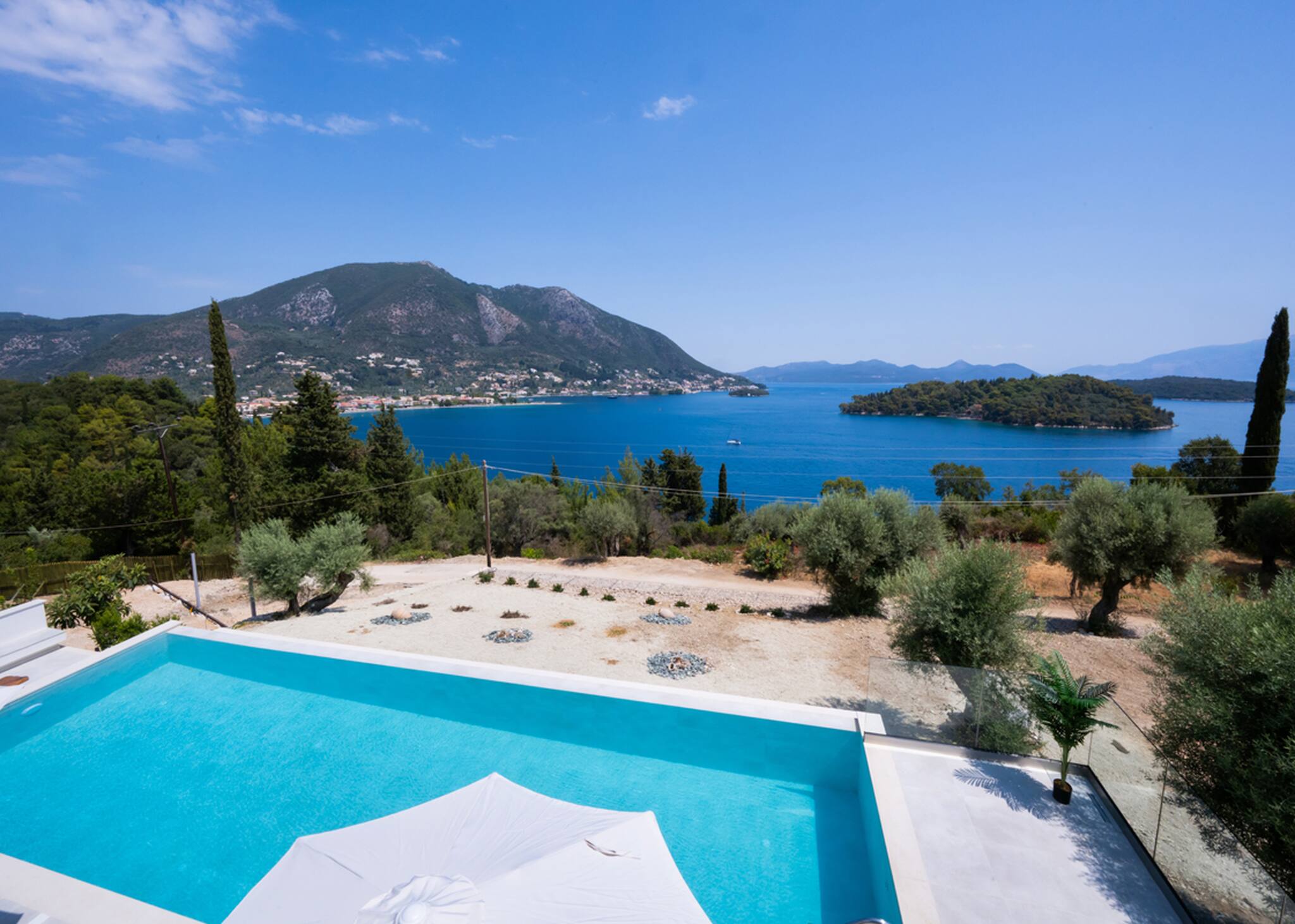 Located on the lush green mountainside and engulfed naturally amongst the olive groves of Geni Bay is our brand new, Villa Unique. This private property oozes calmness and its design blends naturally with its surrounding environment. Floor-to-ceiling glass doors flood the interiors with natural light creating a Greek Luxury Villa Holiday experience like no other.