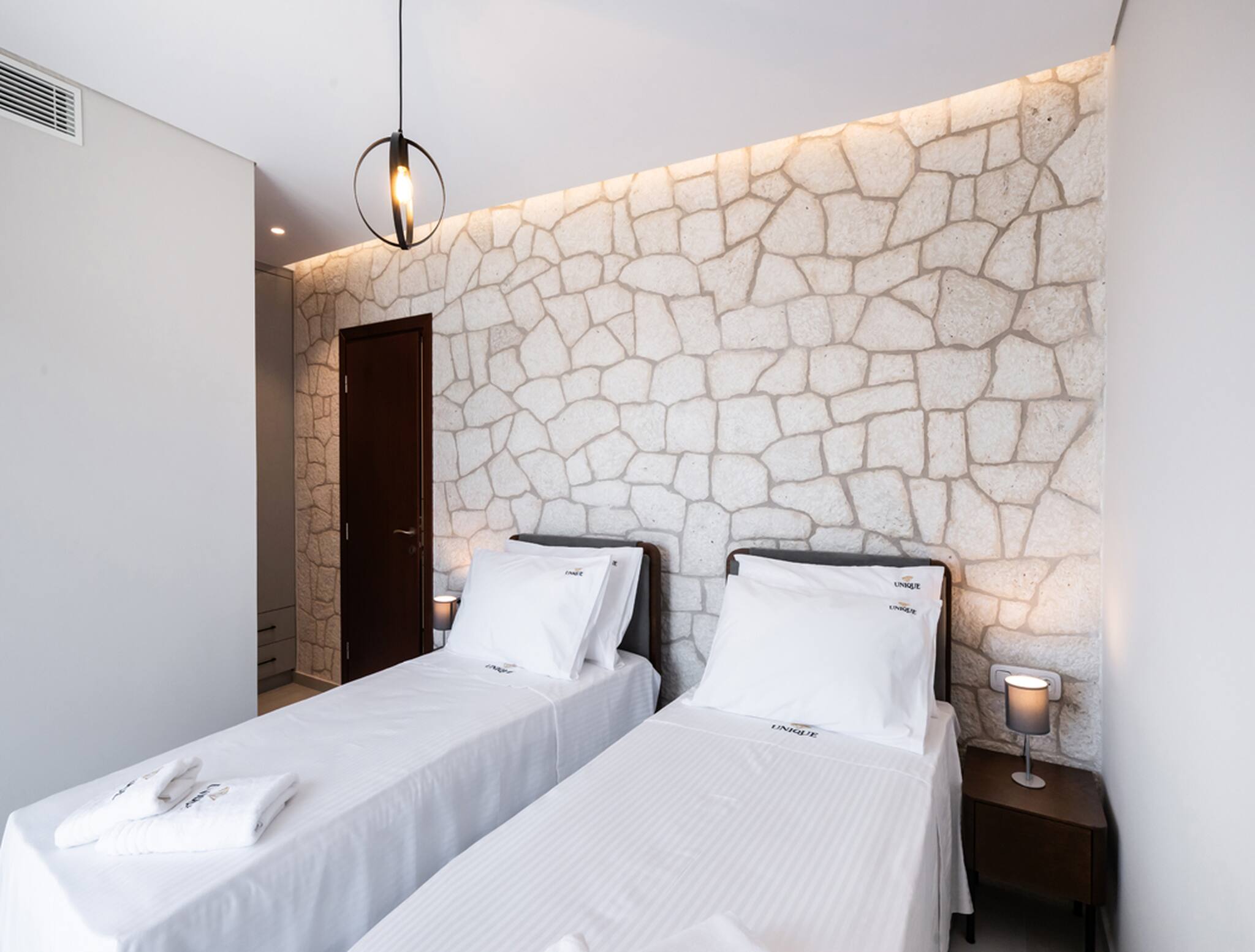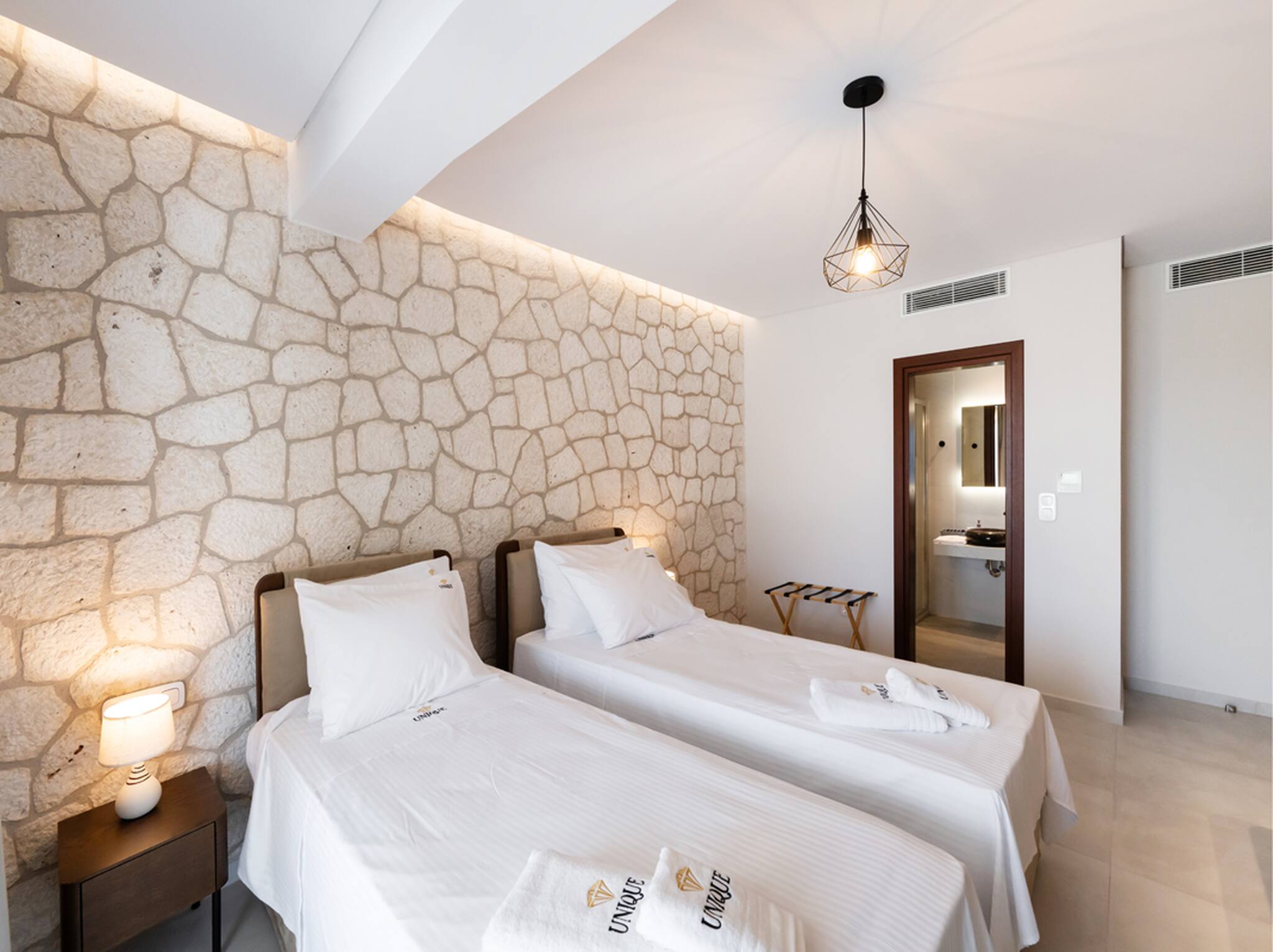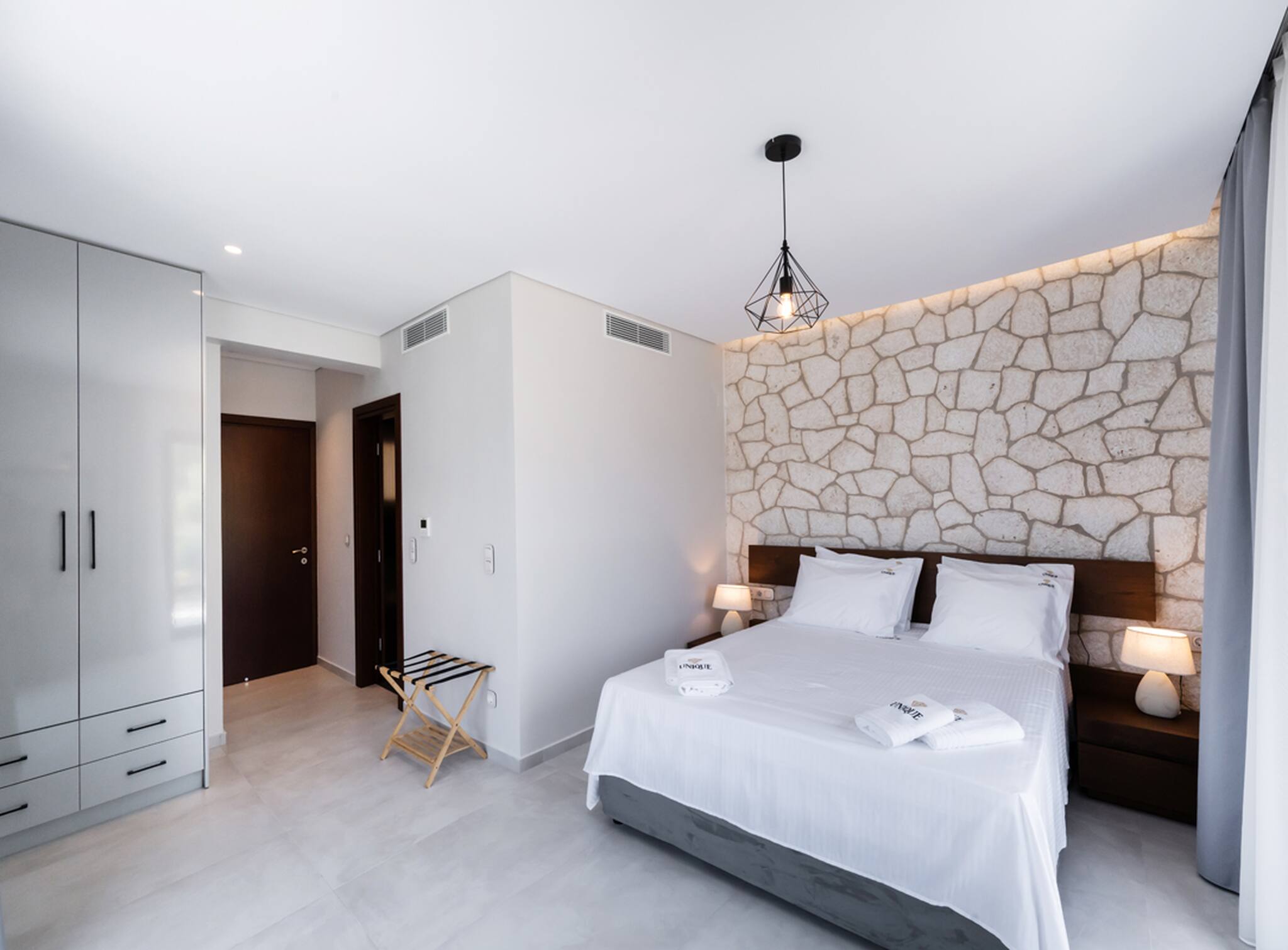 Upon entering Villa Unique, you come into the large living space which will take you away with its indoor-outdoor synergy created from the floor-to-ceiling window sliding doors. The space in front of you consists of a spacious kitchen with dining island and a spacious lounge area. The selective furniture oozing luxury and comfort adds to the one-of-a-kind character of Villa Unique. At the far end of the ground floor level is the first of the four bedrooms. The bedroom consists of a double bed and the convenience of an ensuite bathroom. All this space has direct access to the outdoor area of Villa Unique.