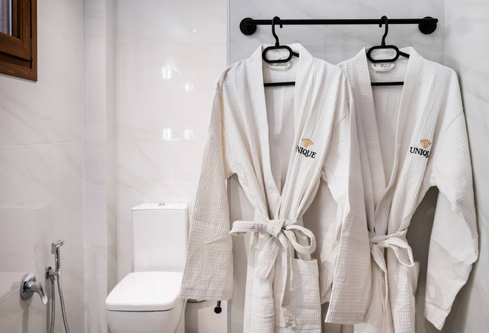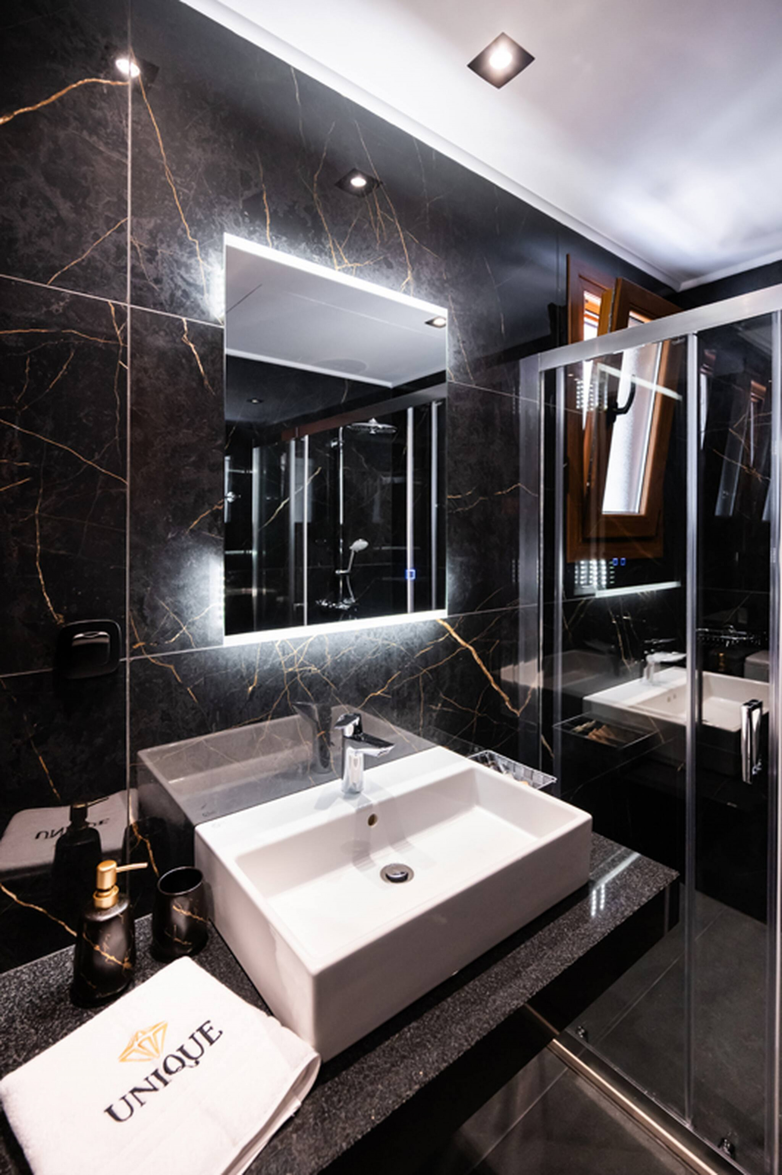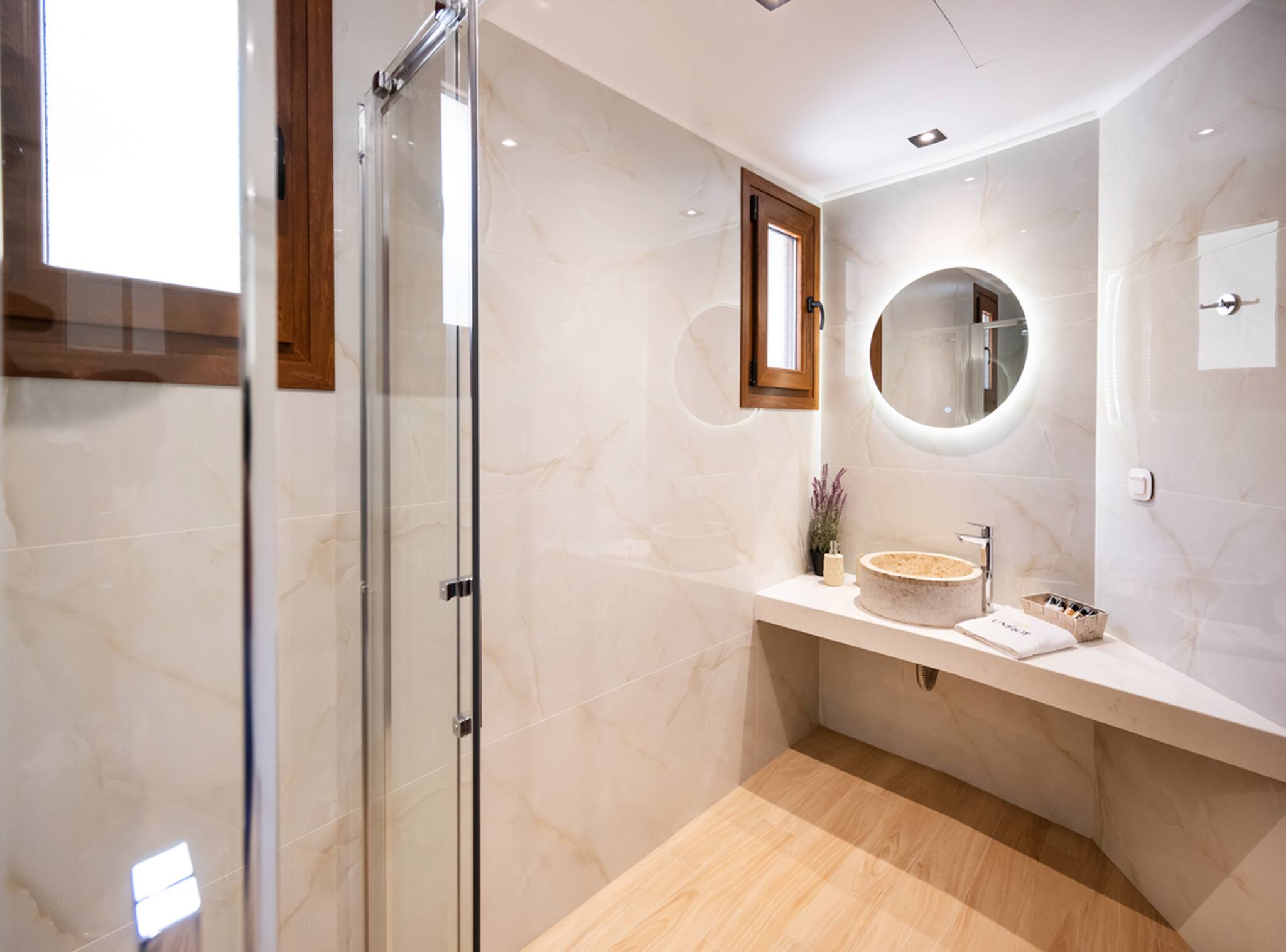 Upon entering Villa Unique, you come into the large living space which will take you away with its indoor-outdoor synergy created from the floor-to-ceiling window sliding doors. The space in front of you consists of a spacious kitchen with dining island and a spacious lounge area. The selective furniture oozing luxury and comfort adds to the one-of-a-kind character of Villa Unique. At the far end of the ground floor level is the first of the four bedrooms. The bedroom consists of a double bed and the convenience of an ensuite bathroom. All this space has direct access to the outdoor area of Villa Unique.
