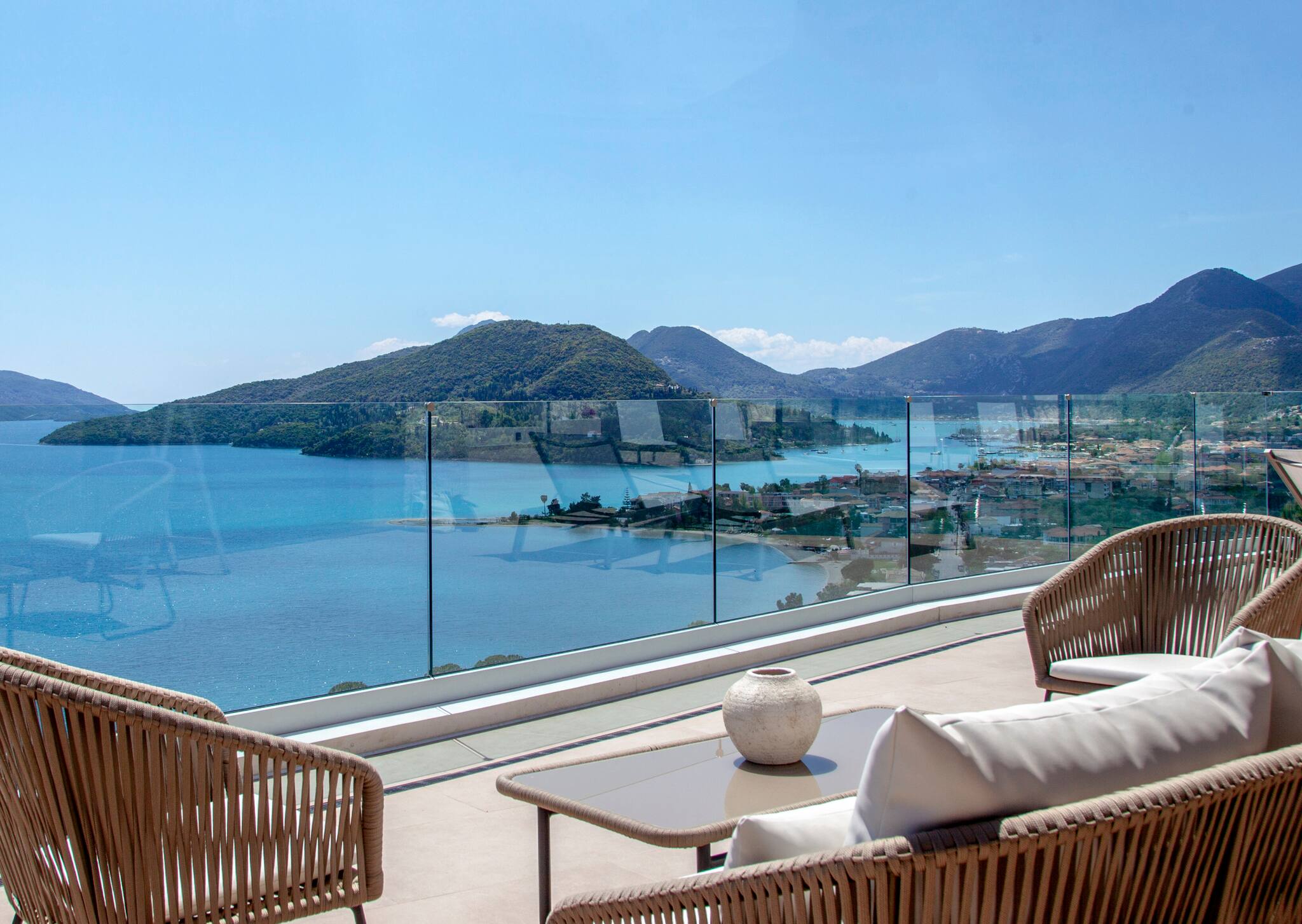 Villa Orama in Lefkada, is perched on the mountain side overlooking the bay of Perigiali and Nidri, with the luxury of being walking distance to Passa Beach.