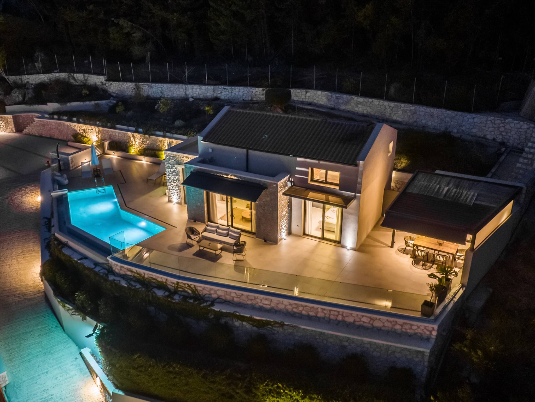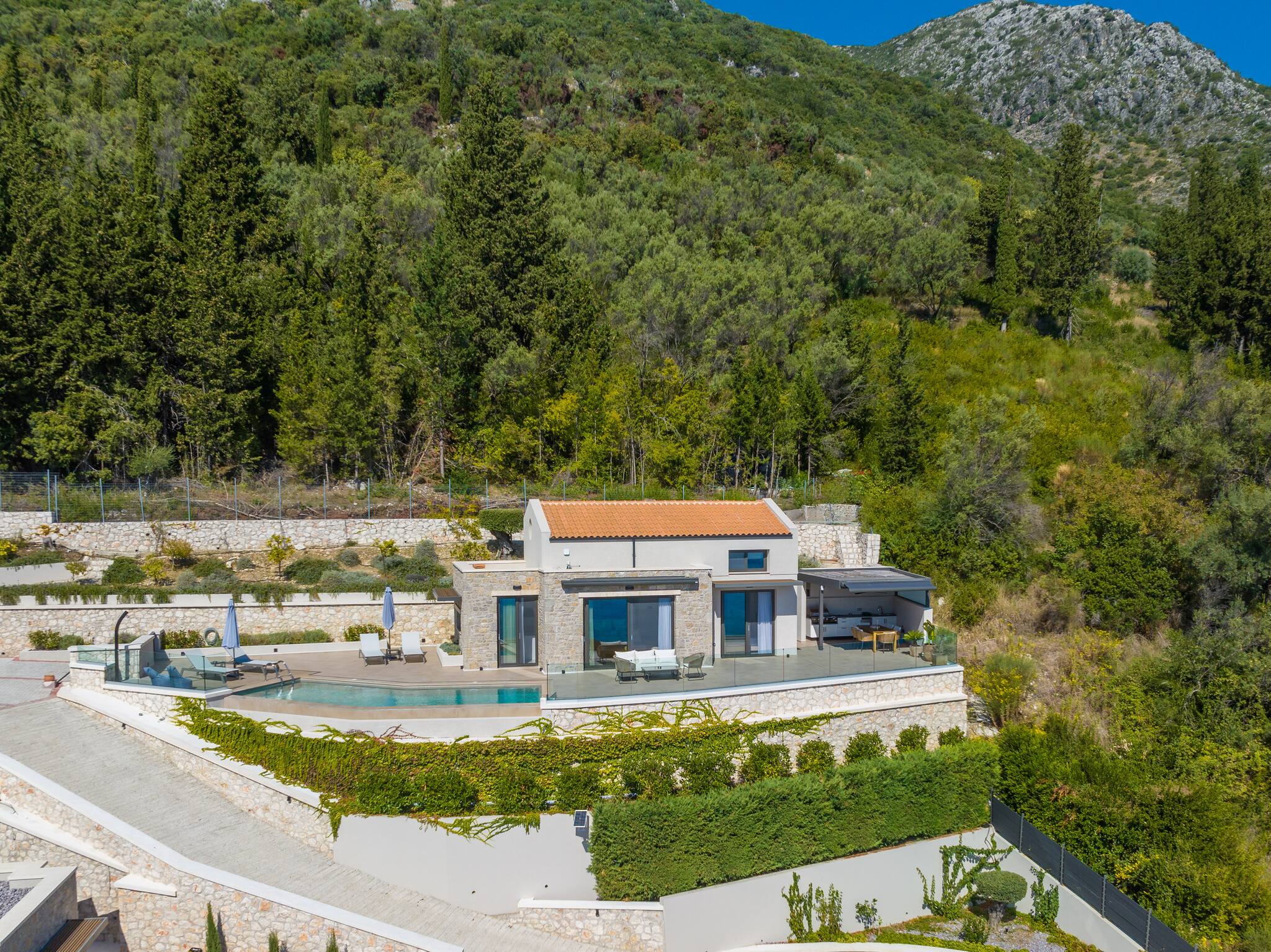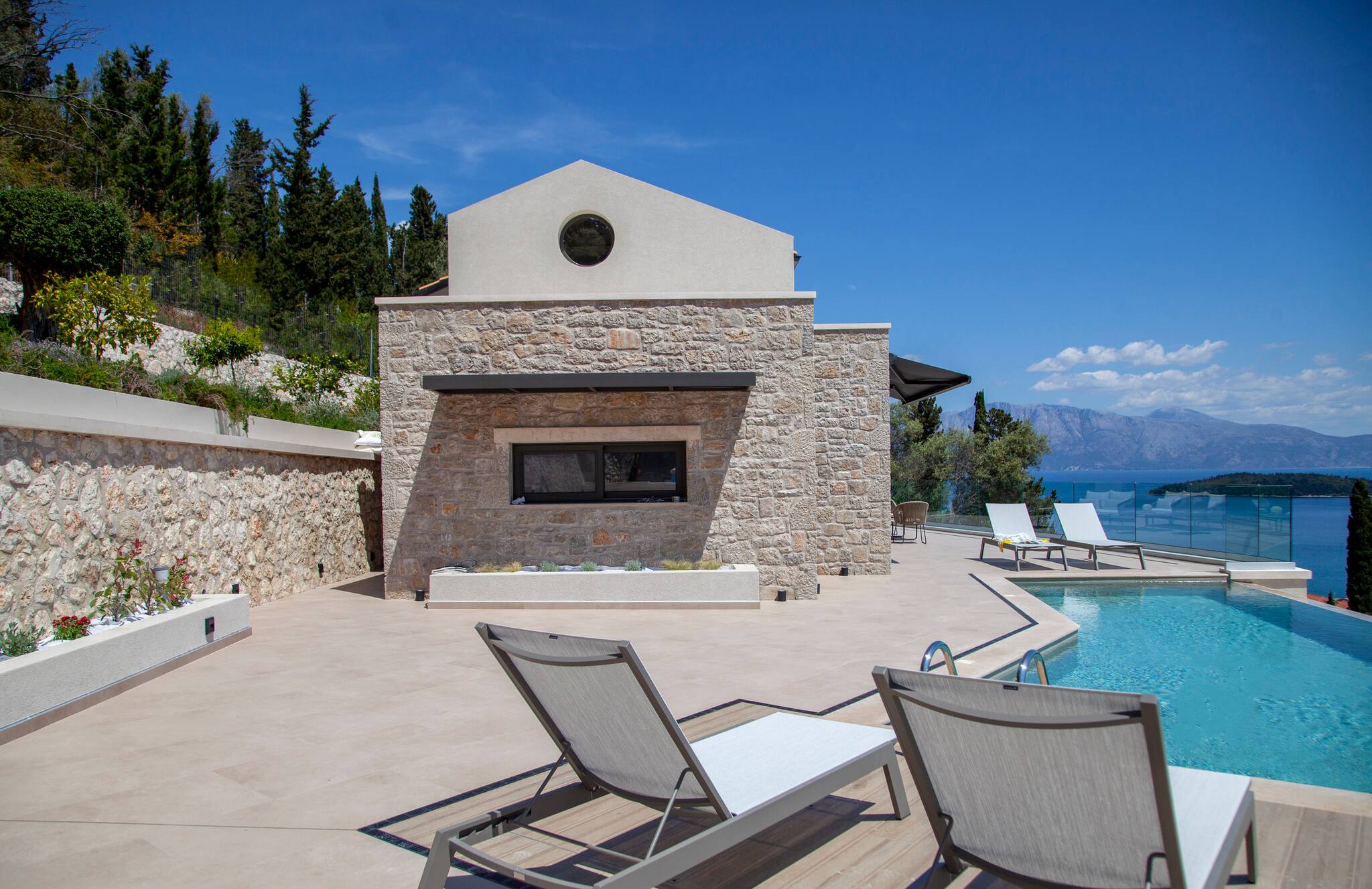 As you venture to the back, be greeted by a private balcony and pool area adorned with comfortable sunbeds. Here, you can bask in the splendor of the panoramic views that flawlessly complement the villa’s modern design. Immerse yourself in serenity, embracing the captivating surroundings while luxuriating in the refreshing waters of the pool. Villa Orama invites you to relish in the pinnacle of relaxation and sophistication, where every detail has been meticulously crafted to ensure an unforgettable stay.