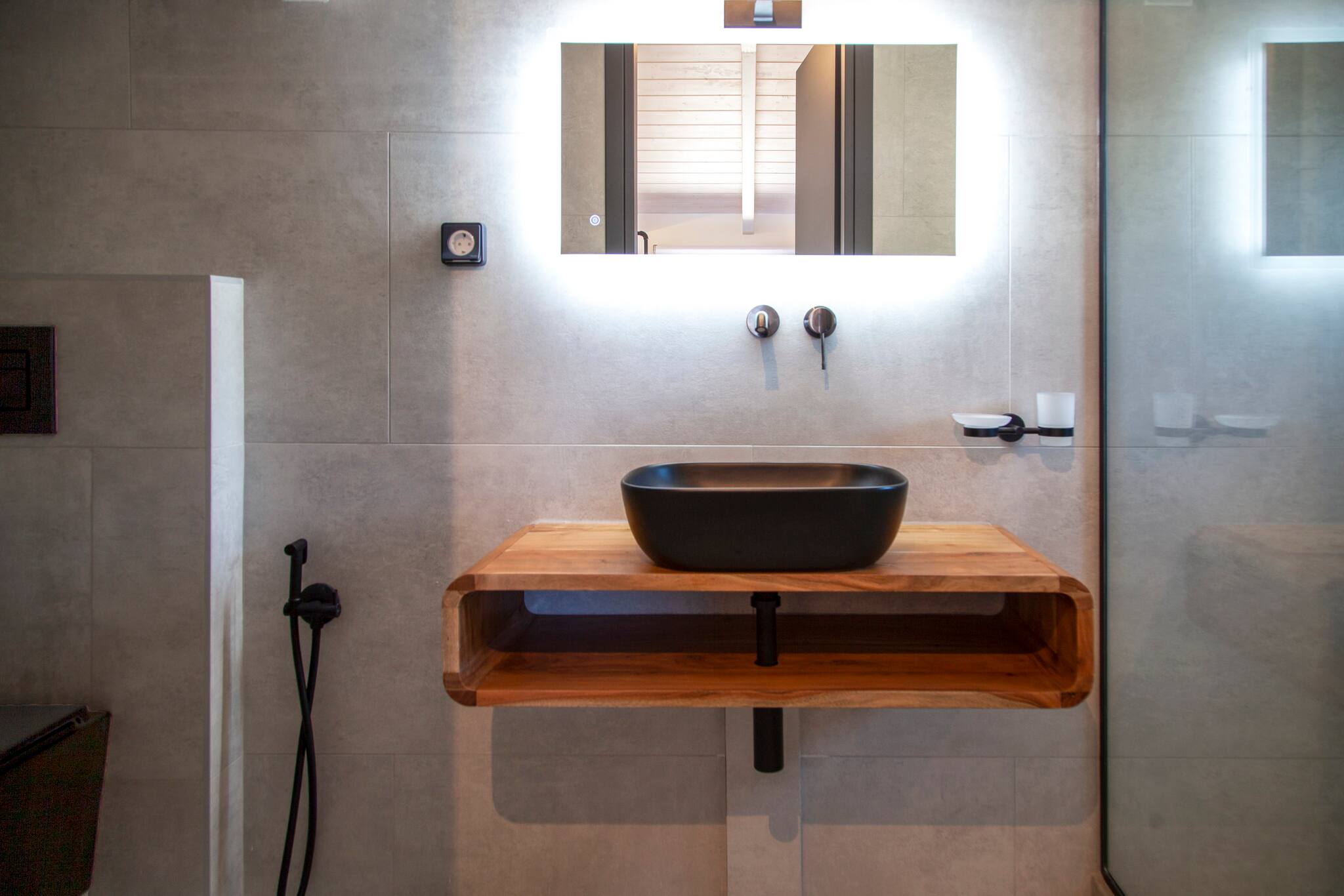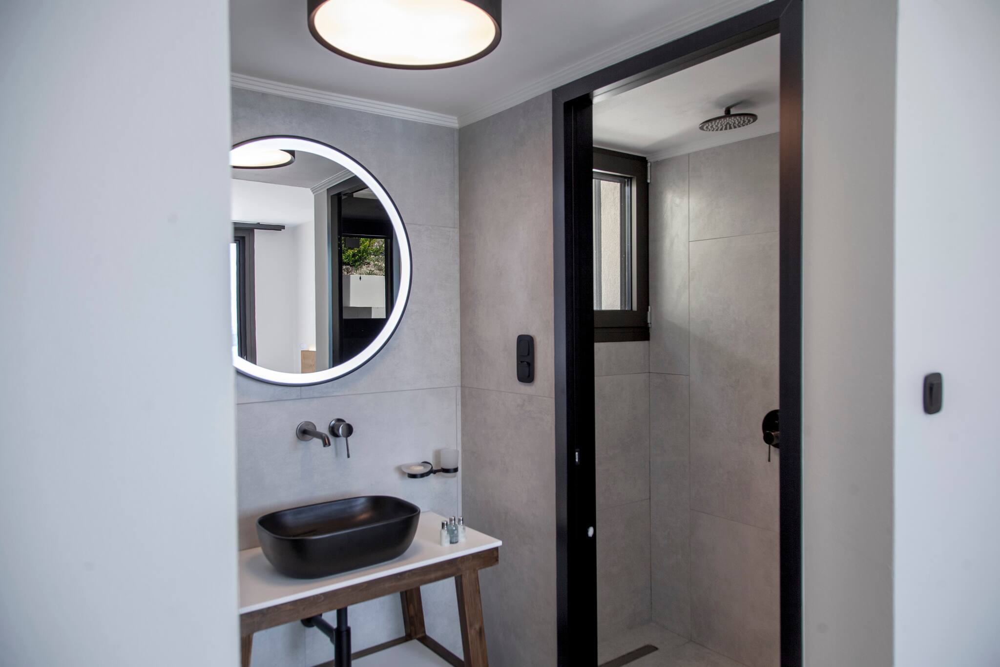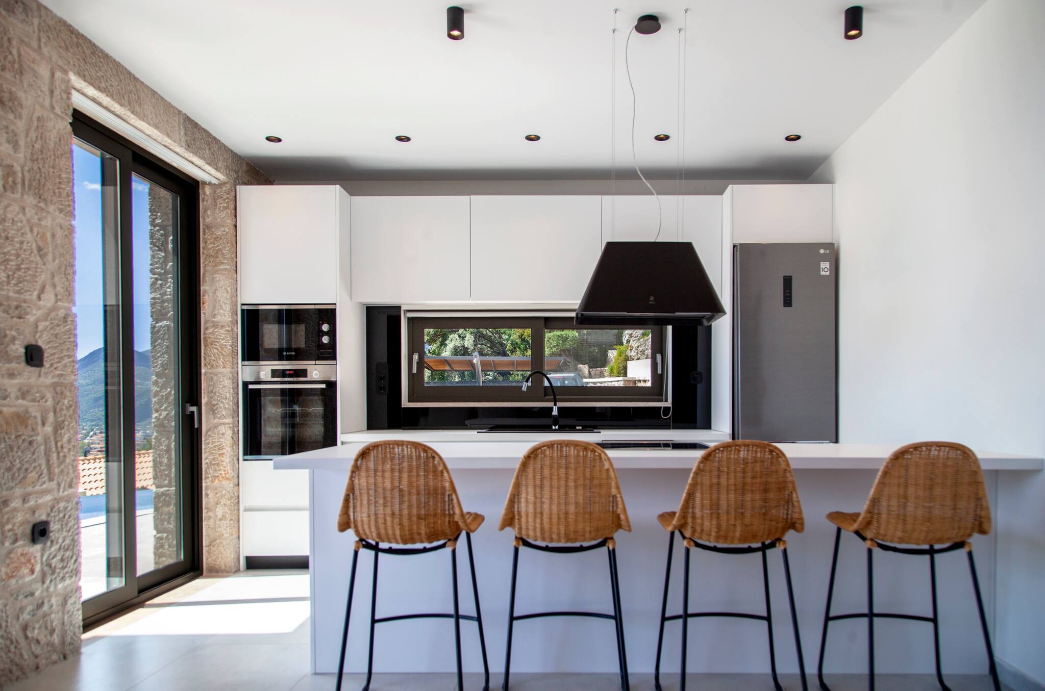 As you venture to the back, be greeted by a private balcony and pool area adorned with comfortable sunbeds. Here, you can bask in the splendor of the panoramic views that flawlessly complement the villa’s modern design. Immerse yourself in serenity, embracing the captivating surroundings while luxuriating in the refreshing waters of the pool. Villa Orama invites you to relish in the pinnacle of relaxation and sophistication, where every detail has been meticulously crafted to ensure an unforgettable stay.