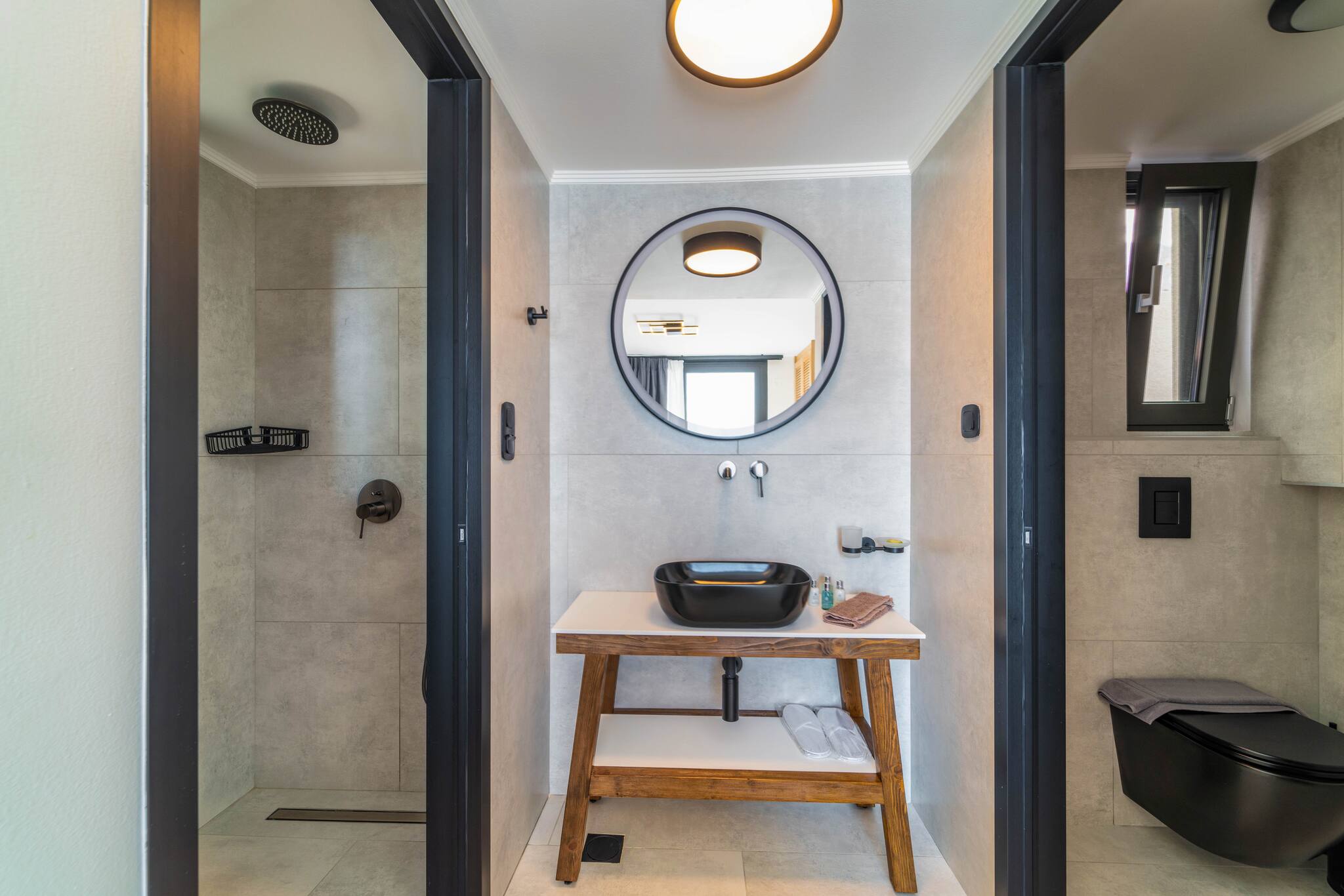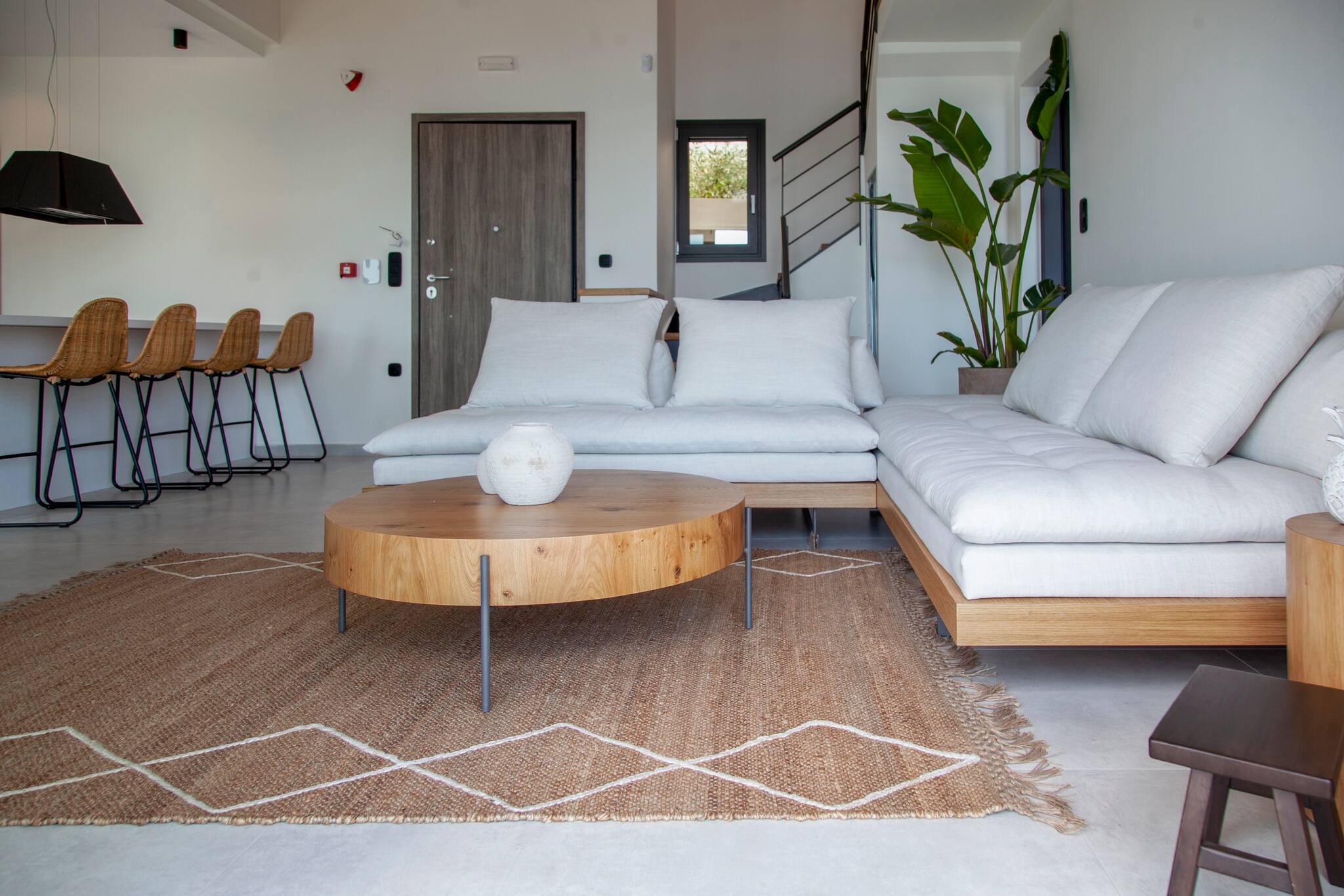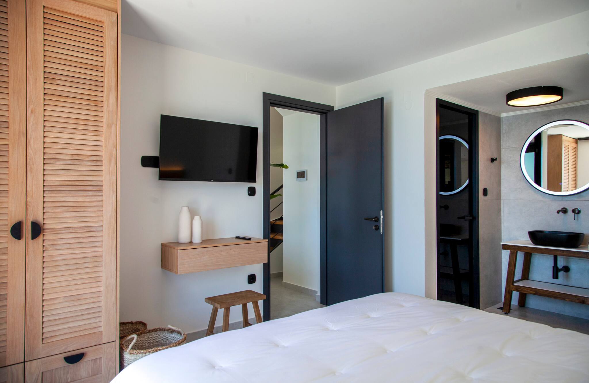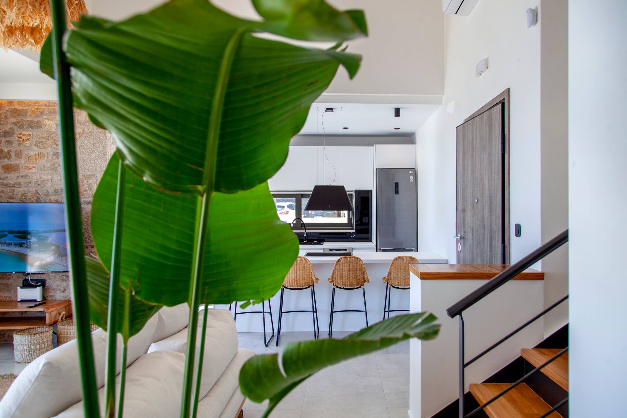 Step into Villa Phaena and be greeted by a stylish layout. To your right, a fully-equipped kitchen awaits, while the inviting living room beckons to your left. On the lower floor, discover a double bedroom with an ensuite bathroom, accessible through a door on the left.