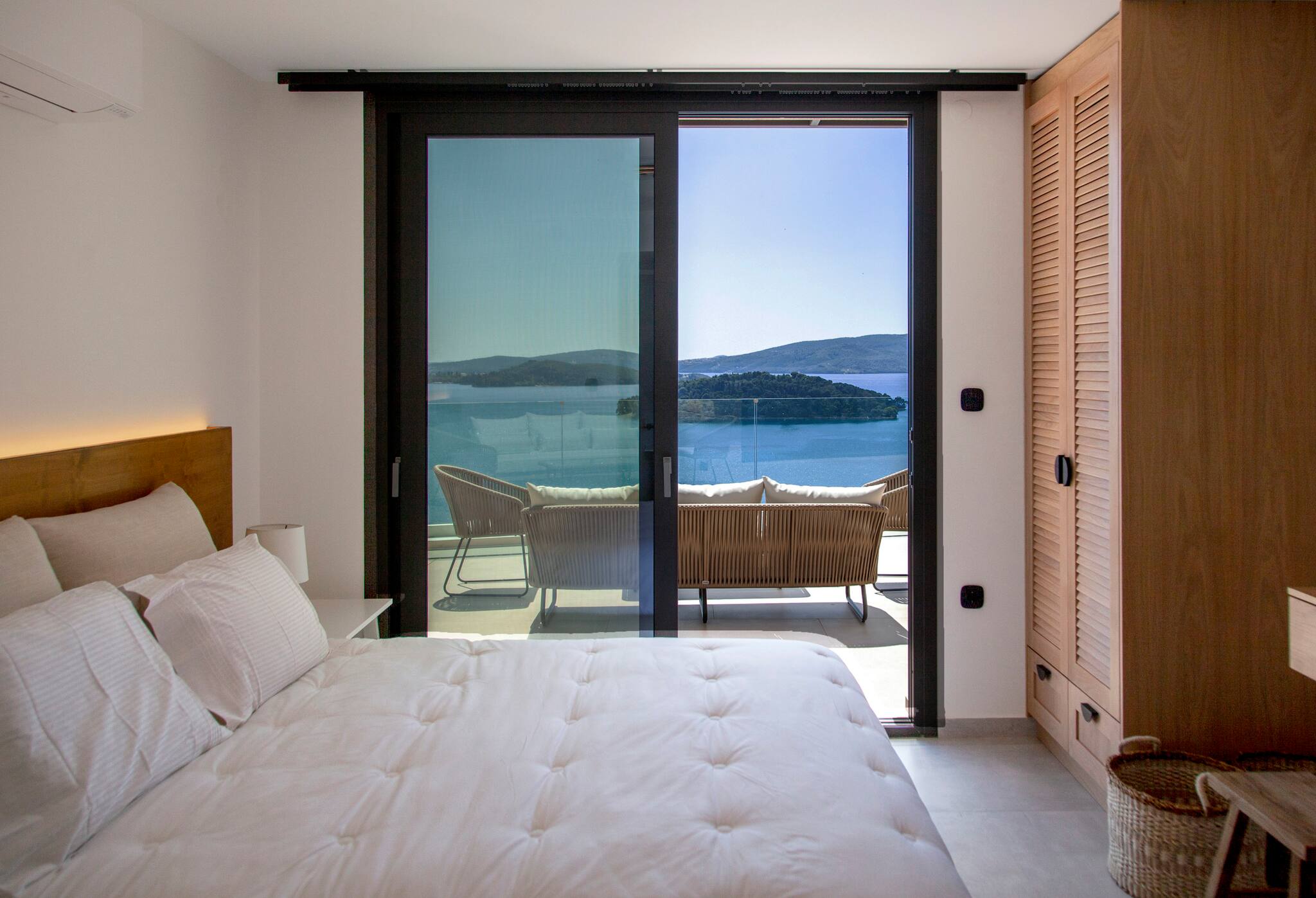 Step into the world of unparalleled luxury at Villa Onar. Be awestruck by the expansive living room adorned with soaring vaulted ceilings and large sliding glass doors, beckoning you to the breathtaking views of the mesmerizing Ionian Archipelagos and your private balcony and pool area. To the left, a fully-equipped kitchen awaits, boasting generous countertop space for culinary delights. To the right, a hallway leads you to a guest bathroom on your right with a shower and washing machine. To your right in the hallway you will see a stylish double bedroom with sliding glass doors leading to the private balcony and pool area. Welcome to a haven of opulence and tranquility at Villa Onar.