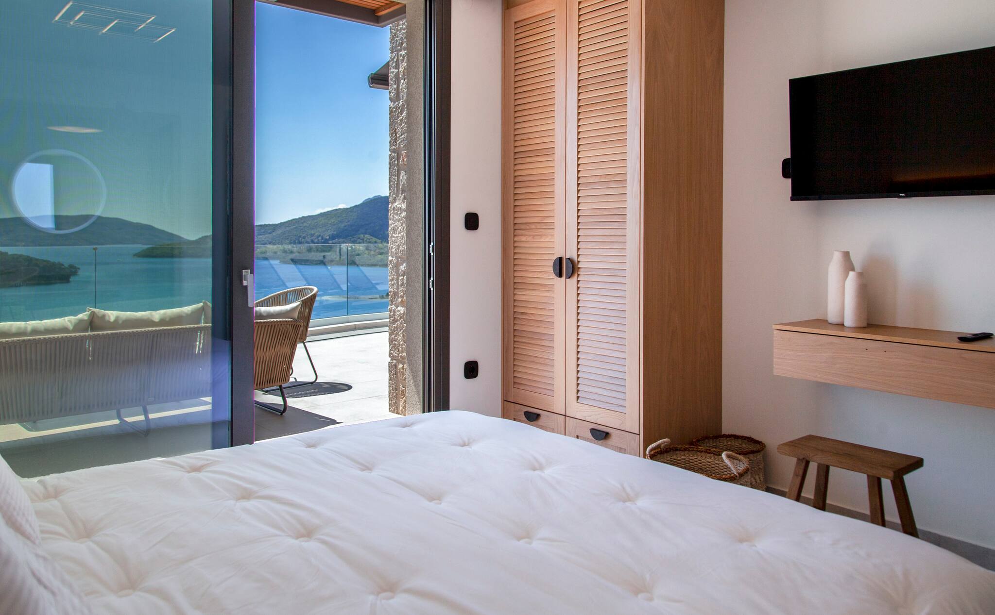 As you venture to the back, be greeted by a private balcony and pool area adorned with comfortable sunbeds. Here, you can bask in the splendor of the panoramic views that flawlessly complement the villa’s modern design. Immerse yourself in serenity, embracing the captivating surroundings while luxuriating in the refreshing waters of the pool. Villa Onar invites you to relish in the pinnacle of relaxation and sophistication, where every detail has been meticulously crafted to ensure an unforgettable stay.