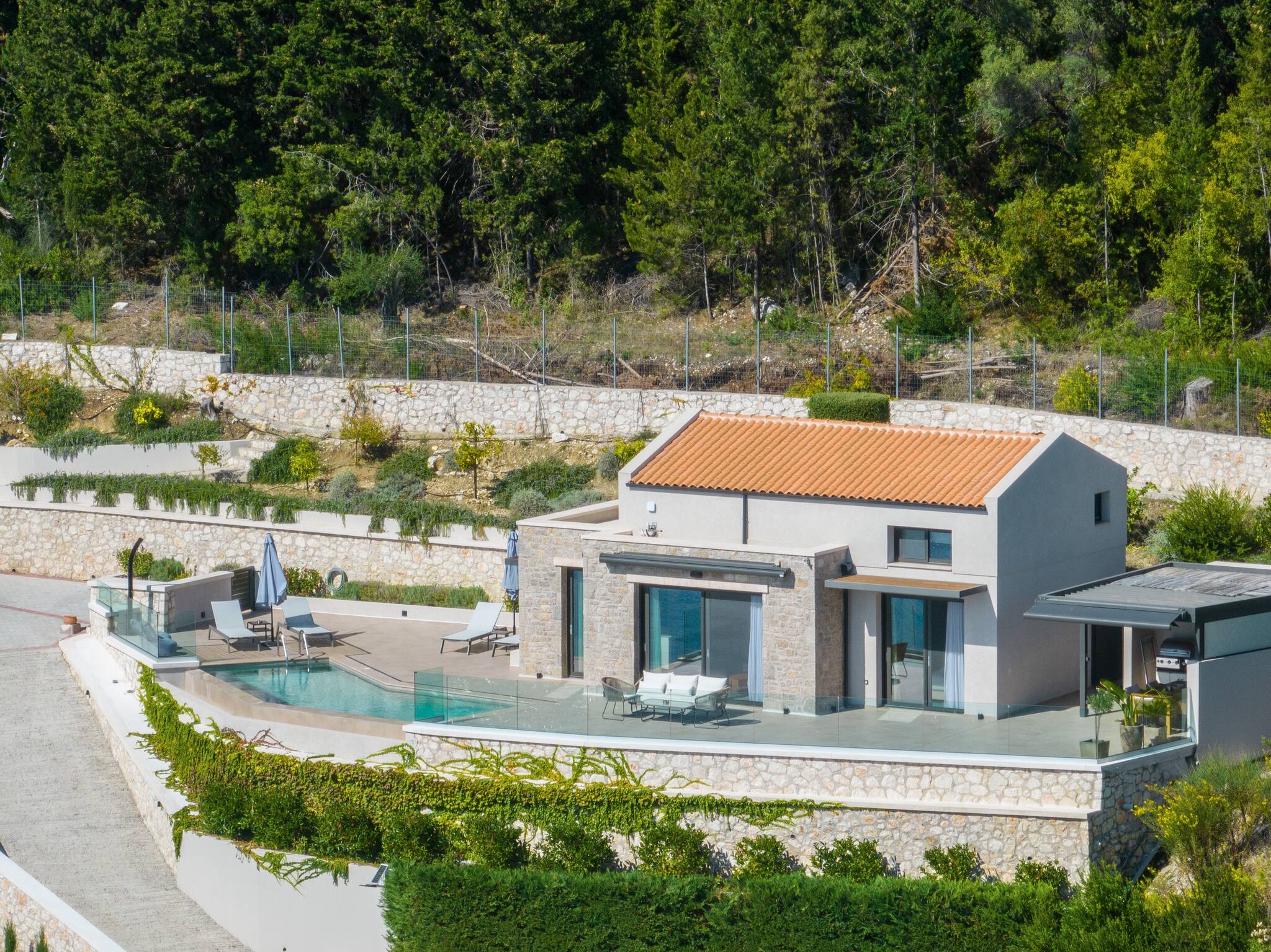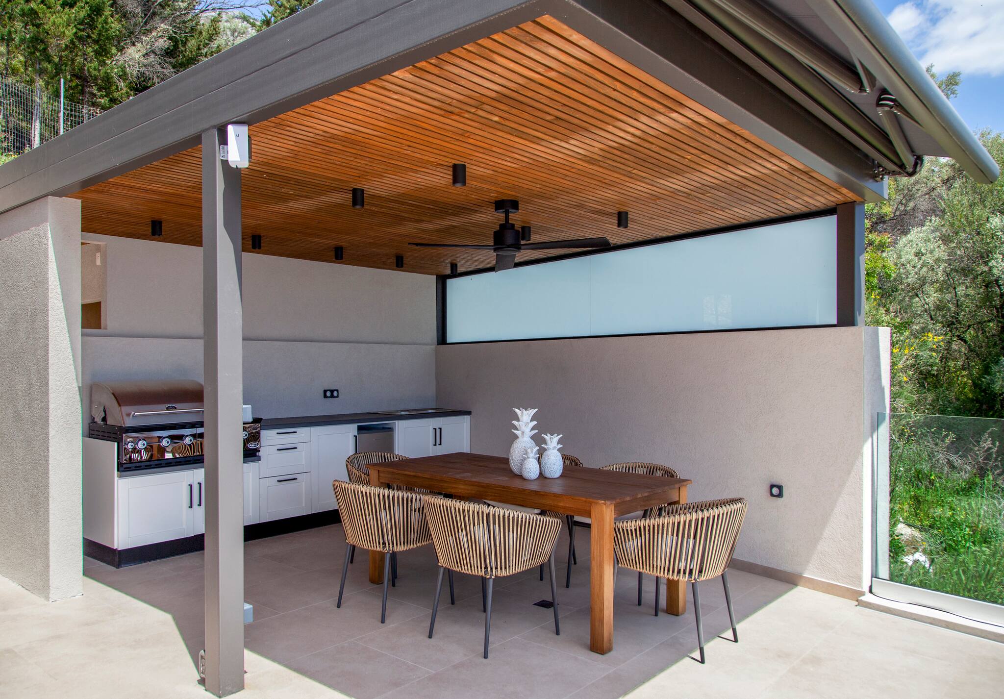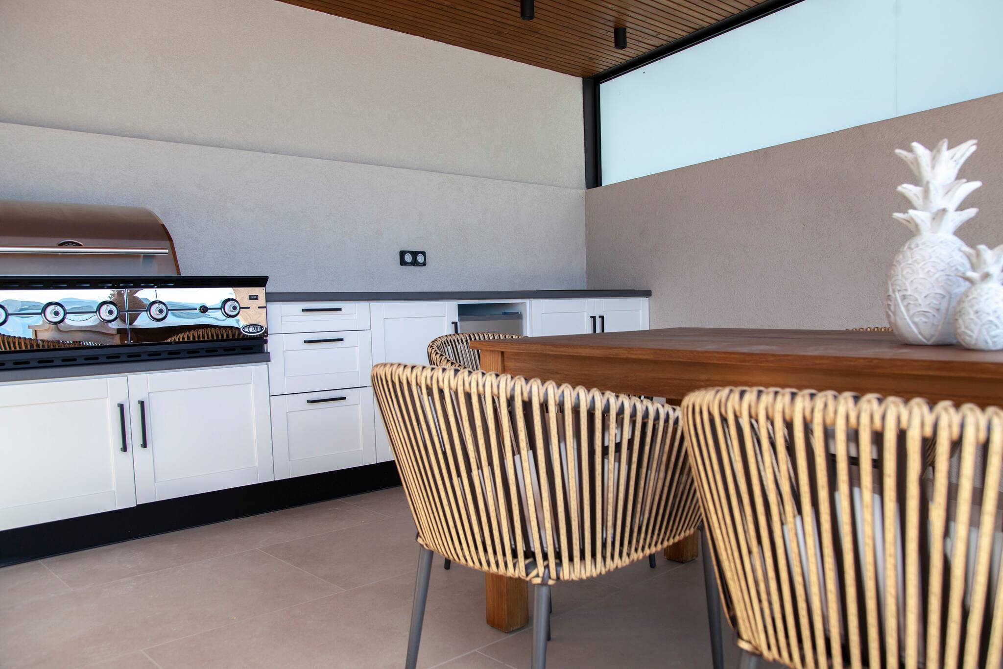 Villa Orama sets the stage for a truly luxurious experience, showcasing a harmonious blend of elegance and functionality. Step into the front of the villa, where a meticulously designed barbecue and outdoor dining area awaits, surrounded by a privacy fence and ample seating. Indulge in unforgettable moments, savoring delectable meals amidst the enchanting ambiance of a Greek evening, in the company of your cherished family or friends.