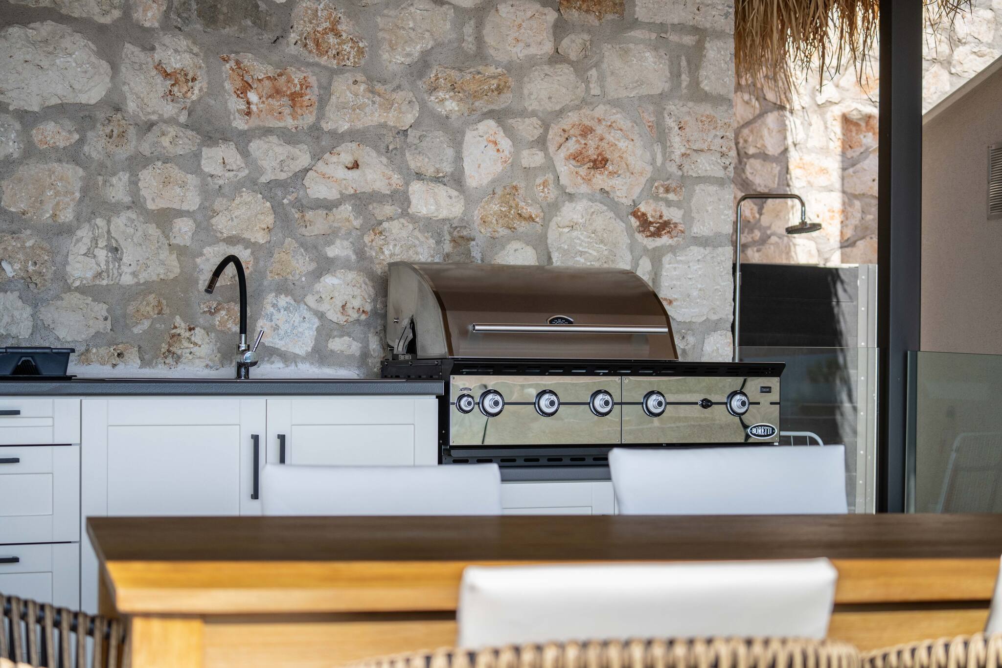 Villa Onar sets the stage for a truly luxurious experience, showcasing a harmonious blend of elegance and functionality. Step into the front of the villa, where a meticulously designed barbecue and outdoor dining area awaits, surrounded by a privacy fence and ample seating. Indulge in unforgettable moments, savoring delectable meals amidst the enchanting ambiance of a Greek evening, in the company of your cherished family or friends.