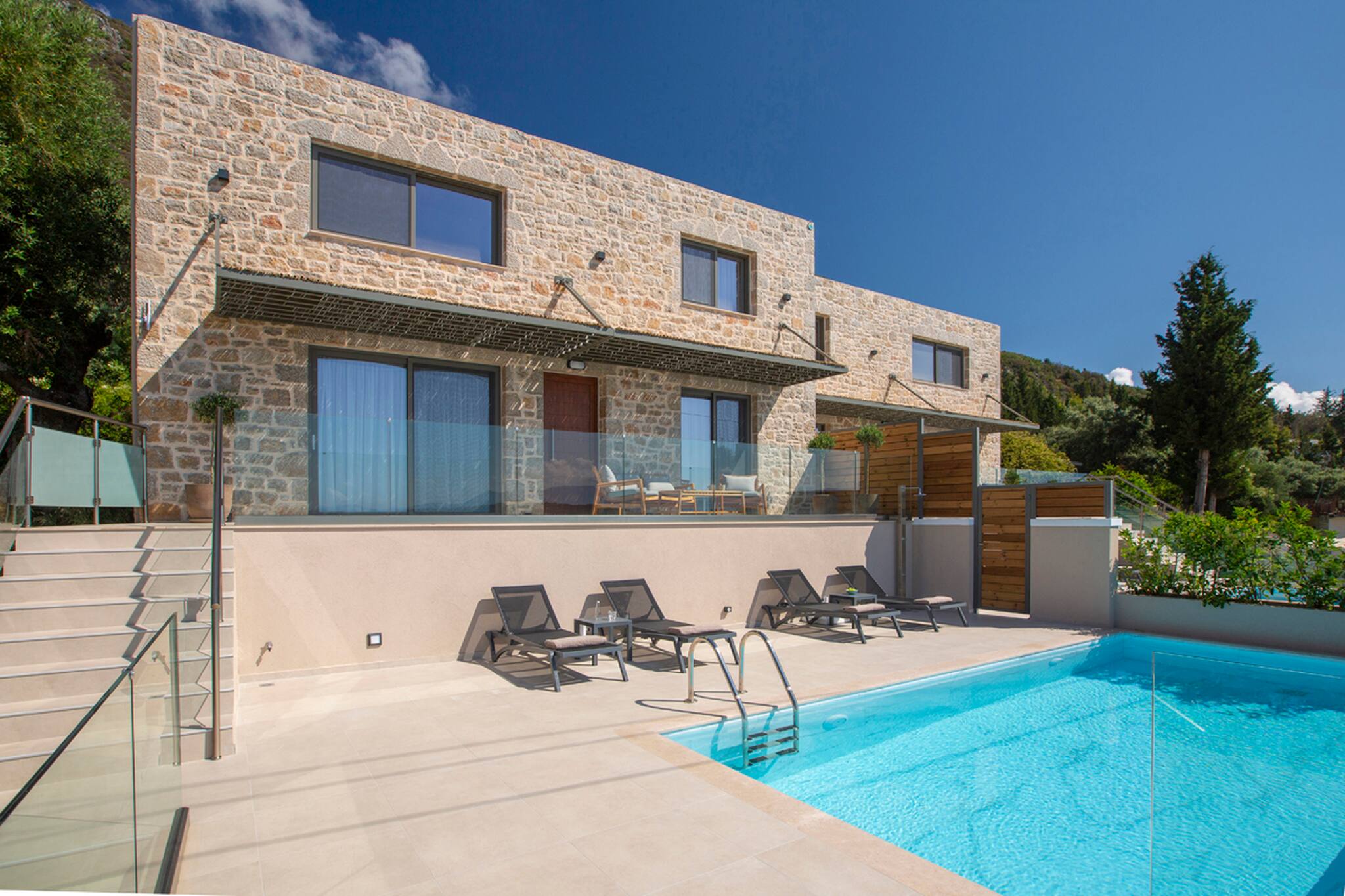 As you venture to the back, be greeted by a private balcony and pool area adorned with comfortable sunbeds. Here, you can bask in the splendor of the panoramic views that flawlessly complement the villa’s modern design. Immerse yourself in serenity, embracing the captivating surroundings while luxuriating in the refreshing waters of the pool. Villa Orama invites you to relish in the pinnacle of relaxation and sophistication, where every detail has been meticulously crafted to ensure an unforgettable stay.