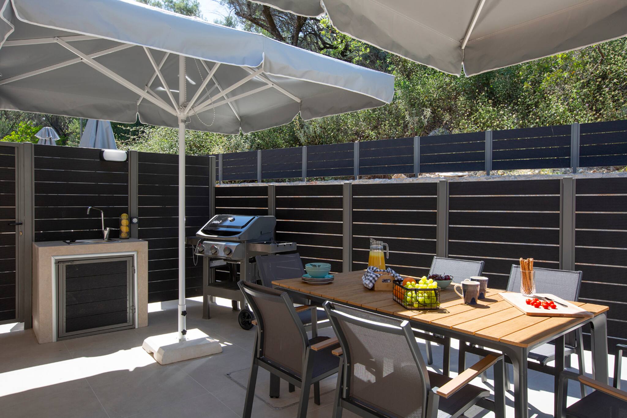 Villa Orama sets the stage for a truly luxurious experience, showcasing a harmonious blend of elegance and functionality. Step into the front of the villa, where a meticulously designed barbecue and outdoor dining area awaits, surrounded by a privacy fence and ample seating. Indulge in unforgettable moments, savoring delectable meals amidst the enchanting ambiance of a Greek evening, in the company of your cherished family or friends.