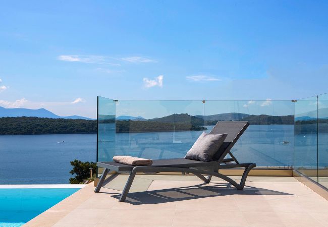 This unique place has a style all its Welcome to Villa Phaena, a luxurious hillside retreat in Nidri, Lefkada, Greece. Wake up to breathtaking sea views and indulge in the beauty of Scorpios and Meganisi islands. With large sliding glass doors opening to the outdoor pool and barbecue area, every moment at the infinity pool feels like a slice of heaven.