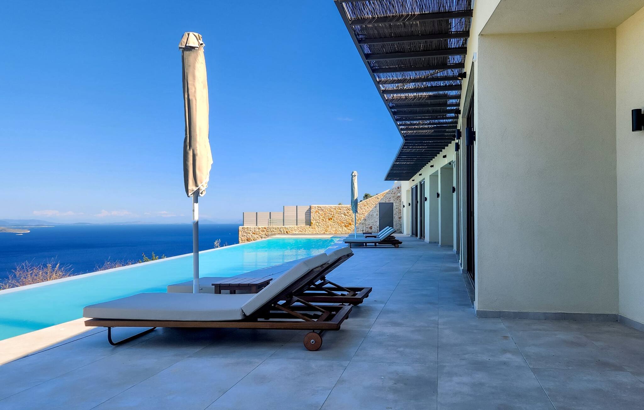 Symposium Infinity Villa goes above and beyond expectations when it comes to outdoor living. The infinity pool stretches across the entire front of the villa, offering breathtaking views of the Ionian Sea. It is impressively 27 meters long, making it one of the longest swimming pools of the Island. It’s the heart of the property, inviting you to relax, swim, and soak up the sun all day long.