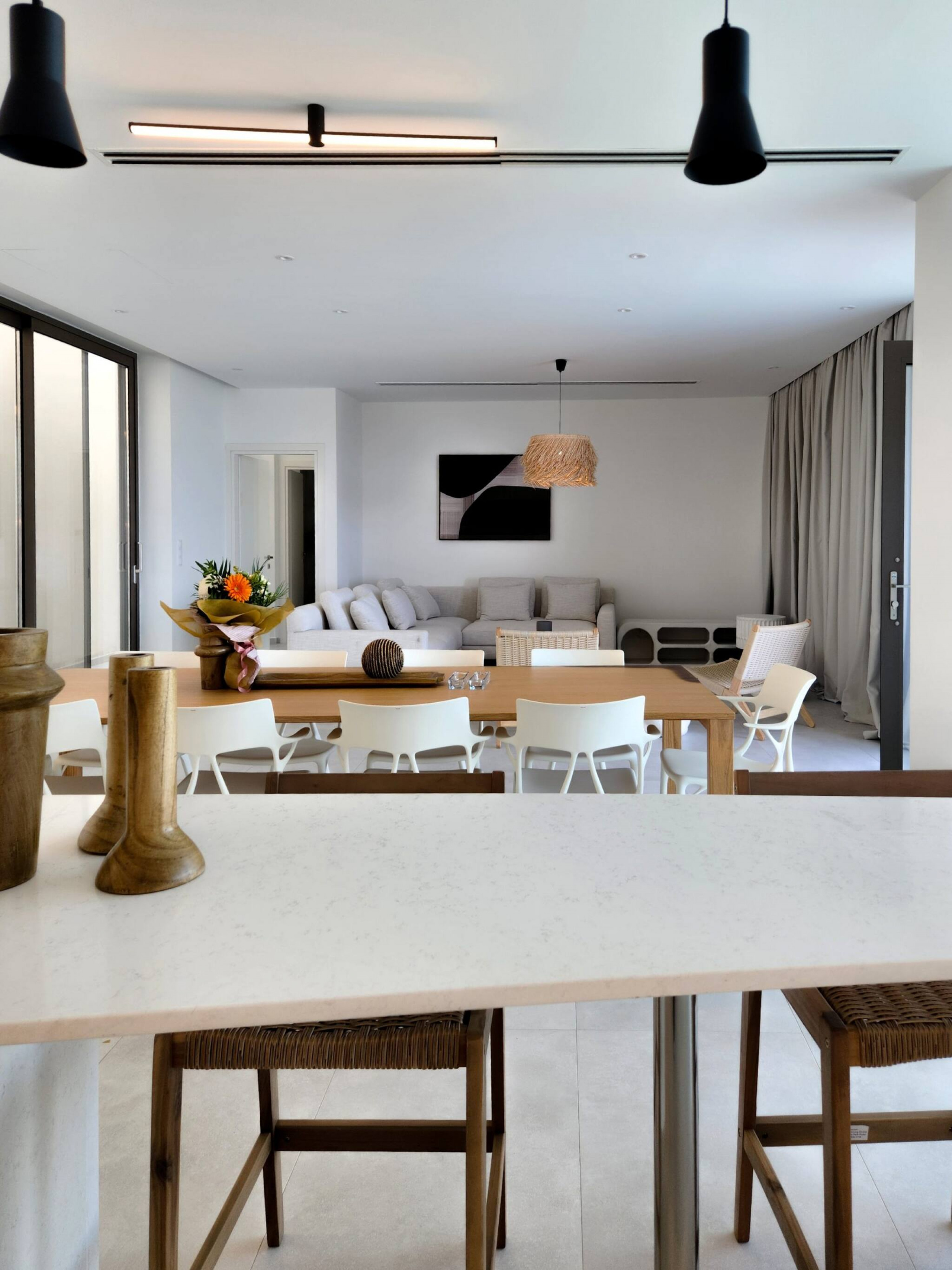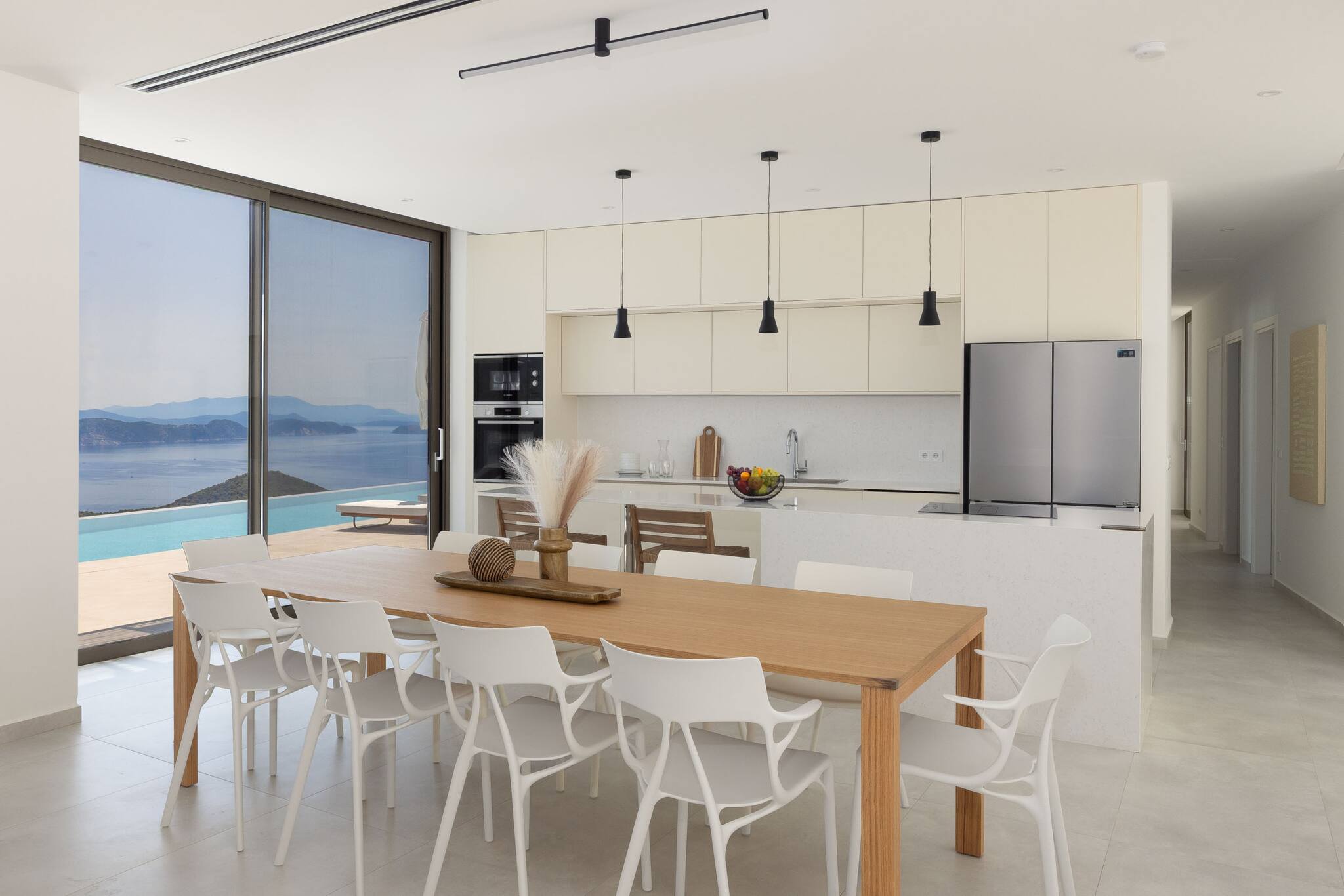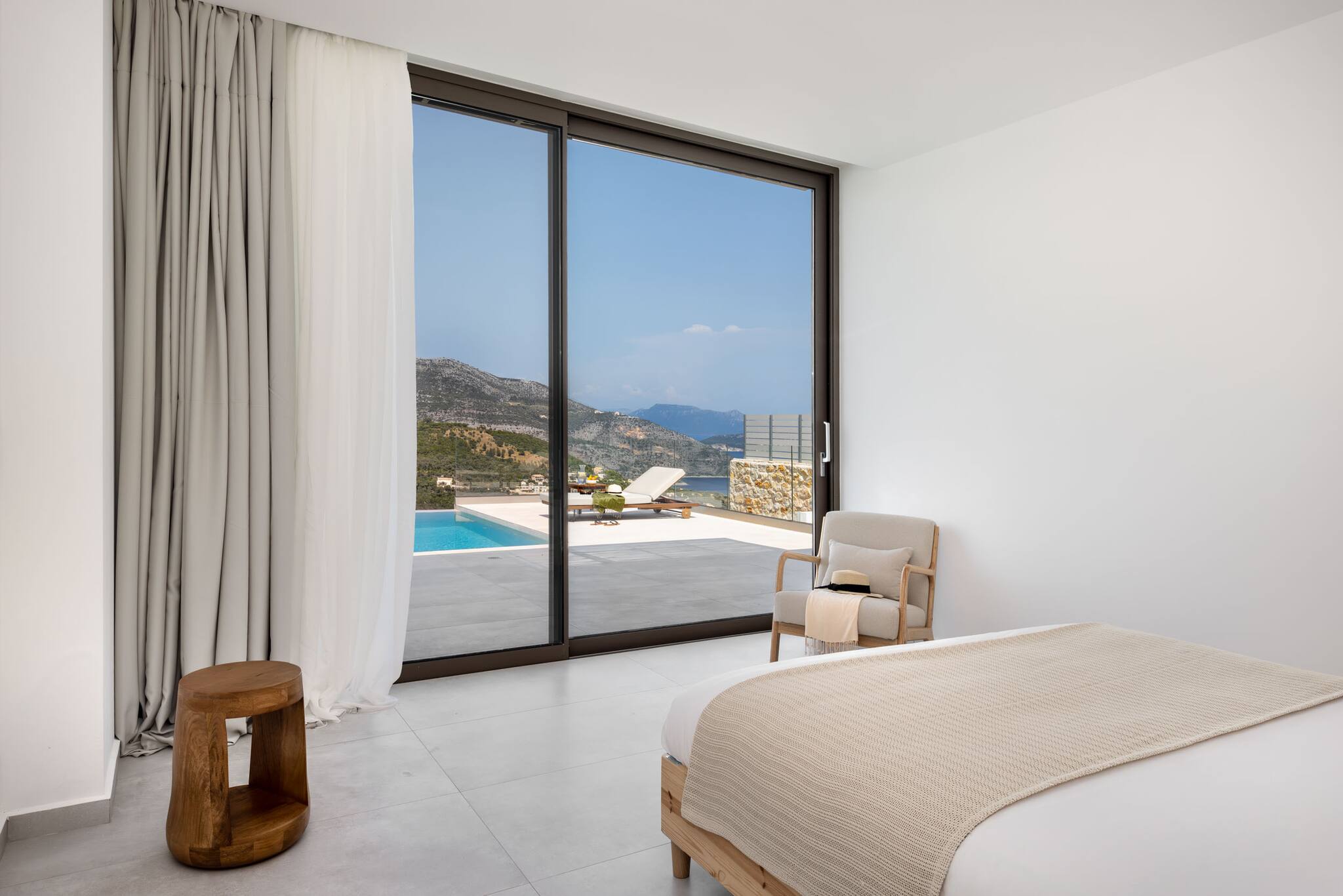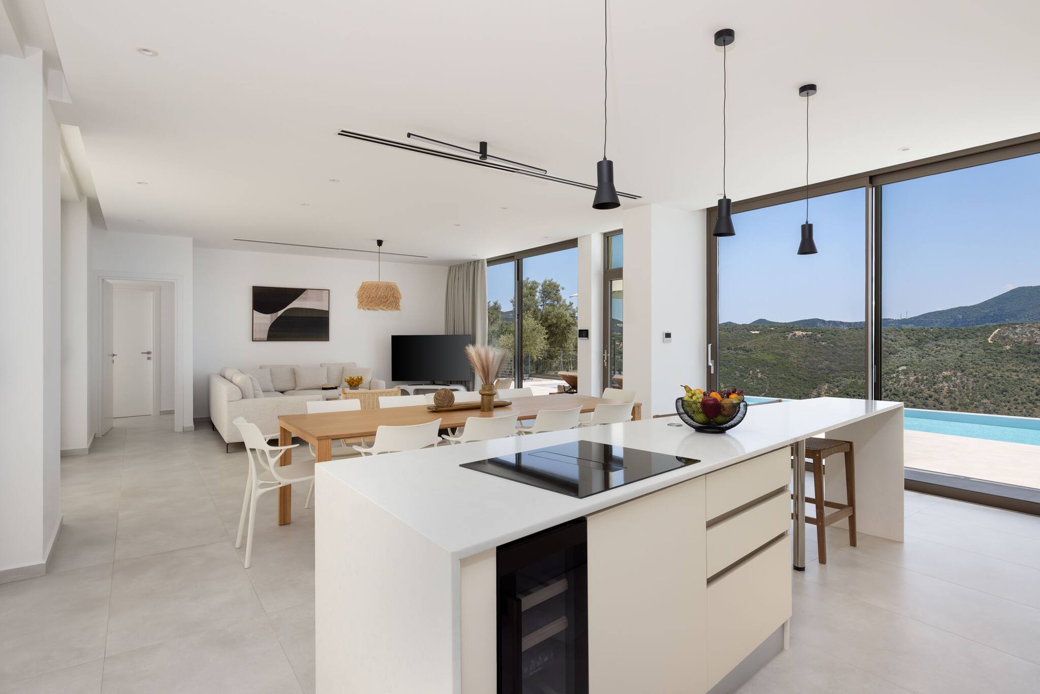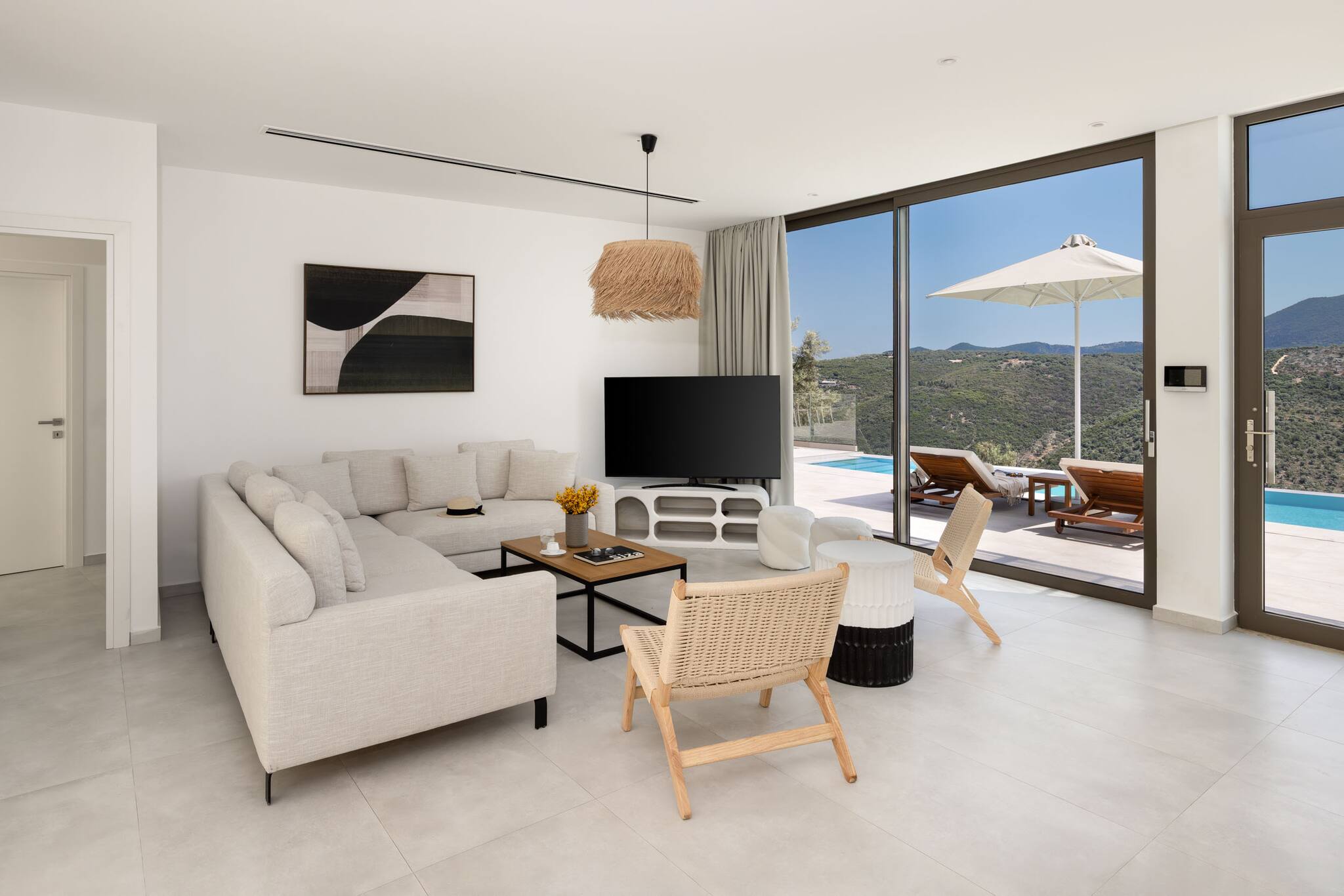Floor-to-ceiling glass doors line the back of the living area, opening straight onto the outdoor space and pool. These wide glass panels fill the villa with natural light and create a seamless indoor-outdoor living experience—the true essence of summer in Greece.