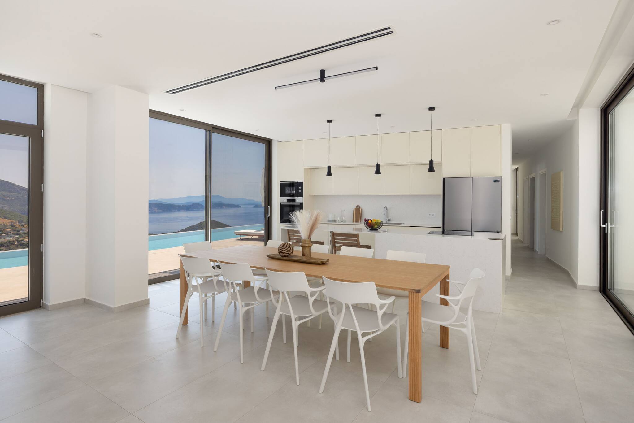 The floor to ceiling glass panel doors that line the front of the open living area give you direct access to the outdoor grounds and pool, but most importantly, allow for the natural summer sunlight to create the most amazing indoor-outdoor experience that is the feeling and true essence of summer lifestyle living in Greece.