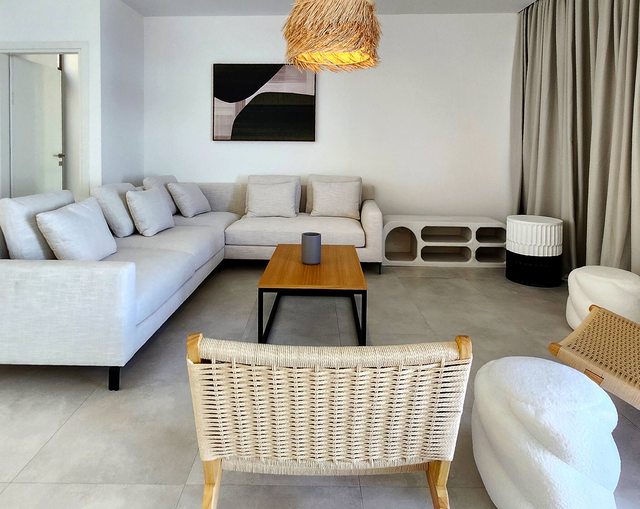 As you enter Symposium Infinity Villa, you’re welcomed into a bright, open-plan living space with high ceilings and a relaxing, luxurious feel. To your left is a fully equipped kitchen with a central island and bar stools—perfect for morning coffee or casual meals. The kitchen flows into a hand-crafted wooden dining area that seats up to 10 guests, and a large, comfortable lounge where you can unwind in style.
