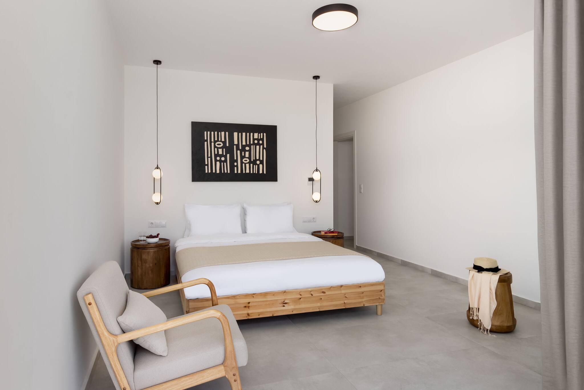 Upon entering Villa Todd, you come into the hallway which separates the accommodation into two wings left and right. Each wing of Villa Todd is equipped with a large double bedroom and the convenience of an ensuite bathroom with shower. The bedrooms have window panel doors filling the space with natural light but also offering direct access to the private pool area. Separating and in-between the two bedrooms is the fully equipped kitchen which also offers pool views and the accessibility to the private outdoor area.