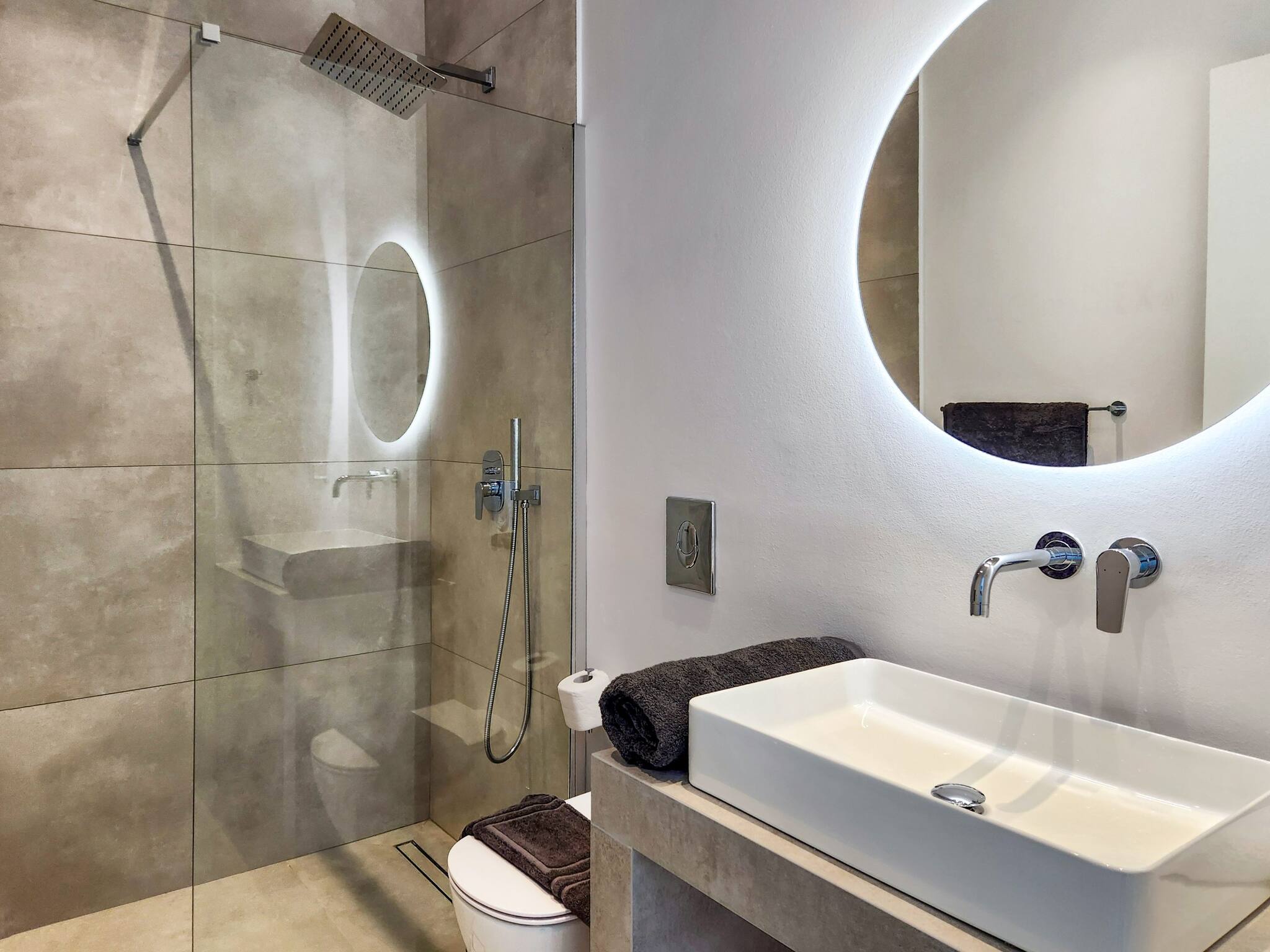 Also on this level through the ground floor hallway are two double bedrooms with en-suite bathrooms. The bedrooms offer every comfort for guests as well as the convenience of direct access to the outdoor area.