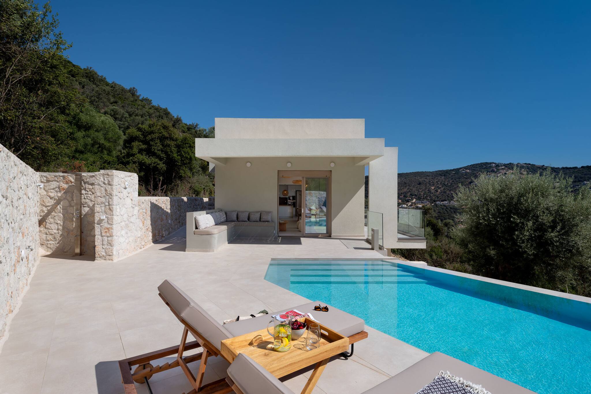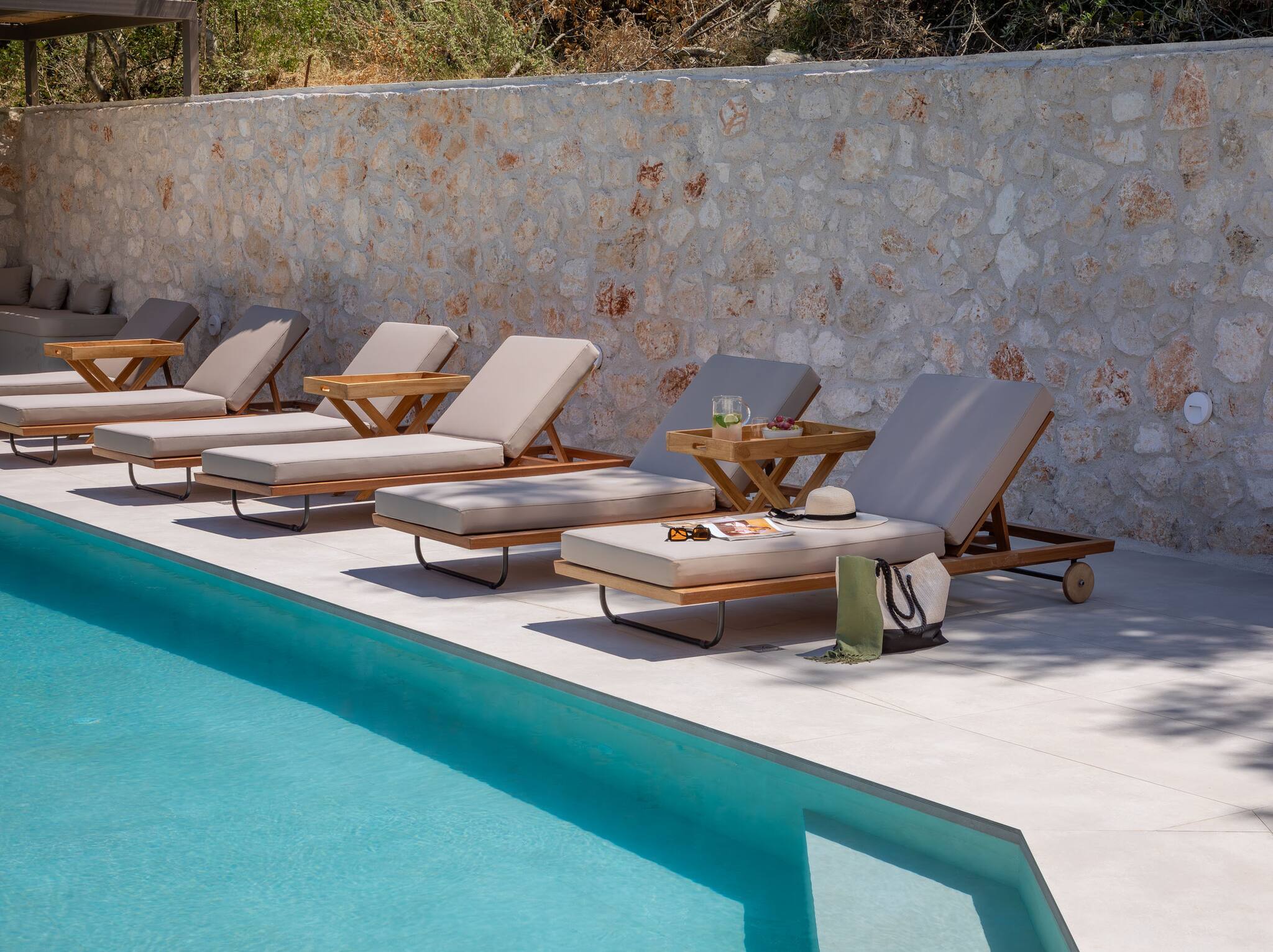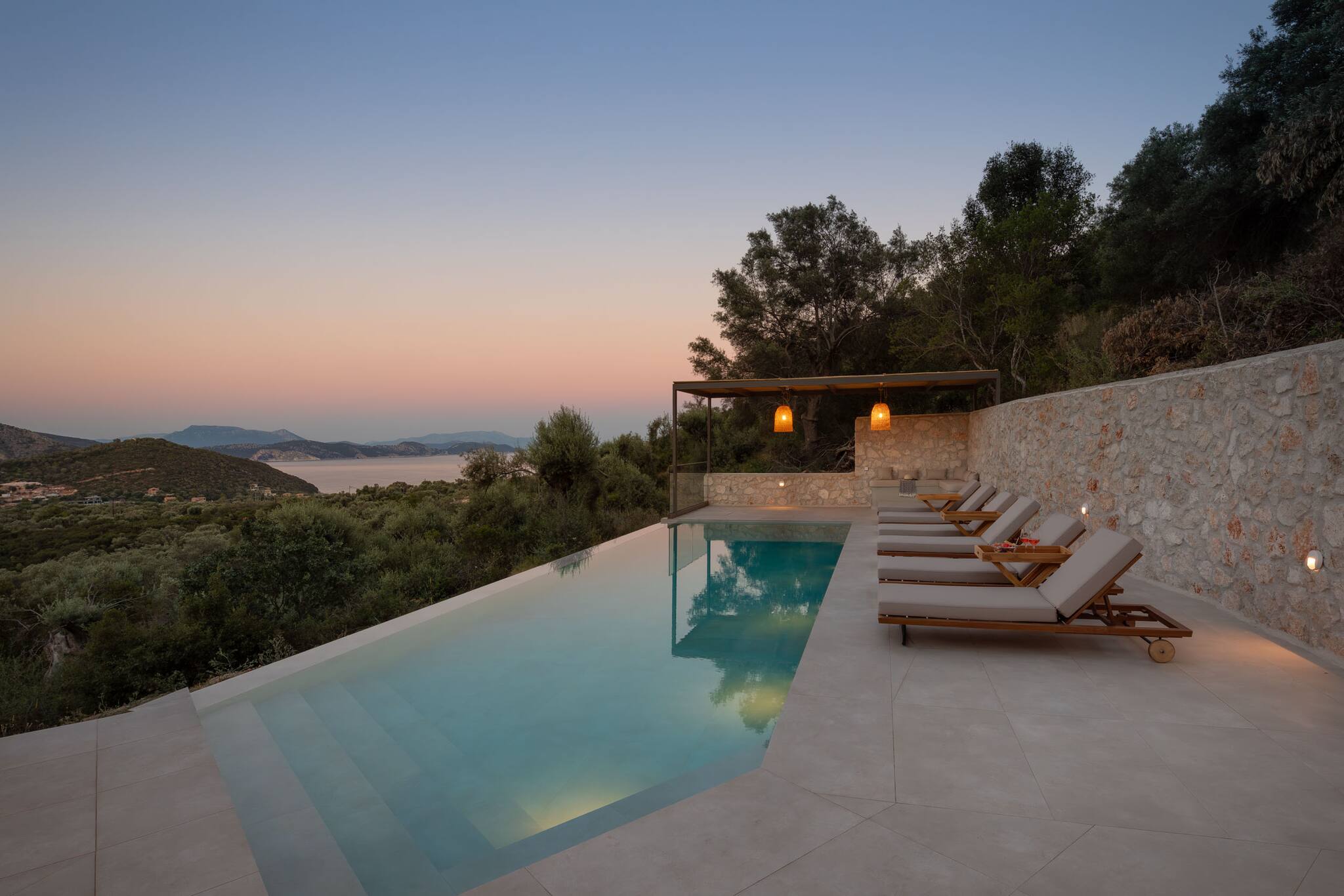 Villa Eptanisa in Sivota Lefkada boasts an outdoor barefoot luxury experience. The uniquely shaped private pool is furnished with sun loungers that will offer an irresistible temptation to lounge around all day soaking up the Greek summer sun, or seeking shade for a Greek afternoon siesta under its bamboo pergola.