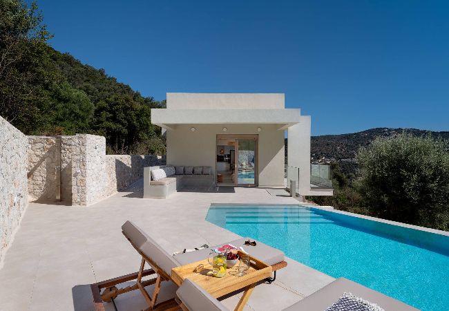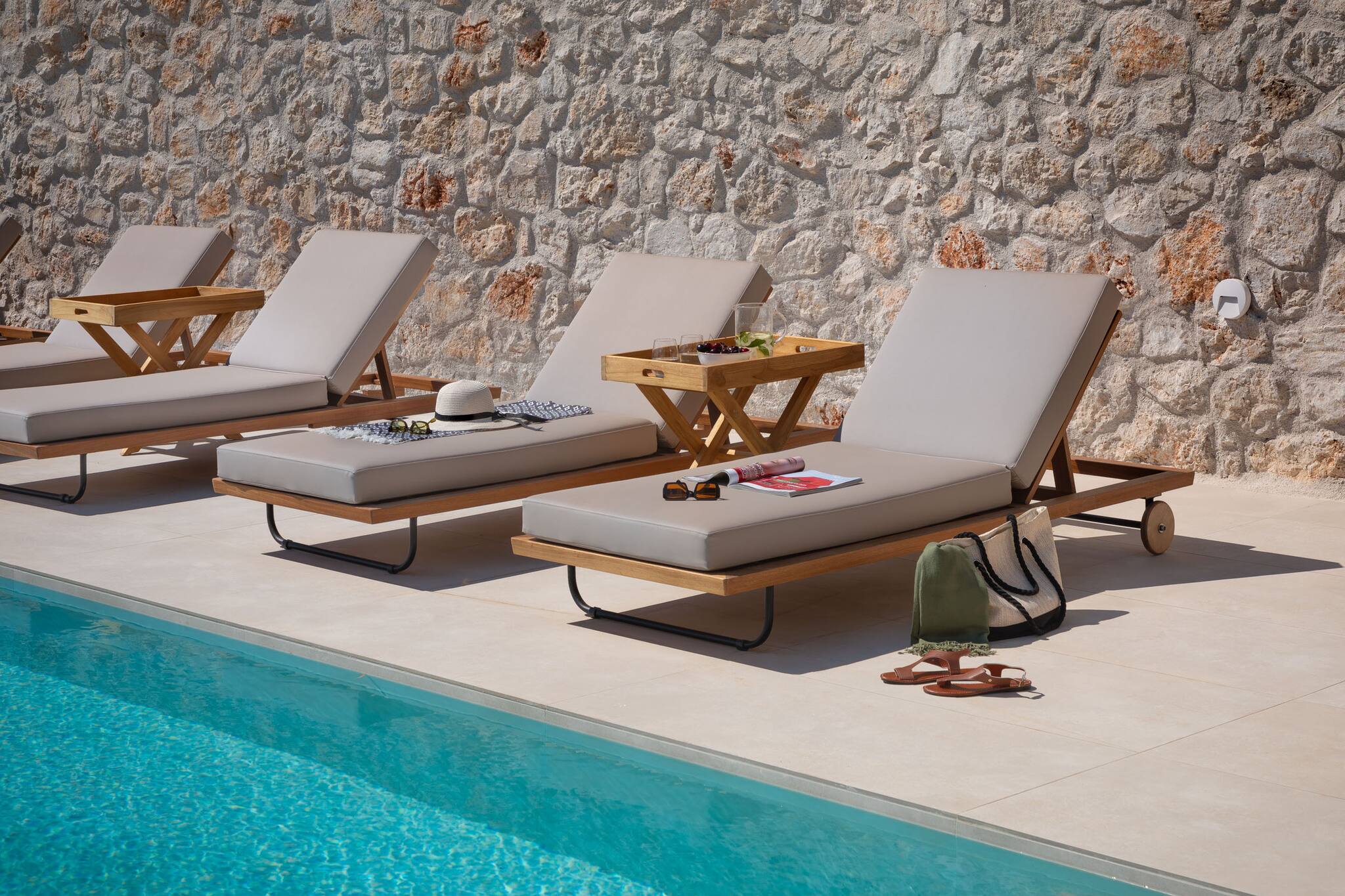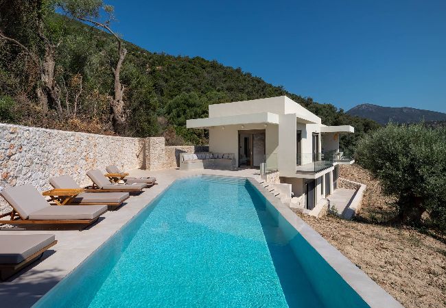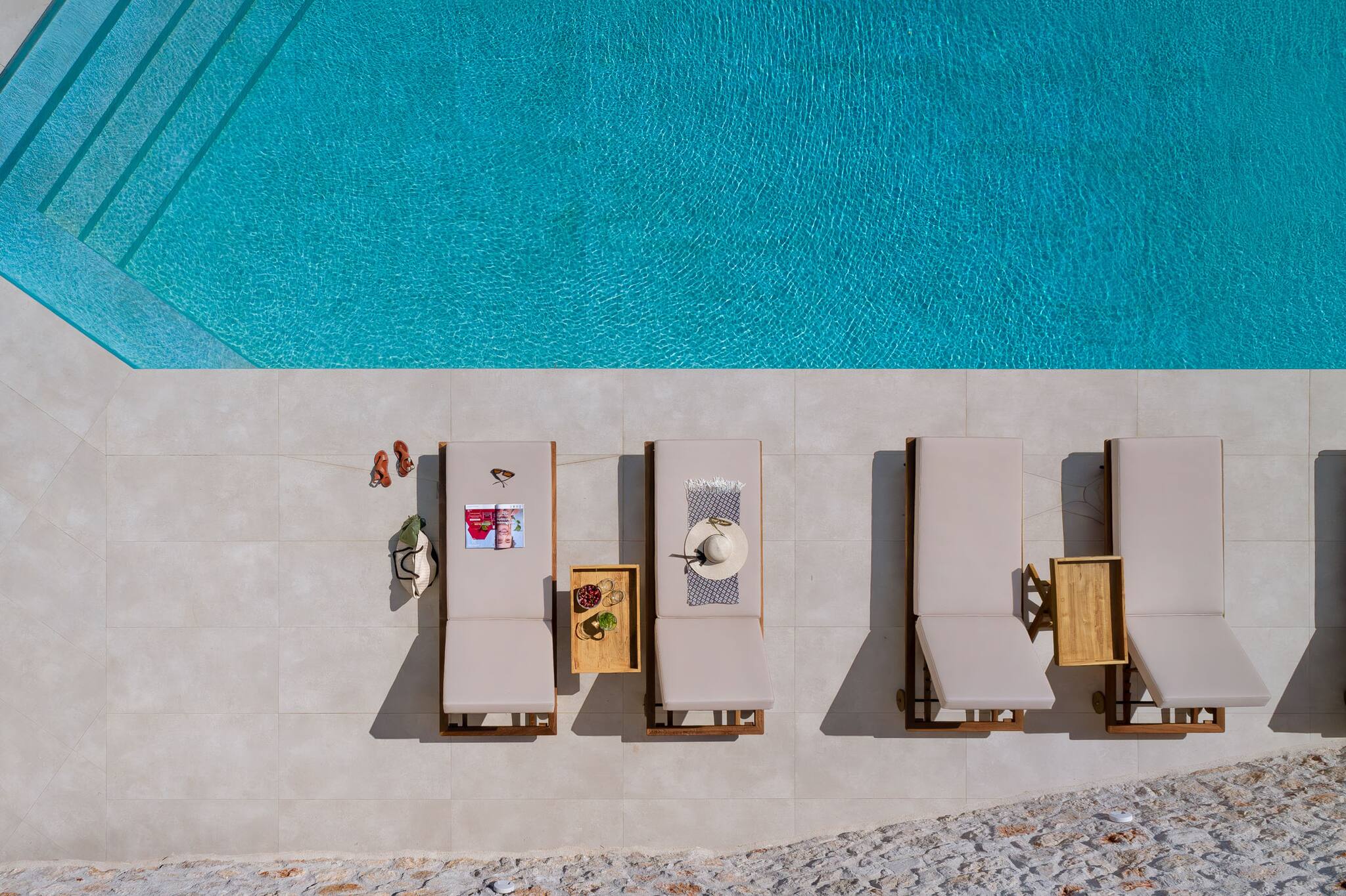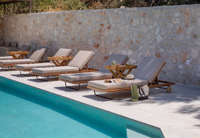 Villa Eptanisa in Sivota Lefkada boasts an outdoor barefoot luxury experience. The uniquely shaped private pool is furnished with sun loungers that will offer an irresistible temptation to lounge around all day soaking up the Greek summer sun, or seeking shade for a Greek afternoon siesta under its bamboo pergola.