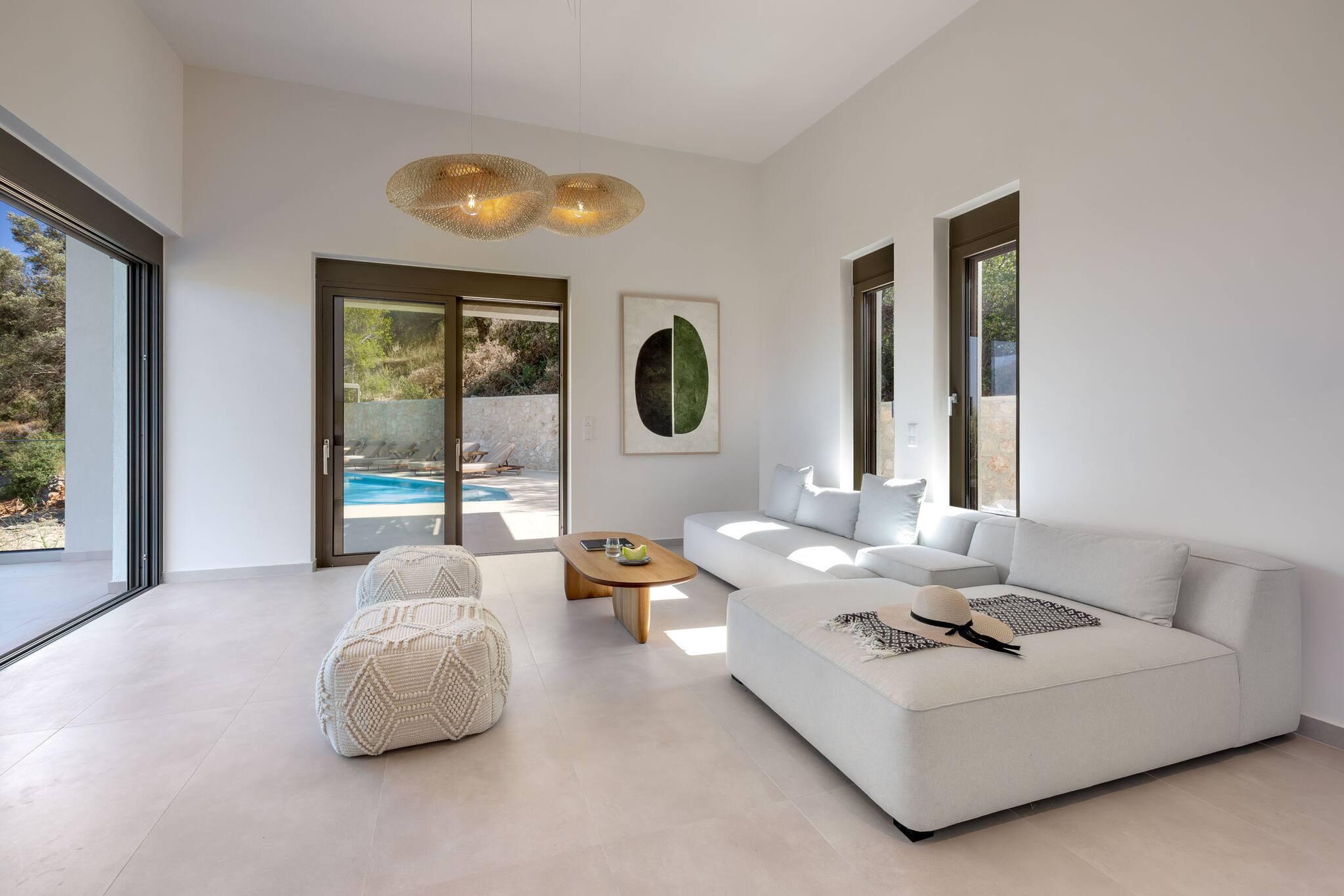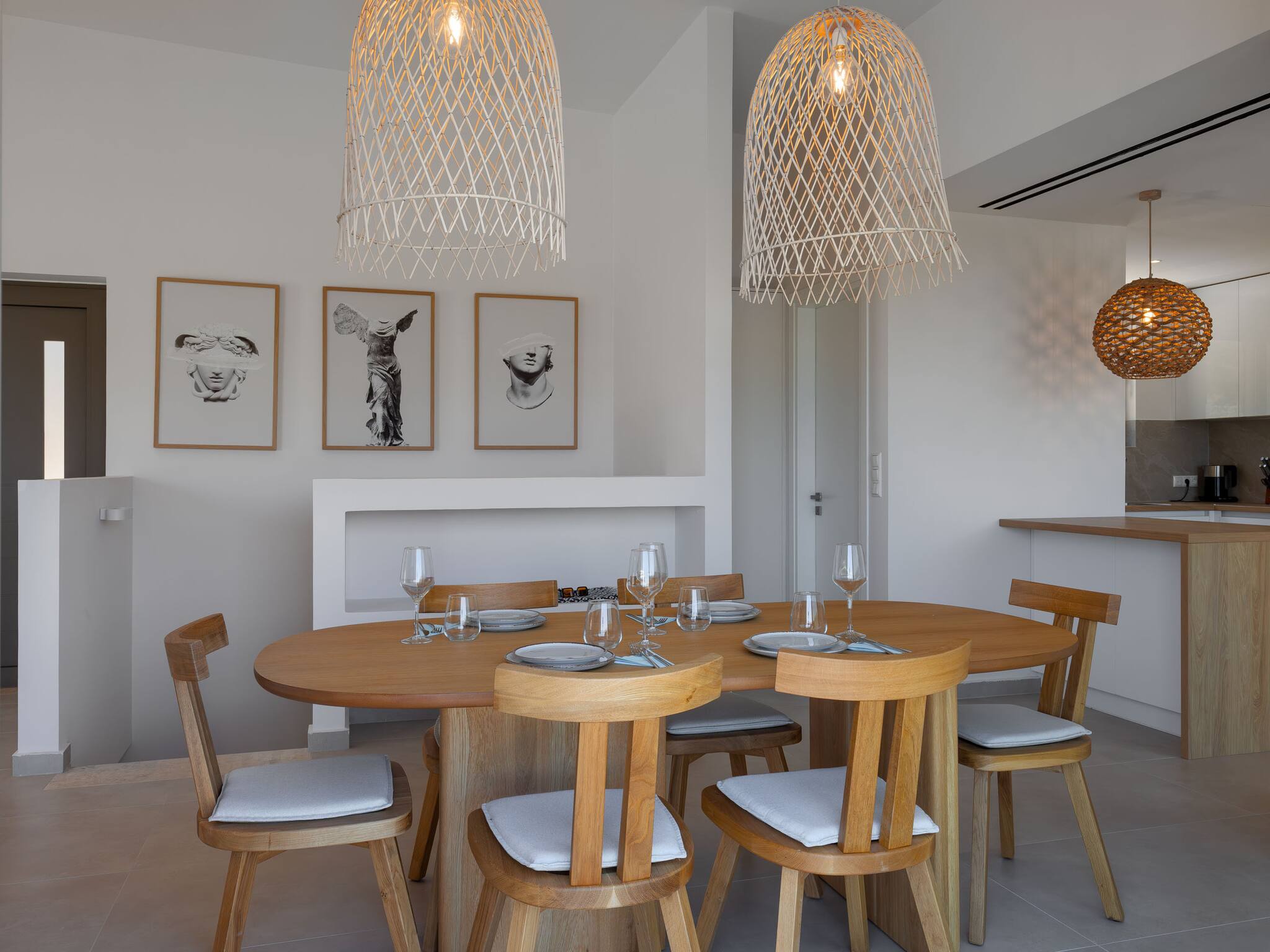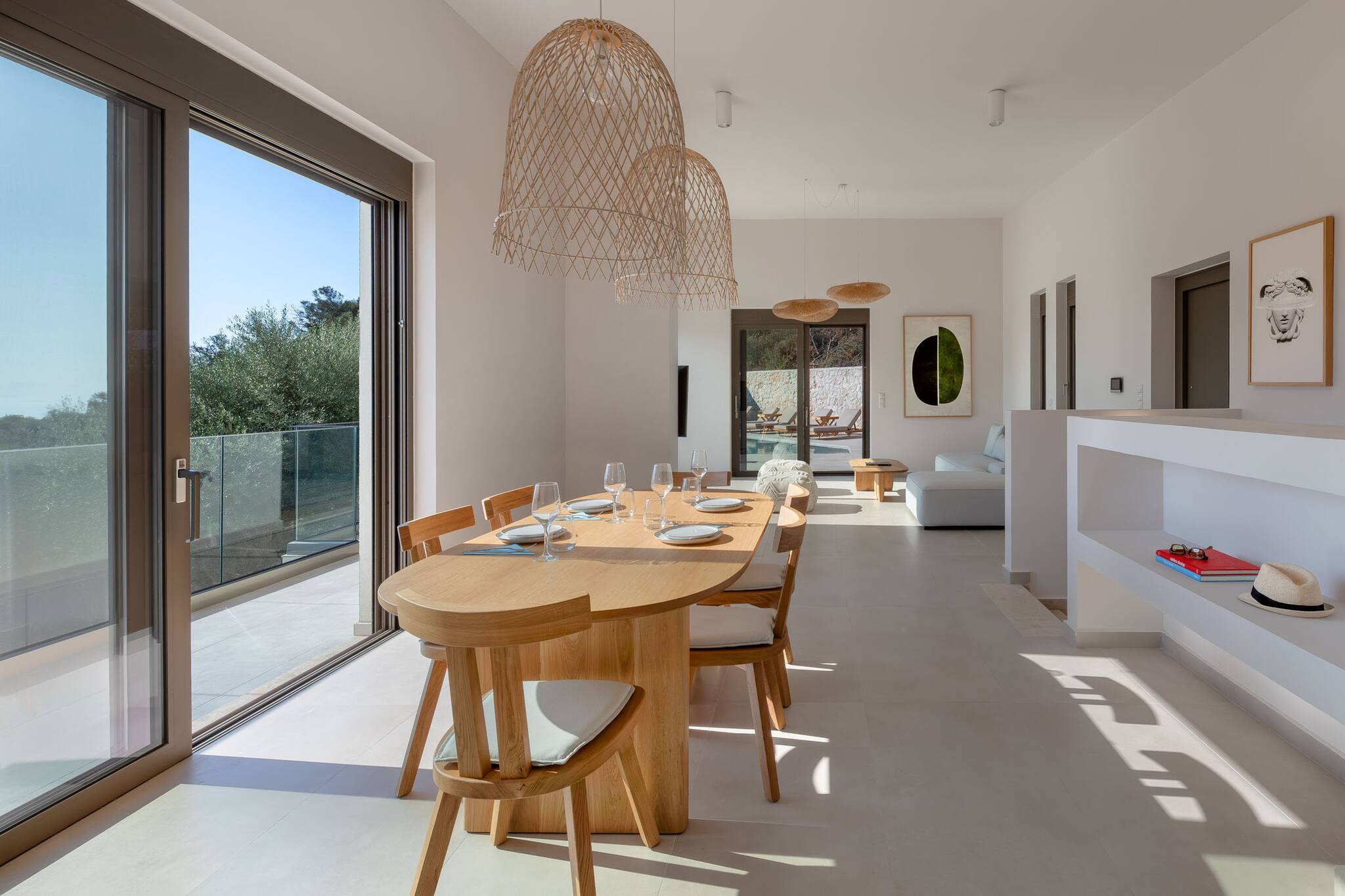 Upon entering Villa Eptanisa, you come into the large living space which will take you away with its indoor-outdoor synergy created from the floor-to-ceiling window sliding doors. The space in front of you consists of a spacious lounge and dining setting with selective art pieces that add to the unique character of Villa Eptanisa. On the far left of the space is a fully equipped kitchen with a dining island, following the local interior design of a past Greek village lifestyle. All this space has the luxury of direct access to the outdoor area of Villa Eptanisa,
