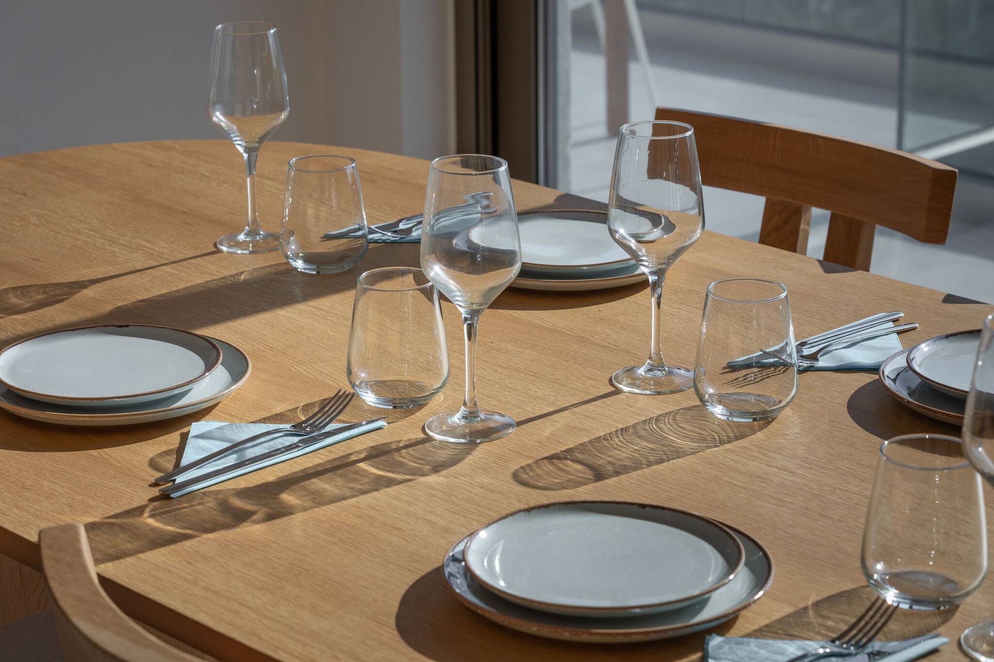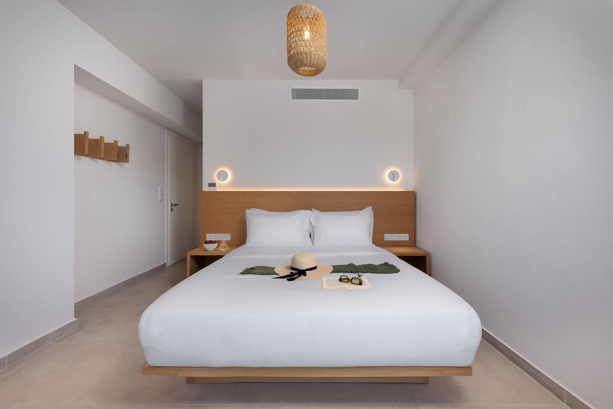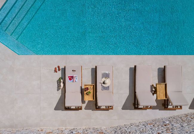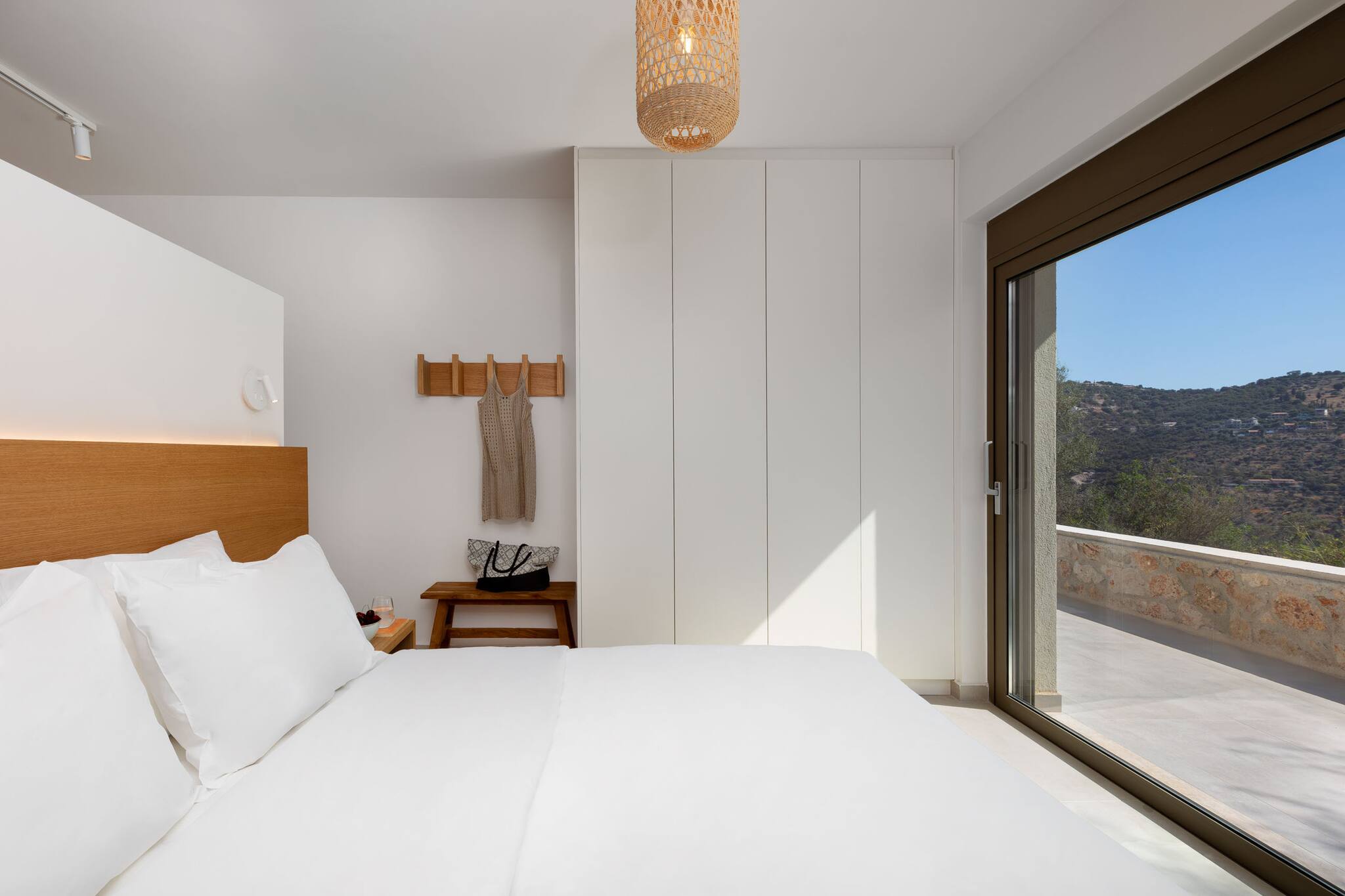 Upon entering Villa Eptanisa, you come into the large living space which will take you away with its indoor-outdoor synergy created from the floor-to-ceiling window sliding doors. The space in front of you consists of a spacious lounge and dining setting with selective art pieces that add to the unique character of Villa Eptanisa. On the far left of the space is a fully equipped kitchen with a dining island, following the local interior design of a past Greek village lifestyle. All this space has the luxury of direct access to the outdoor area of Villa Eptanisa,