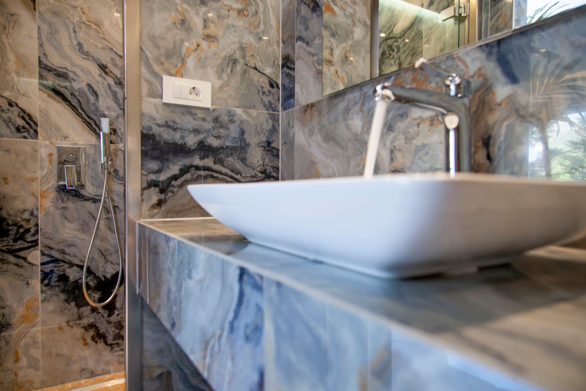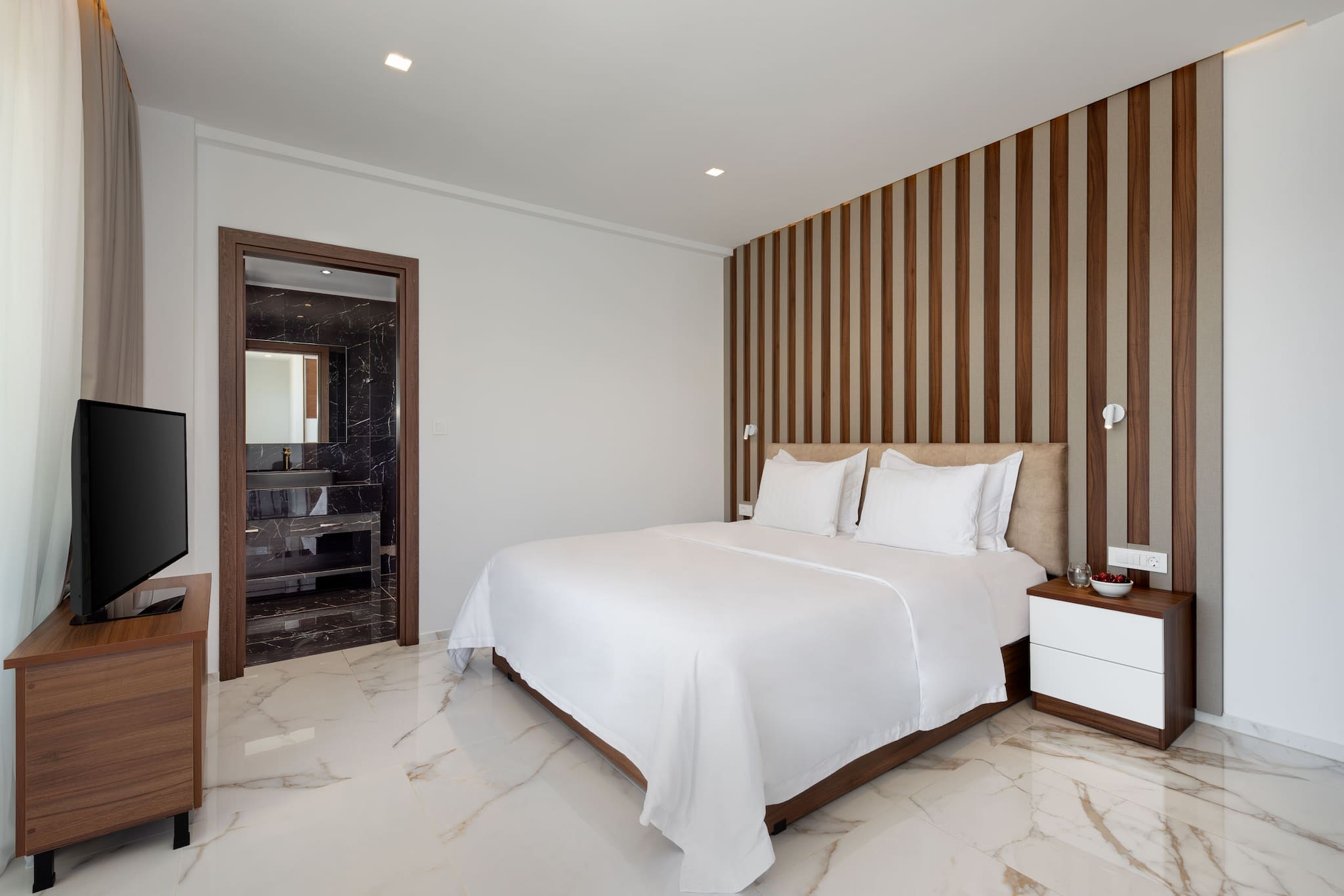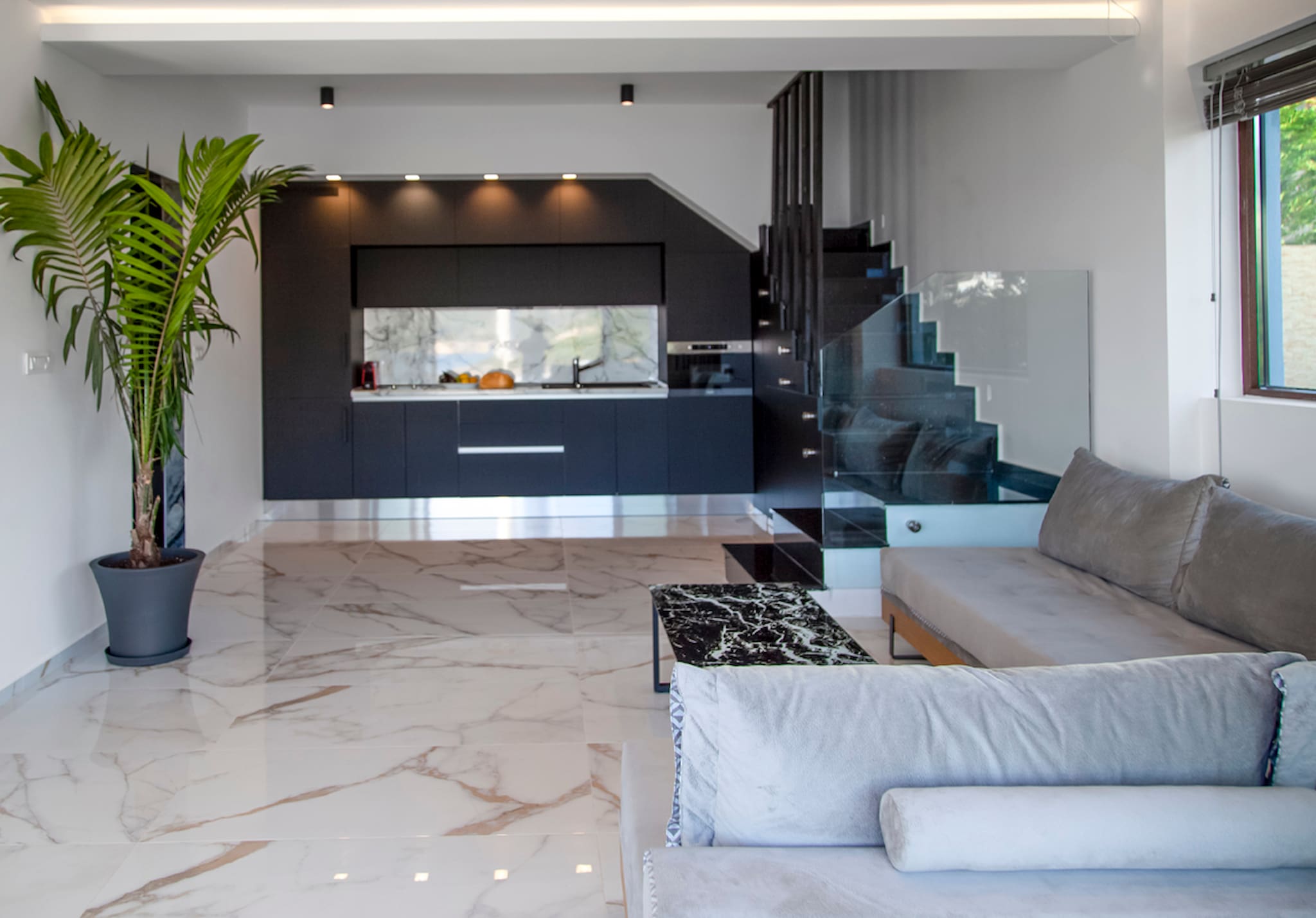 Upon entering Villa Tessera you come into a large living space that is filled with natural sunlight with its window panel doors that give you direct access to the outdoor private pool area. The ground level consists of an open plan kitchen, dining space and large lounge setting with a sleek contemporary design. The lounge also coverts into a large comfortable double sofa bed. Additionally, there is a bathroom on this level.