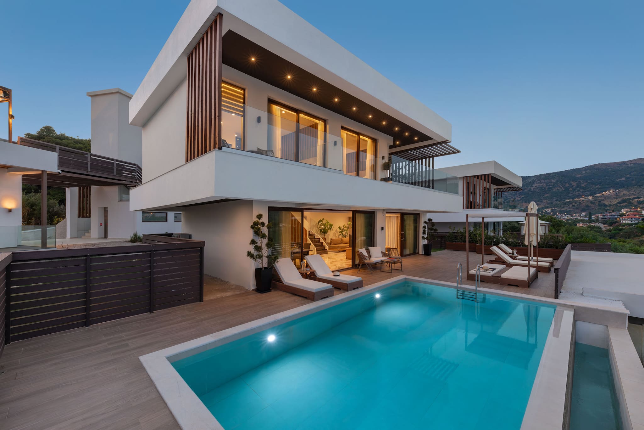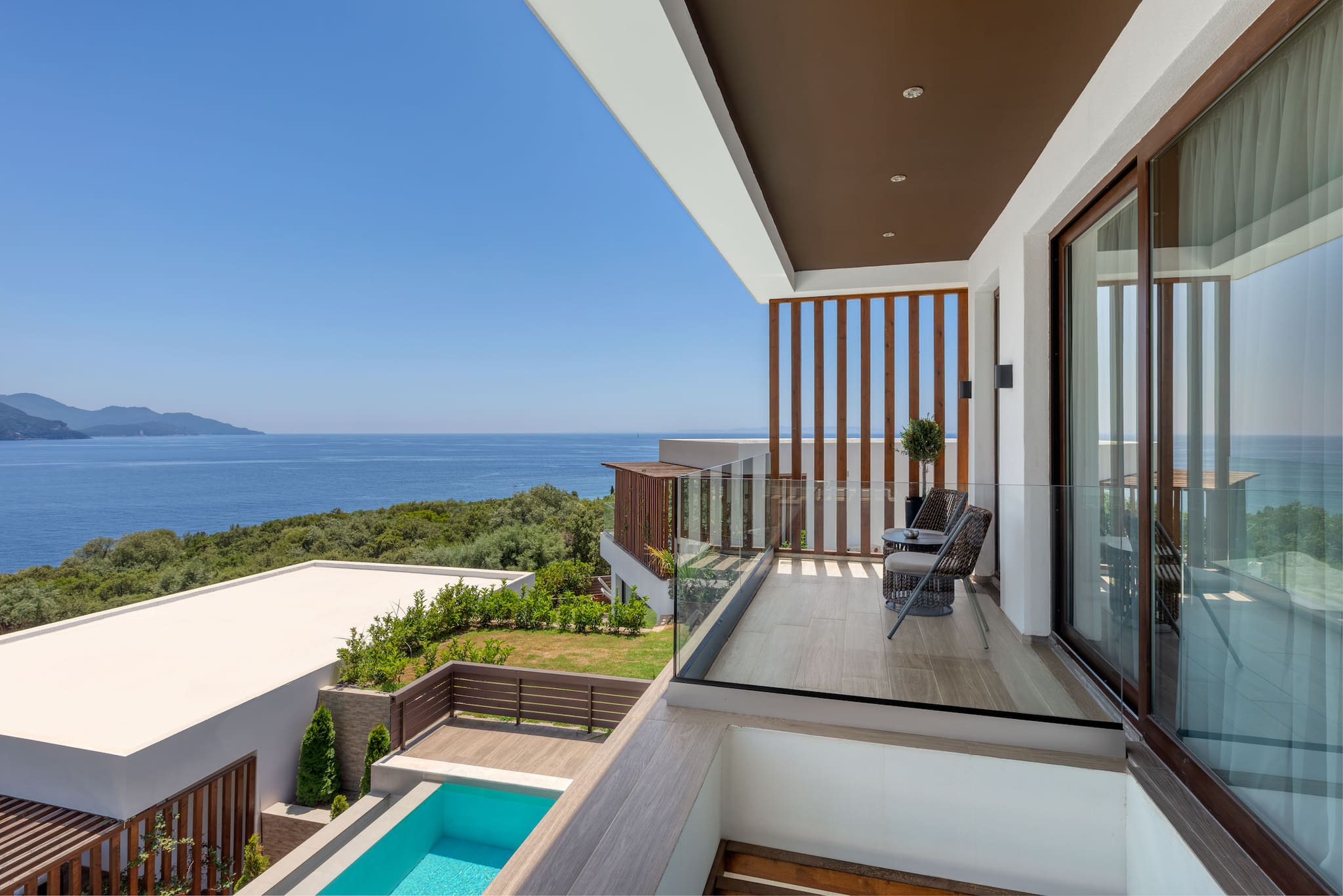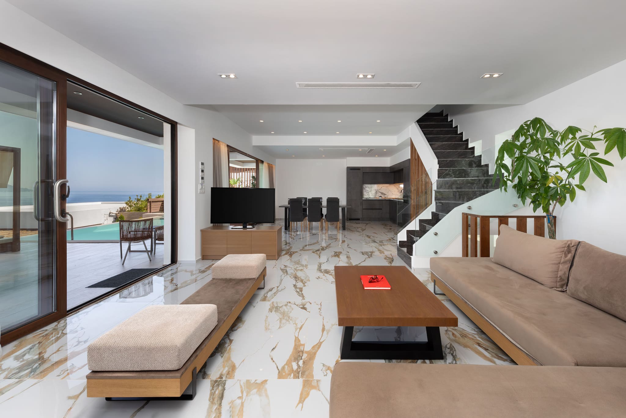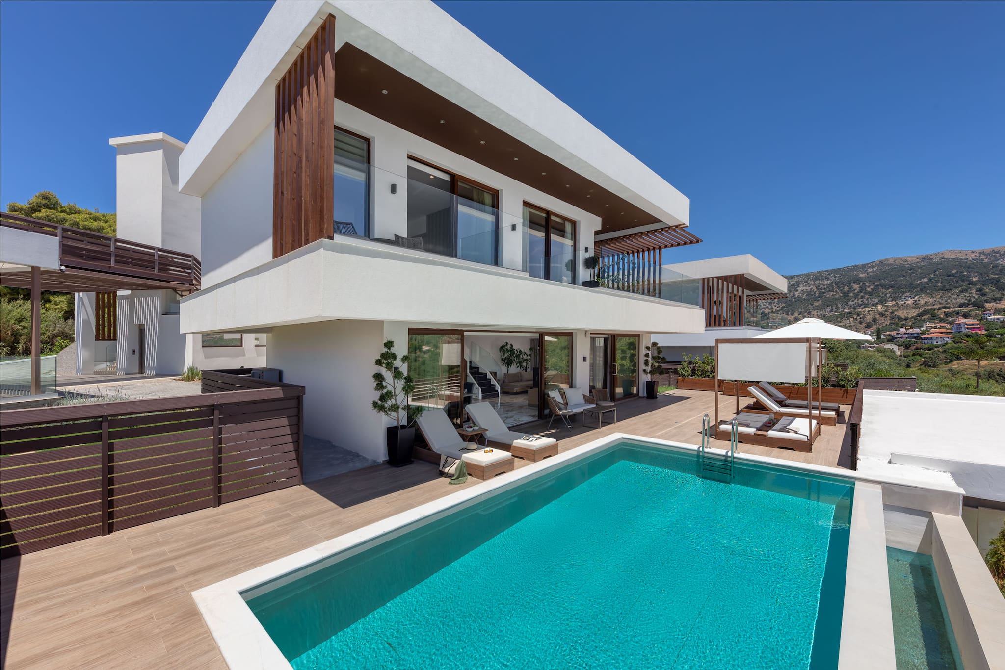 The sleek contemporary design of Villa Tria makes the most of its panoramic position perched up on the mountainside of Sivota. Floor-to-ceiling of glass doors and windows, flood the interiors with natural light and views of the Ionian Archipelagos.