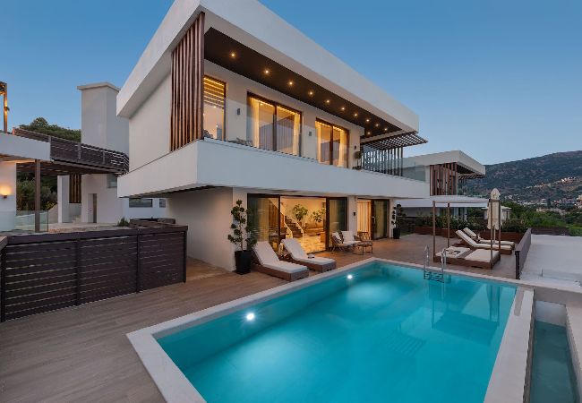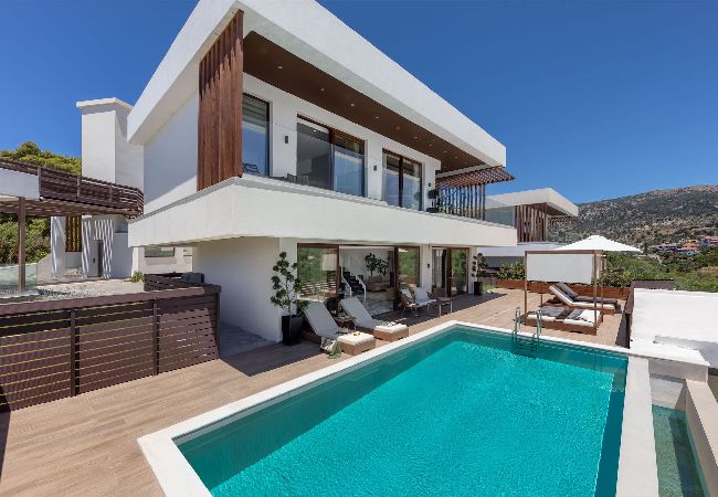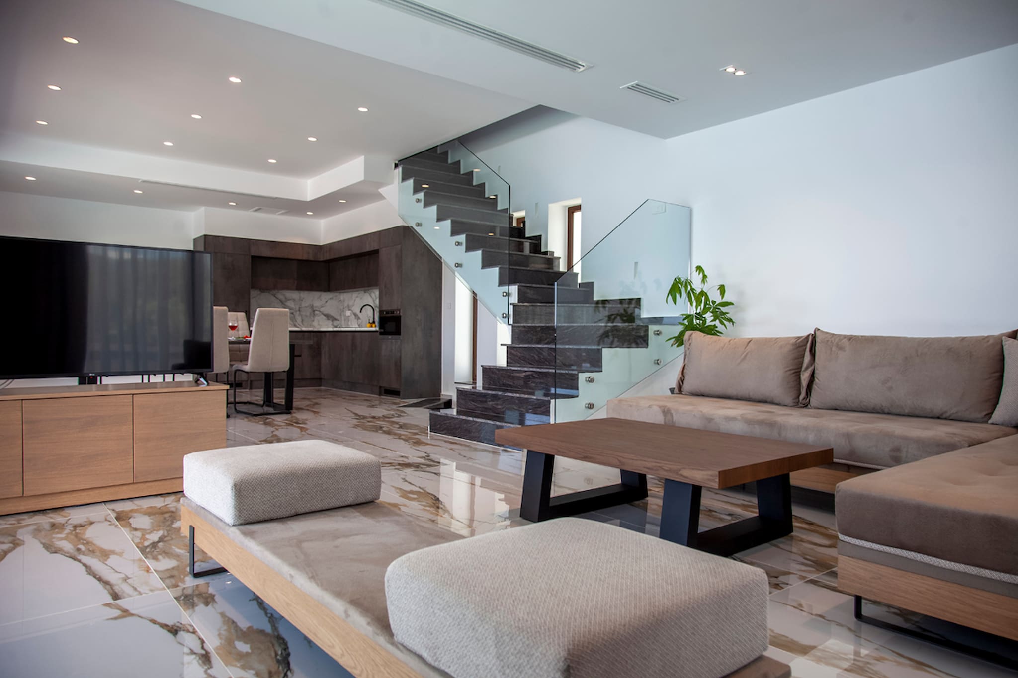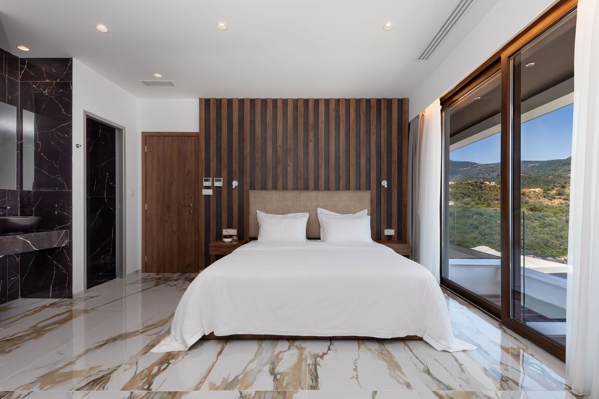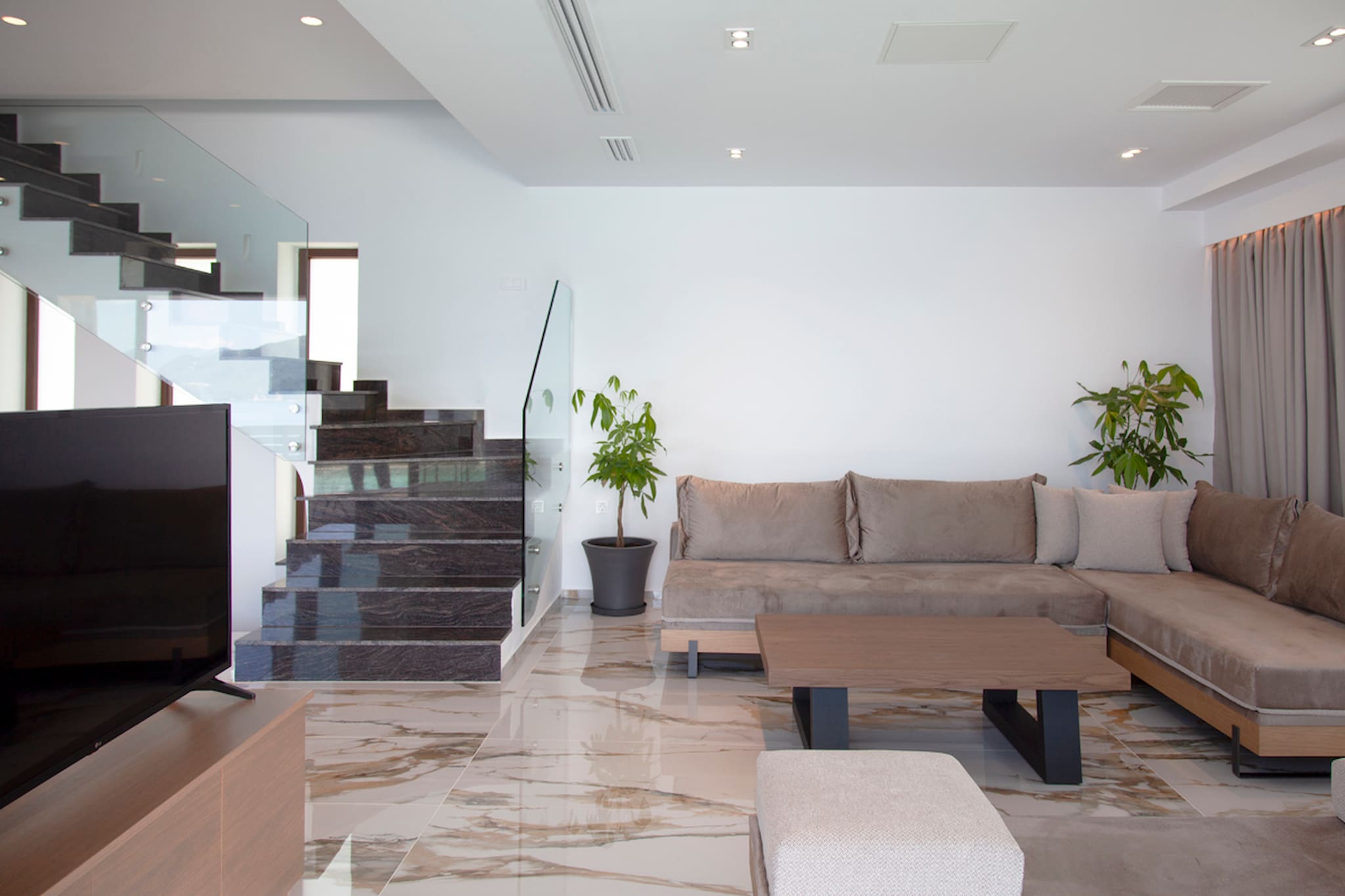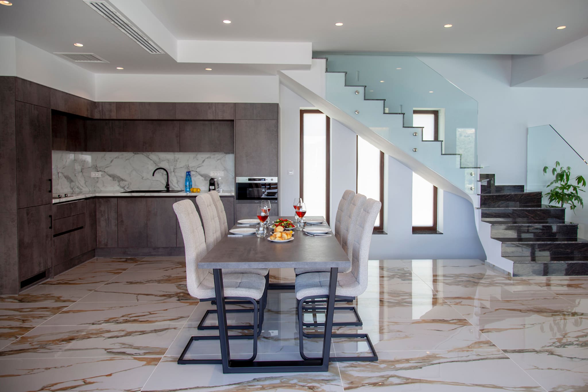The sleek contemporary design of Villa Tria makes the most of its panoramic position perched up on the mountainside of Sivota. Floor-to-ceiling of glass doors and windows, flood the interiors with natural light and views of the Ionian Archipelagos.