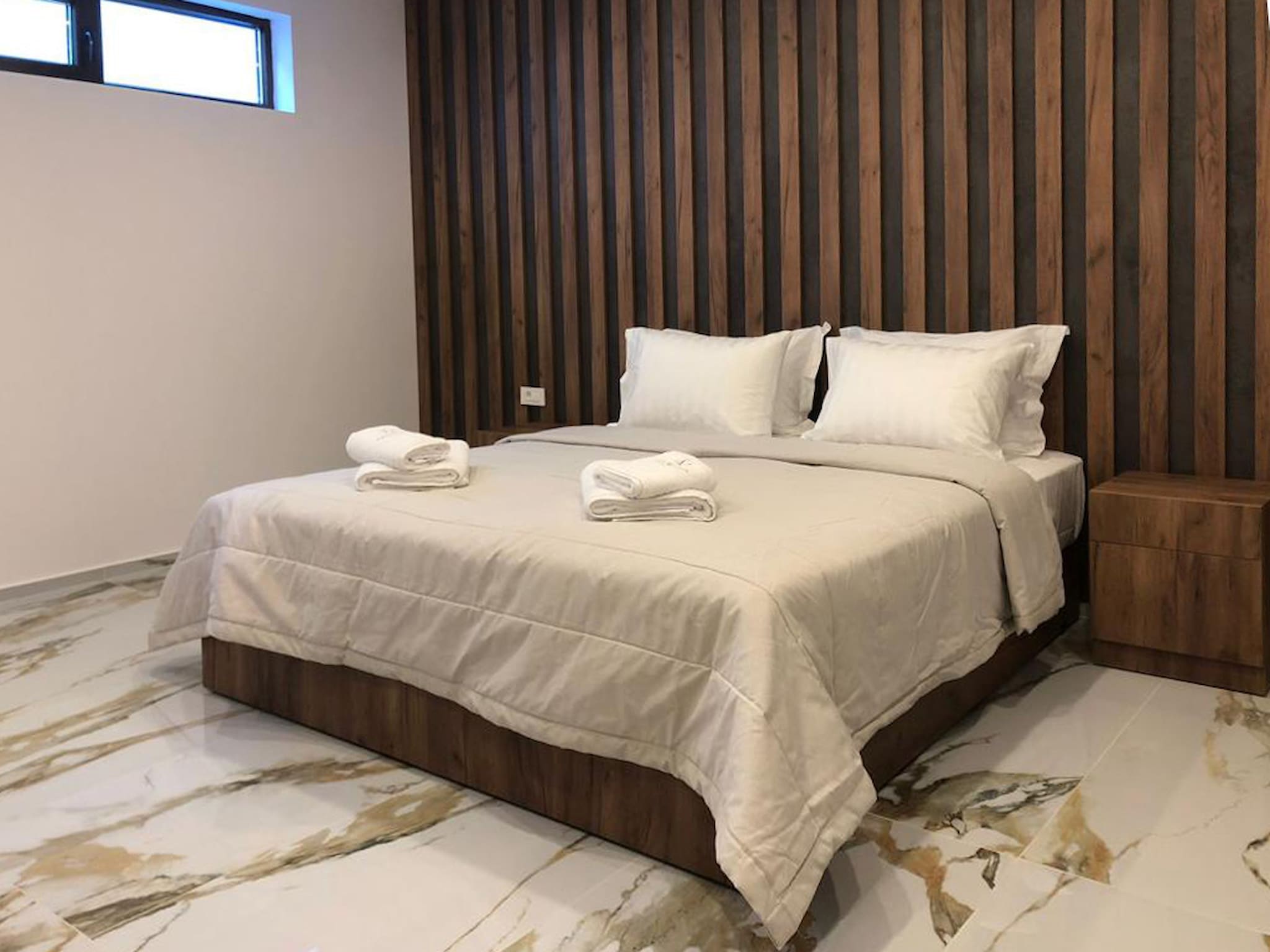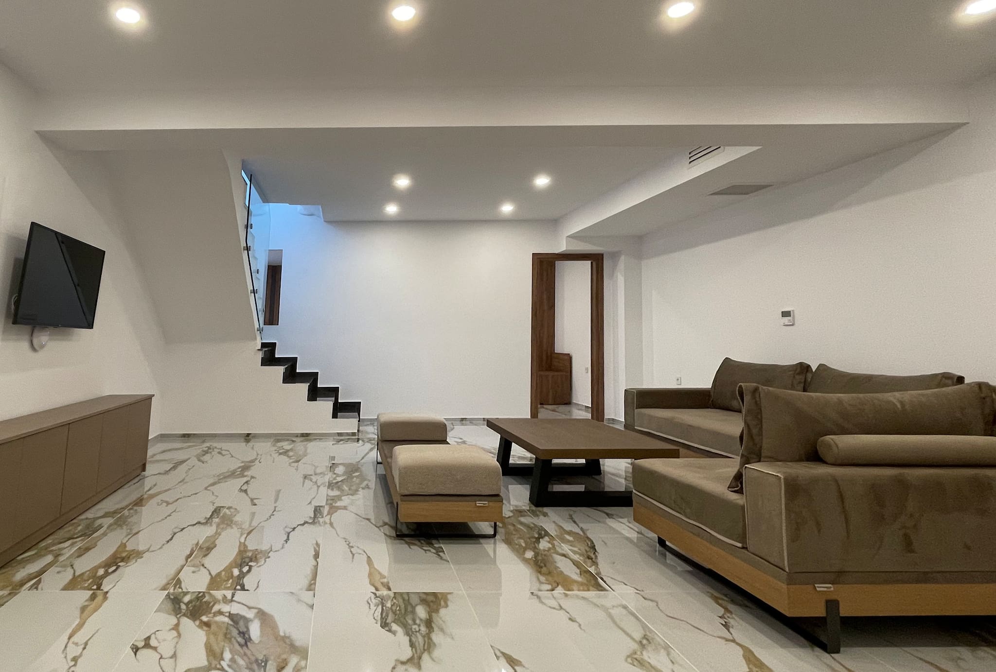 Upon entering Villa Tria you come into a large living space that is filled with natural sunlight with its window panel doors that give you direct access to the outdoor private pool area. The ground level consists of a kitchen, dining space and large lounge setting with a sleek contemporary design. The lounge also coverts into a large comfortable double sofa bed.