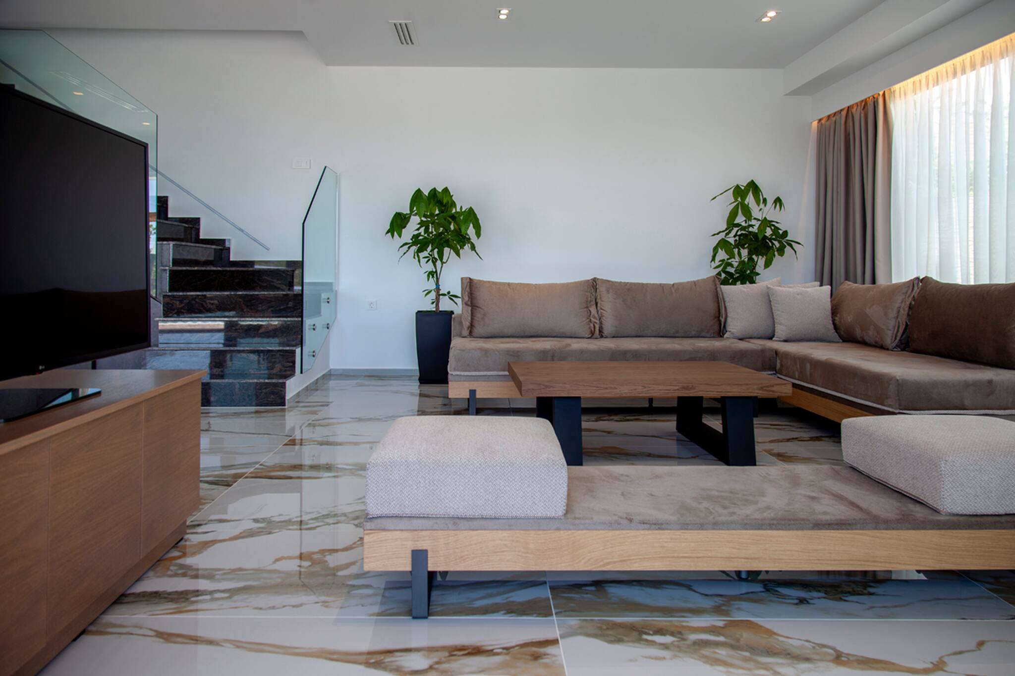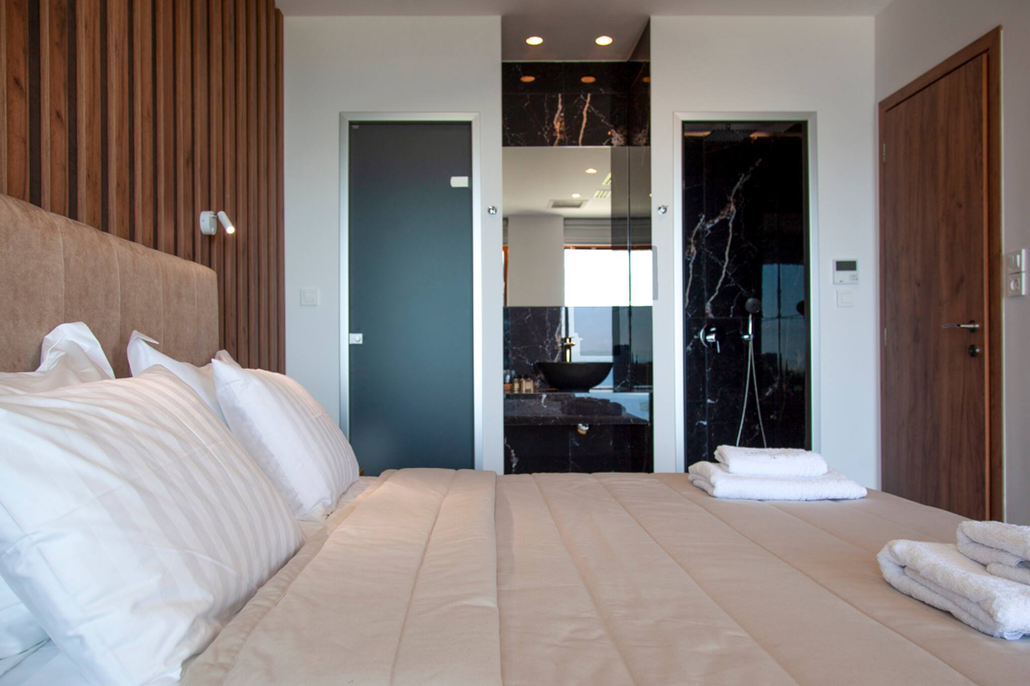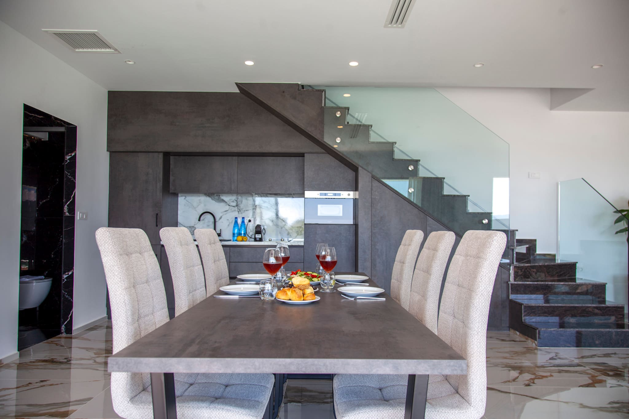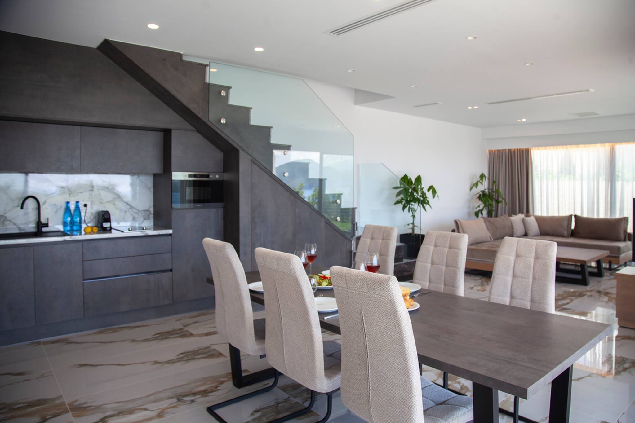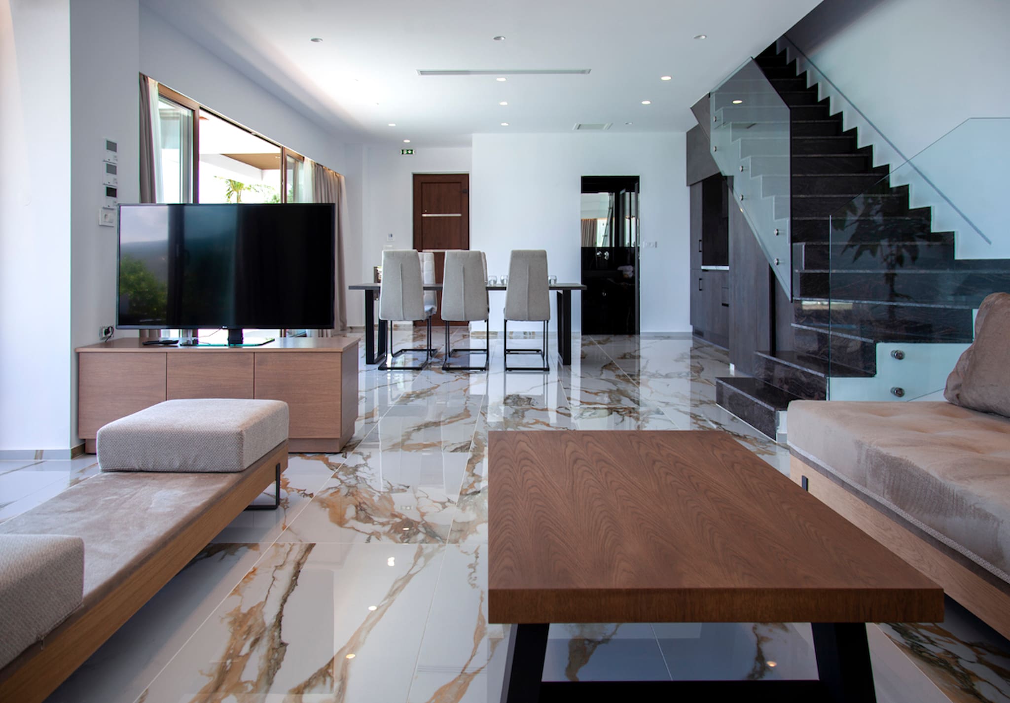 Upon entering Villa Ena you come into a large living space that is filled with natural sunlight with its window panel doors that give you direct access to the outdoor private pool area. The ground level consists of a kitchen, dining space and large lounge setting with a sleek contemporary design. The lounge also coverts into a large comfortable double sofa bed. Additionally, there is a bathroom on this level.