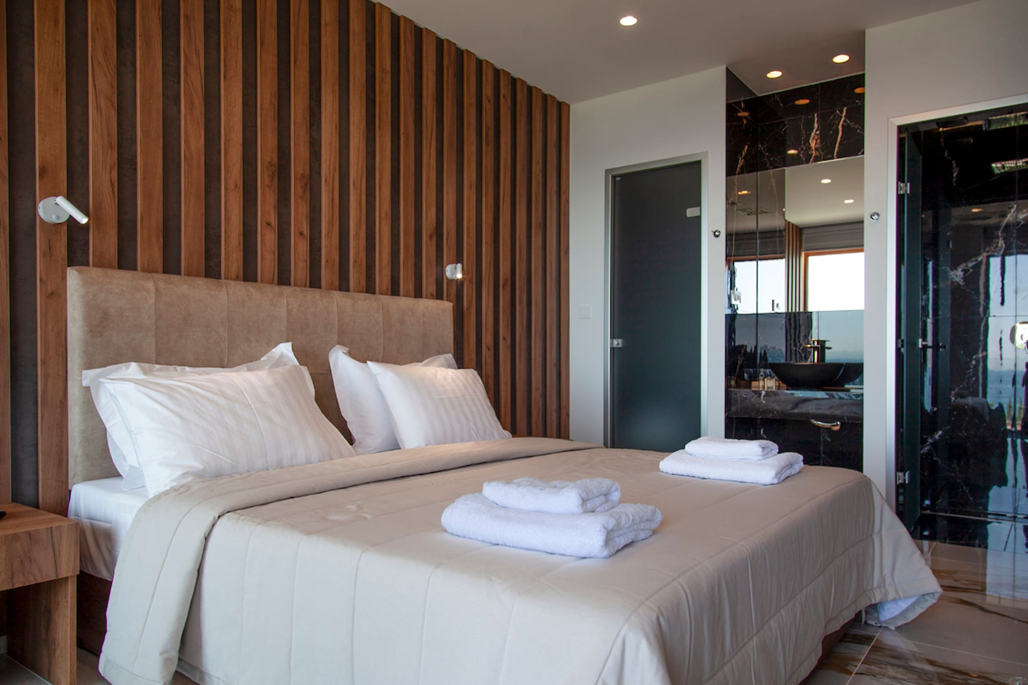 Upon entering Villa Bita, you come into a large living space that is filled with natural sunlight with its window panel doors that give you direct access to the outdoor private pool area. The ground level consists of a kitchen, dining space and large lounge setting with a sleek contemporary design. The lounge also coverts into a large comfortable double sofa bed. The first of the two bedrooms is also located on the ground level giving direct access to the outdoor area of Villa Bita. Additionally, there is a bathroom on this level.