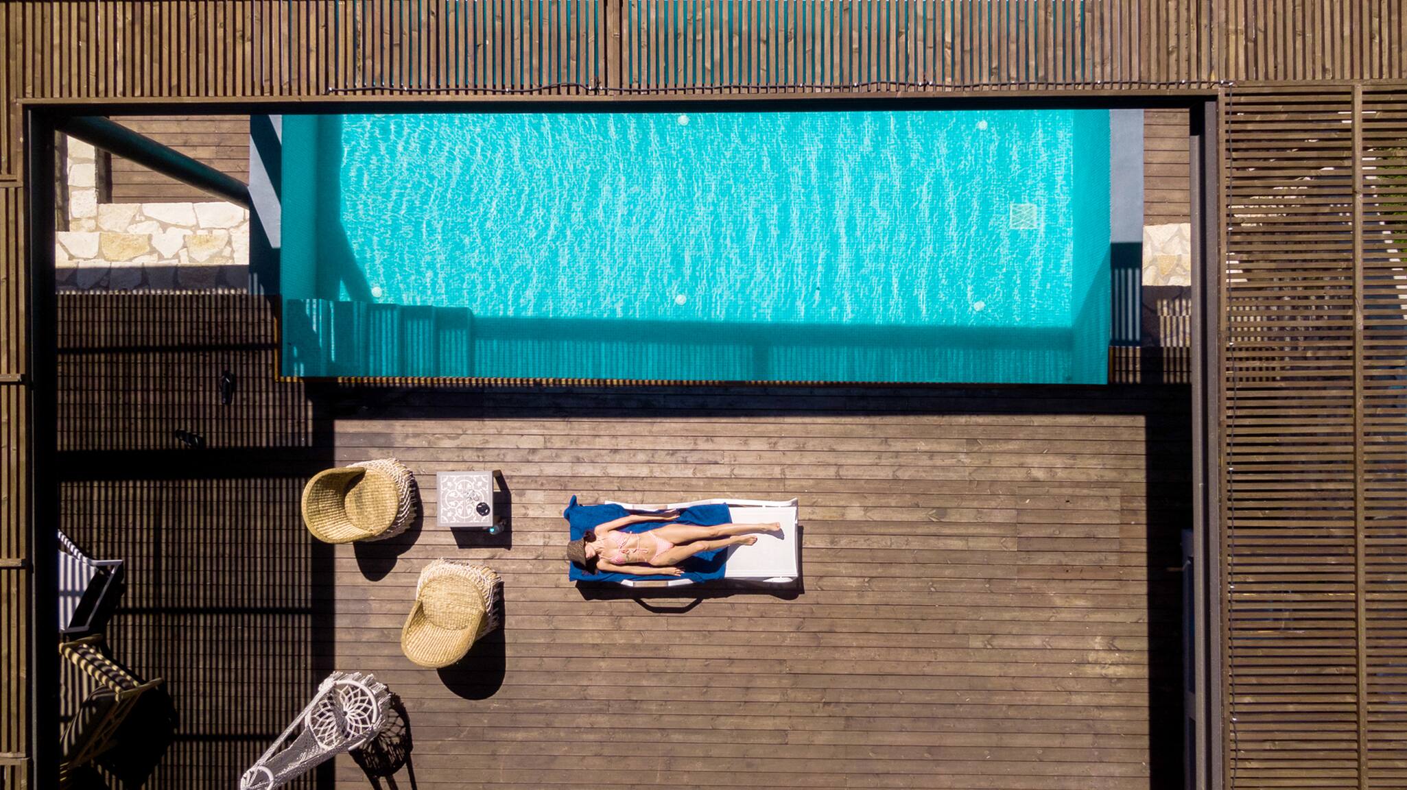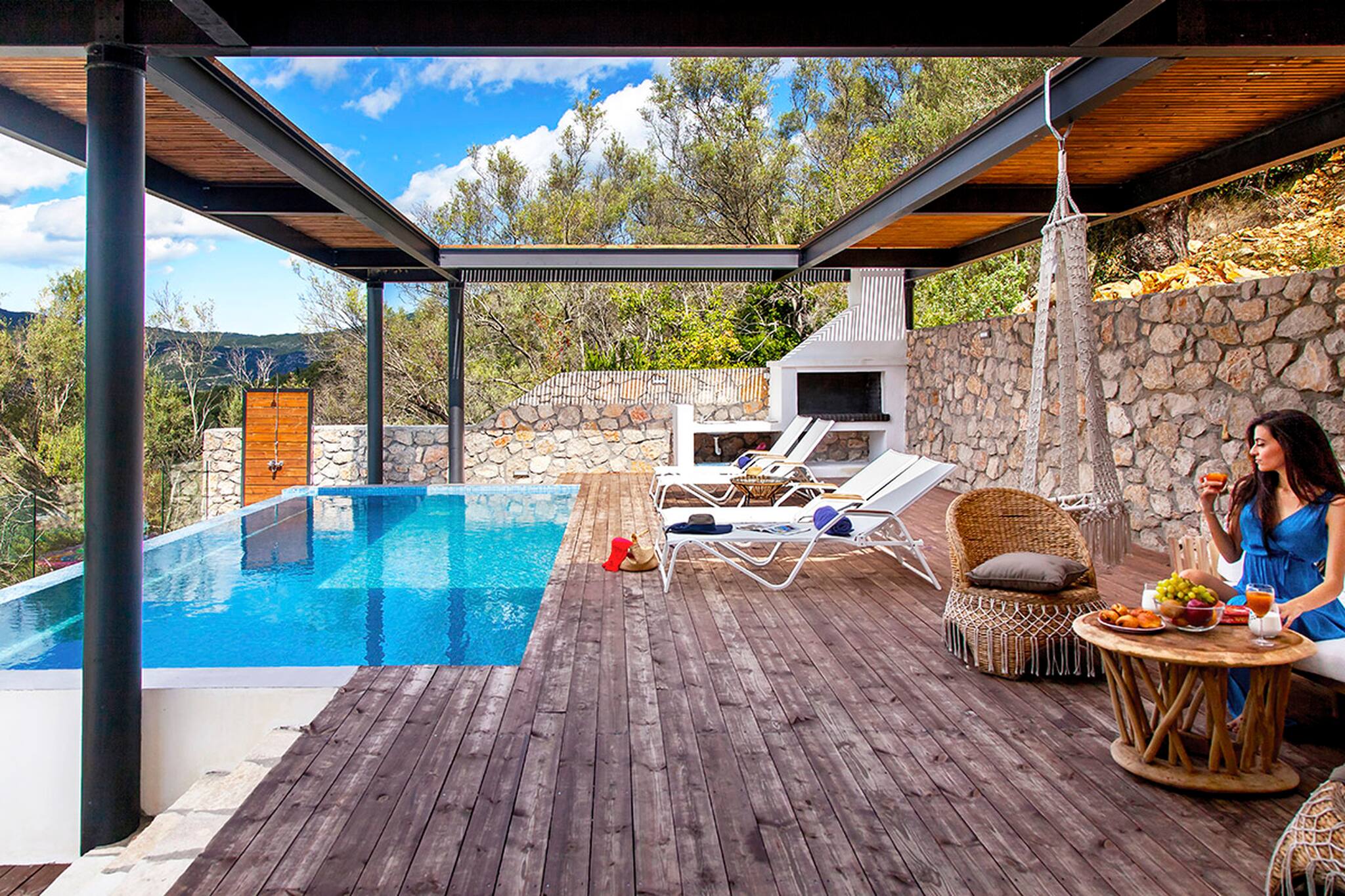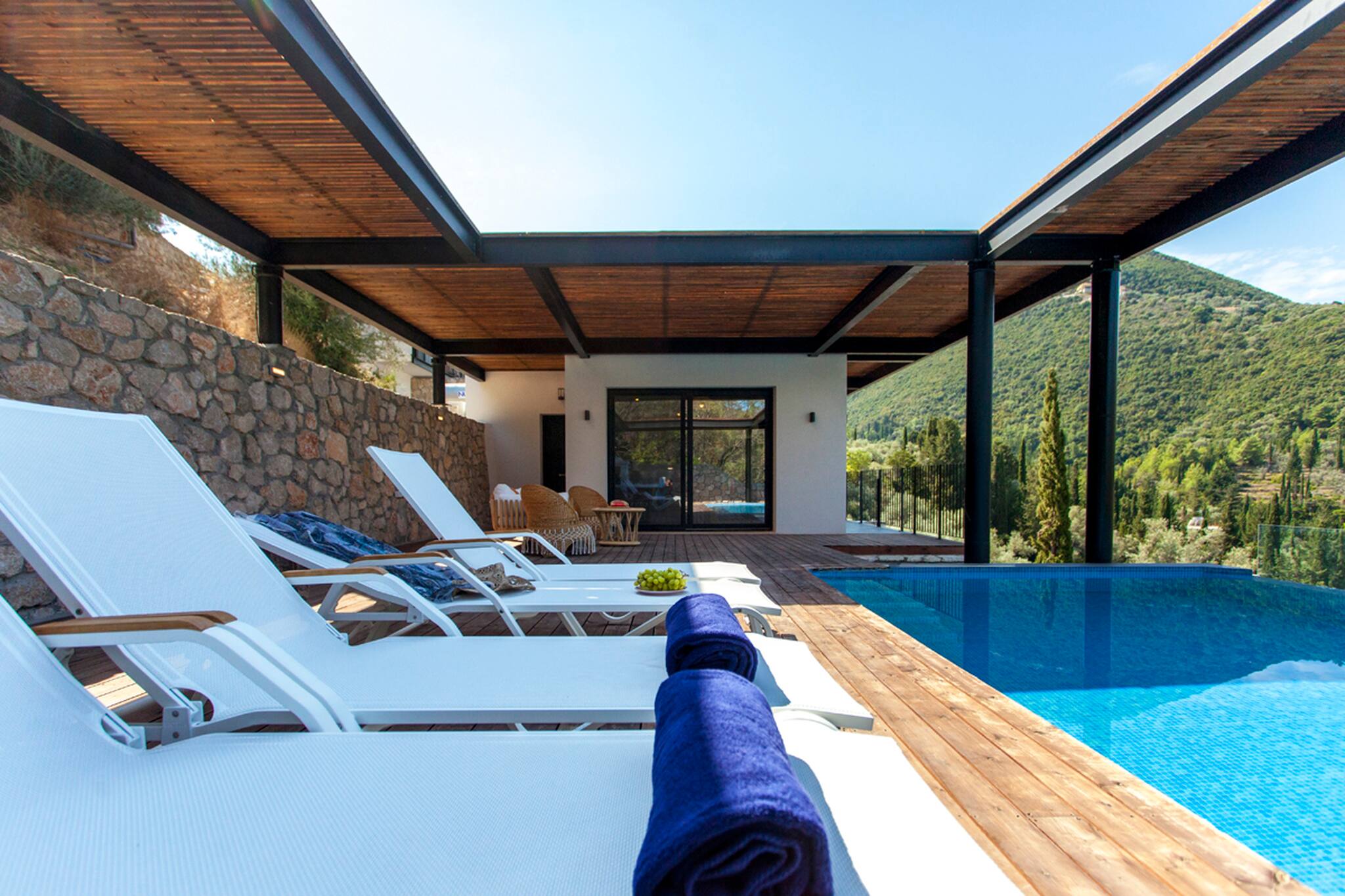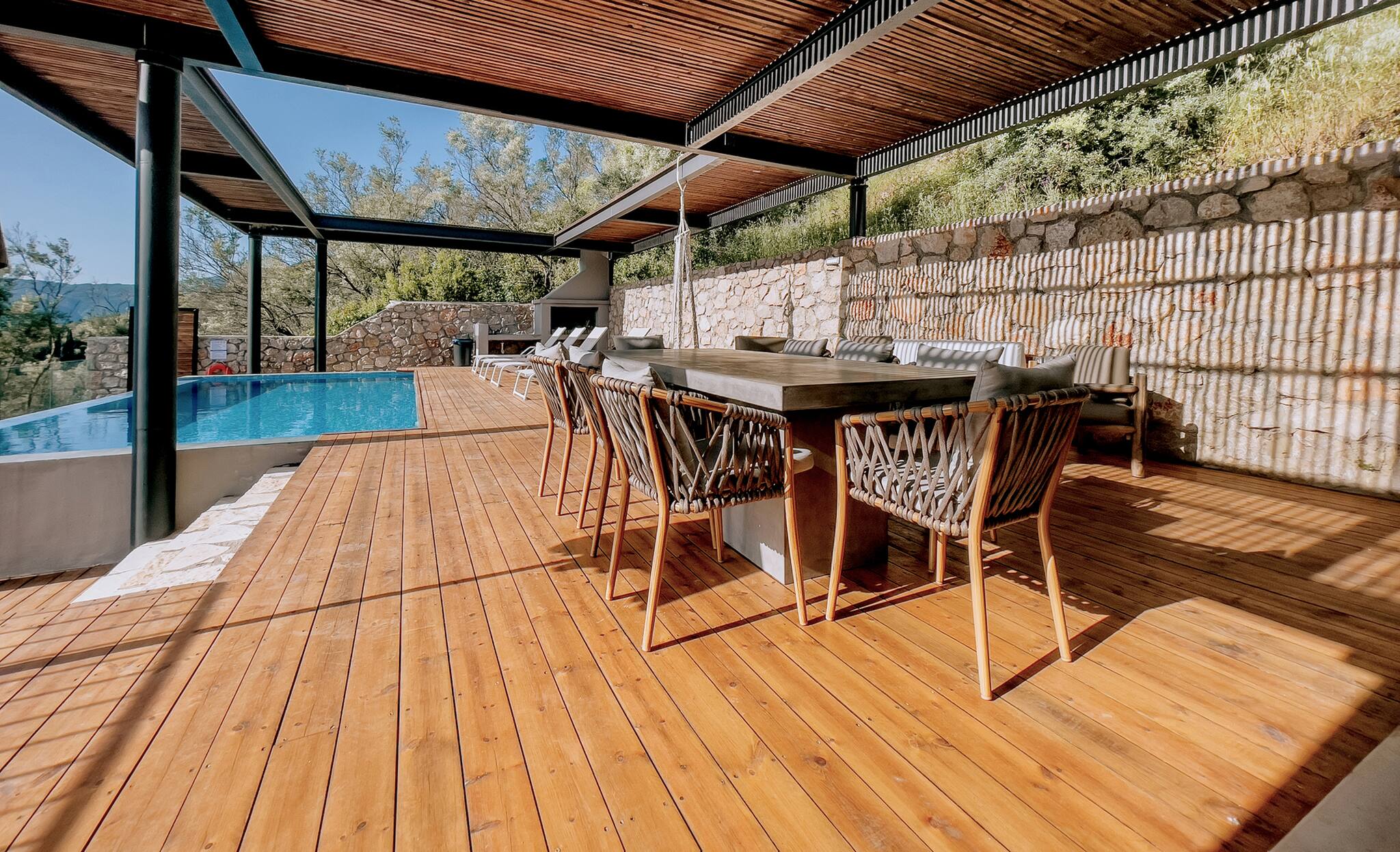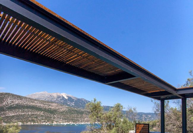 Its wooden and stone elements blend perfectly with the natural environment creating a unique setting for a true Greek Villa Holiday of relaxation and serenity